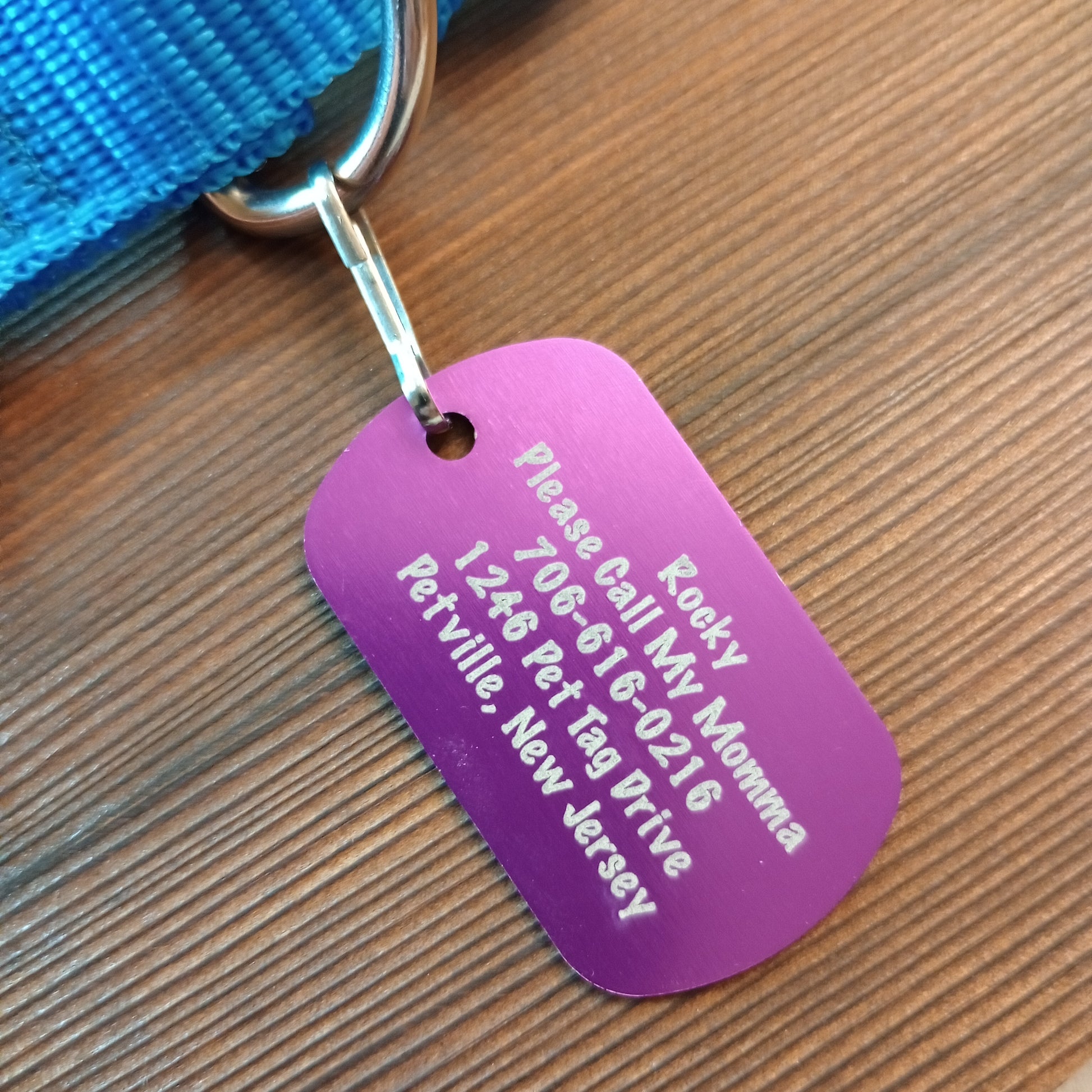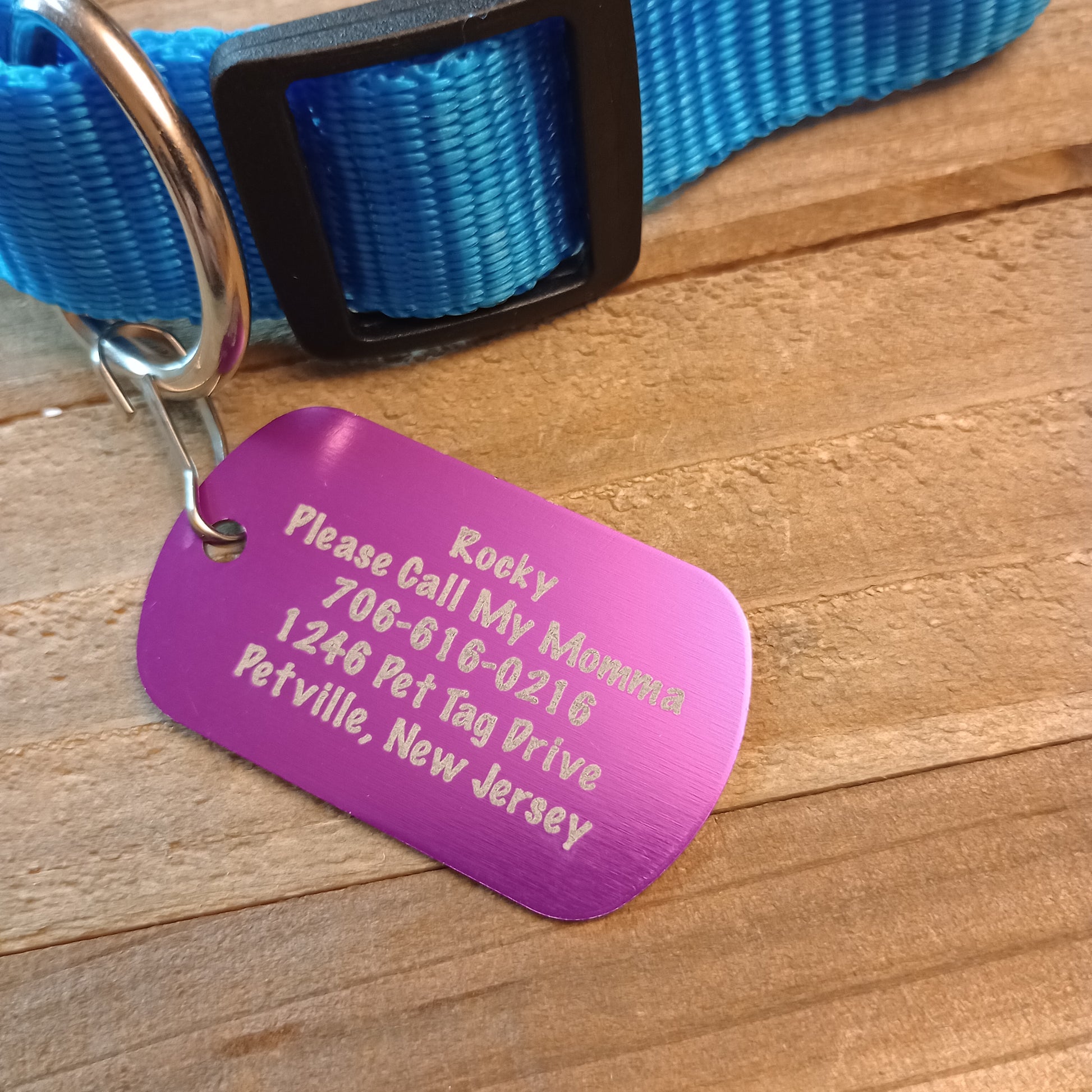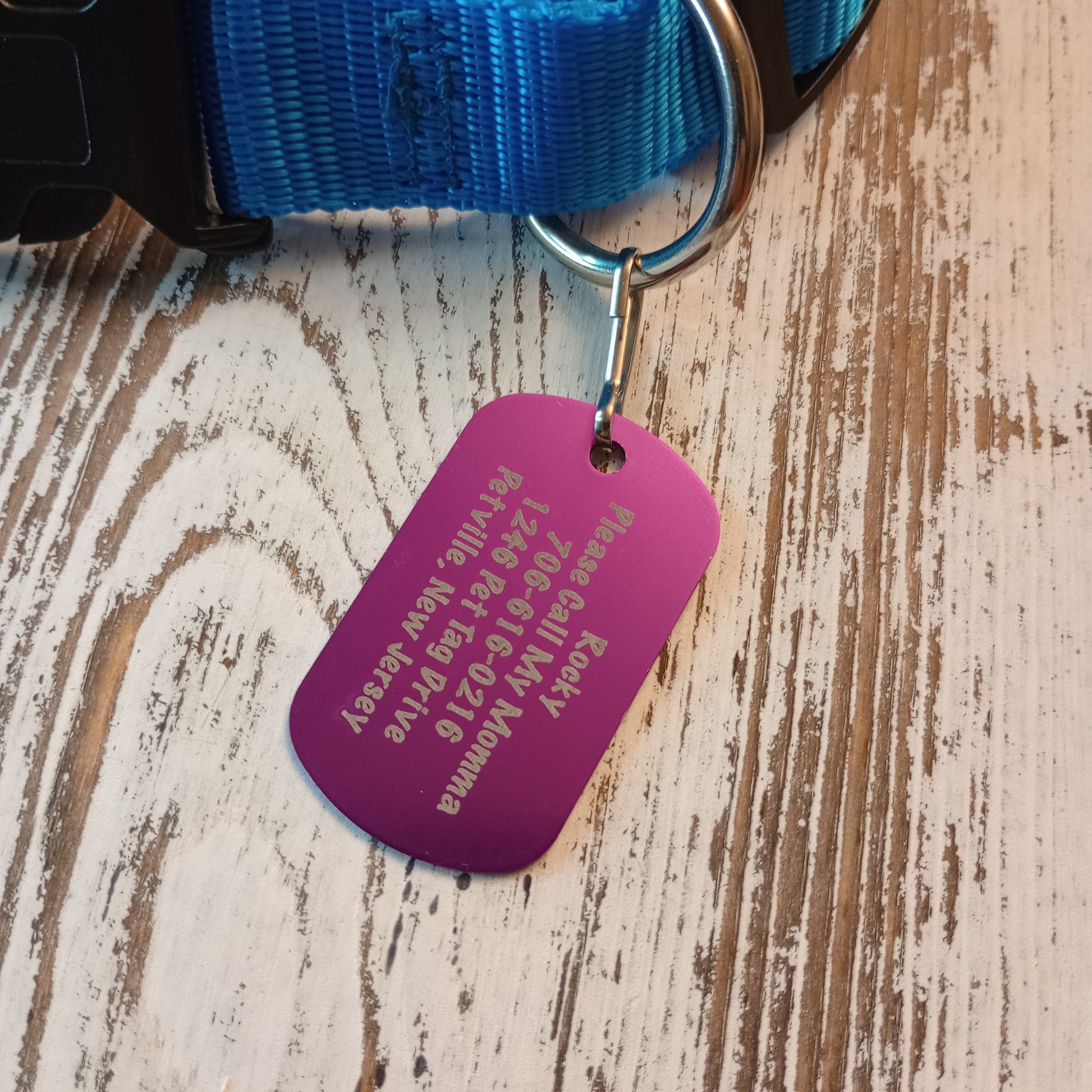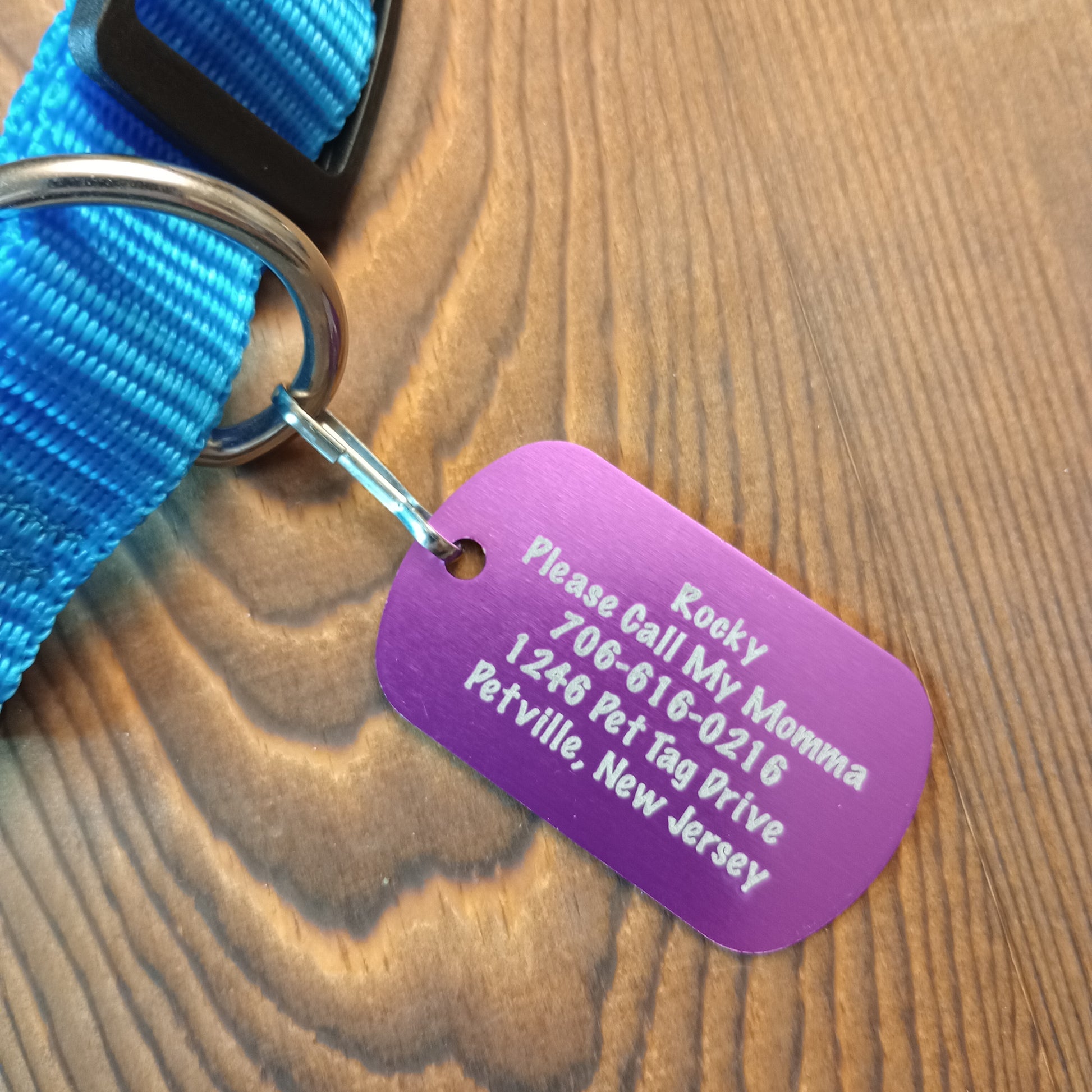 This Purple Military Style Pet Tag is anodized aluminum that allows for 5 lines of text to be engraved lengthwise on the front and 5 lines of text to be engraved lengthwise on the back.