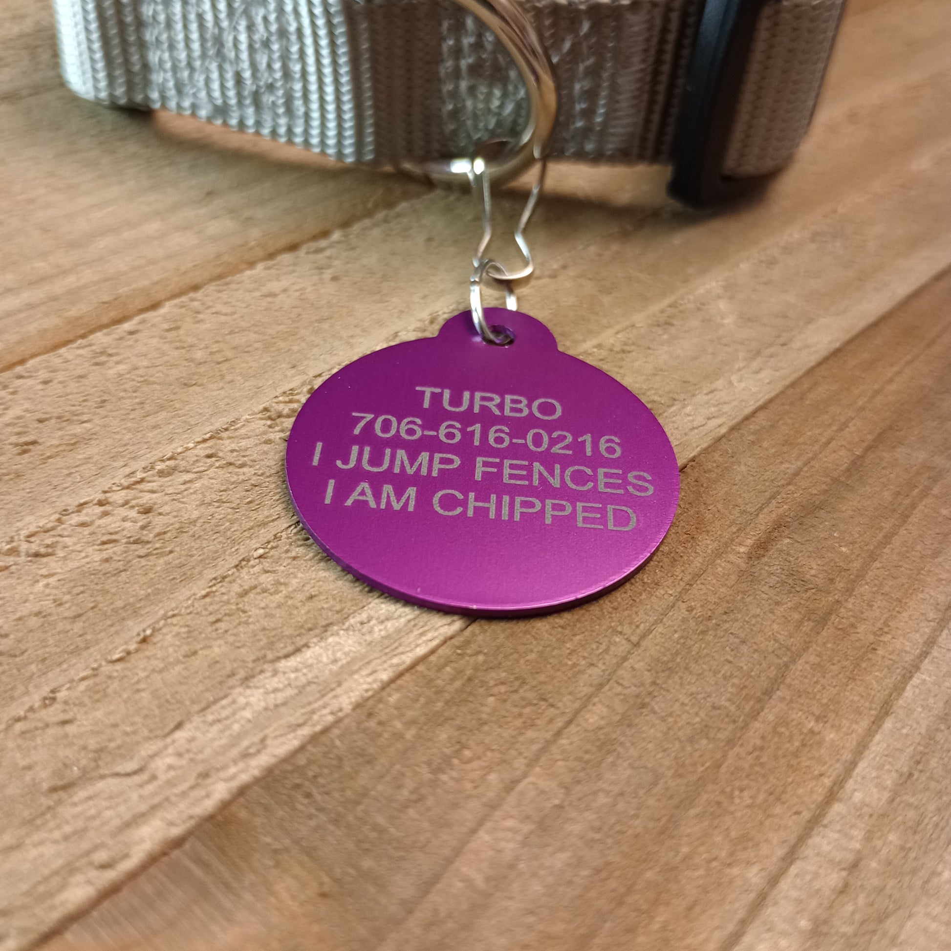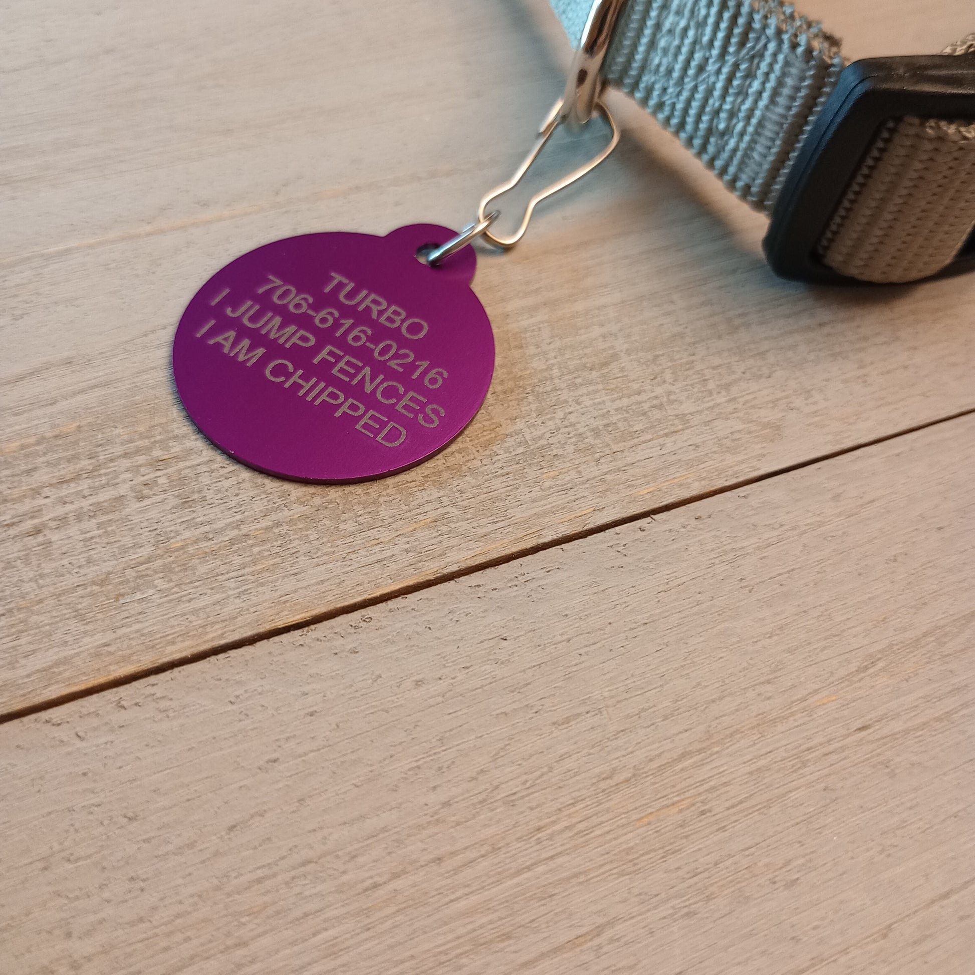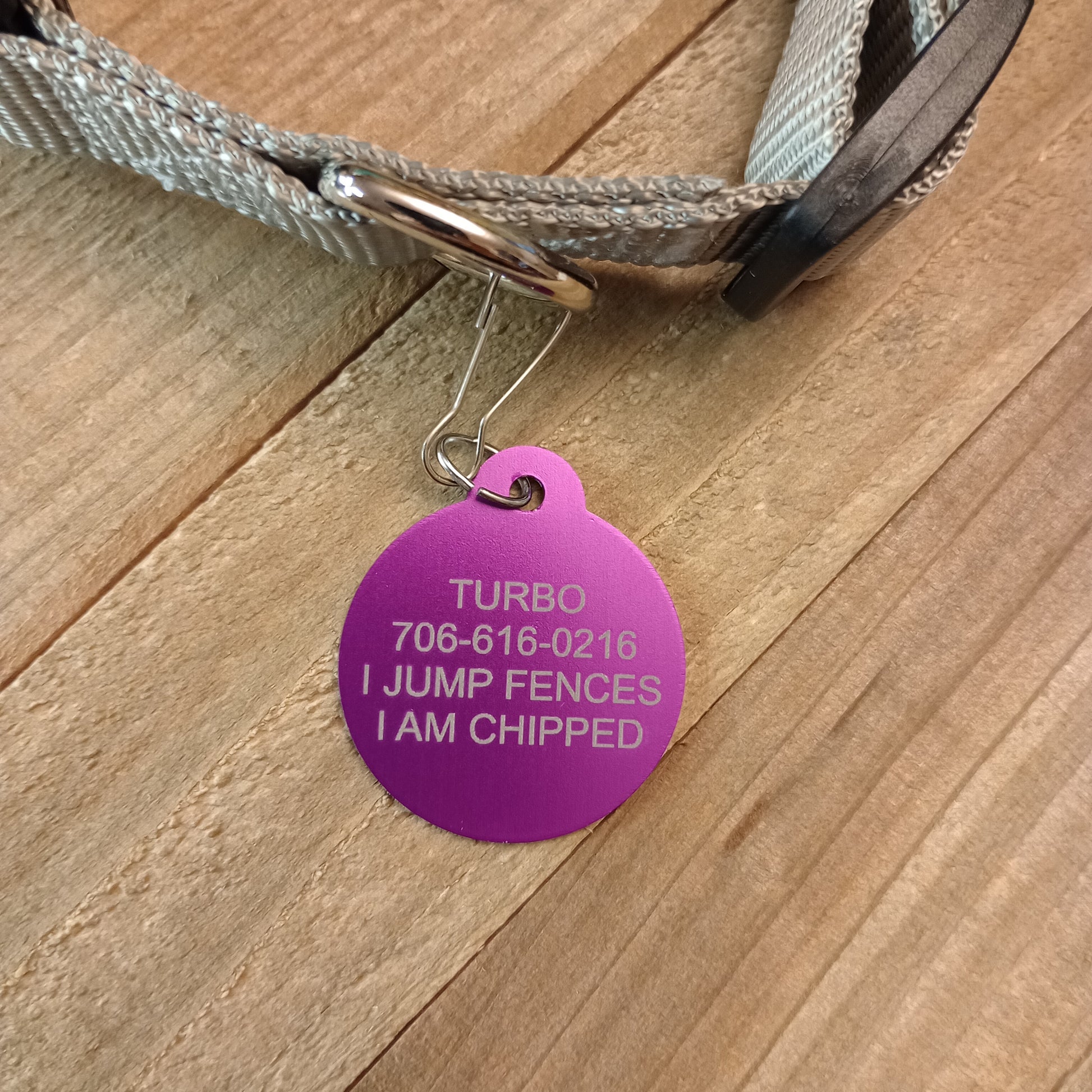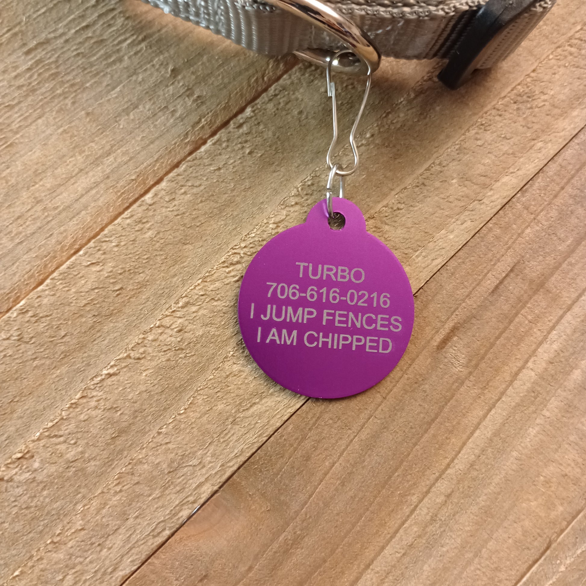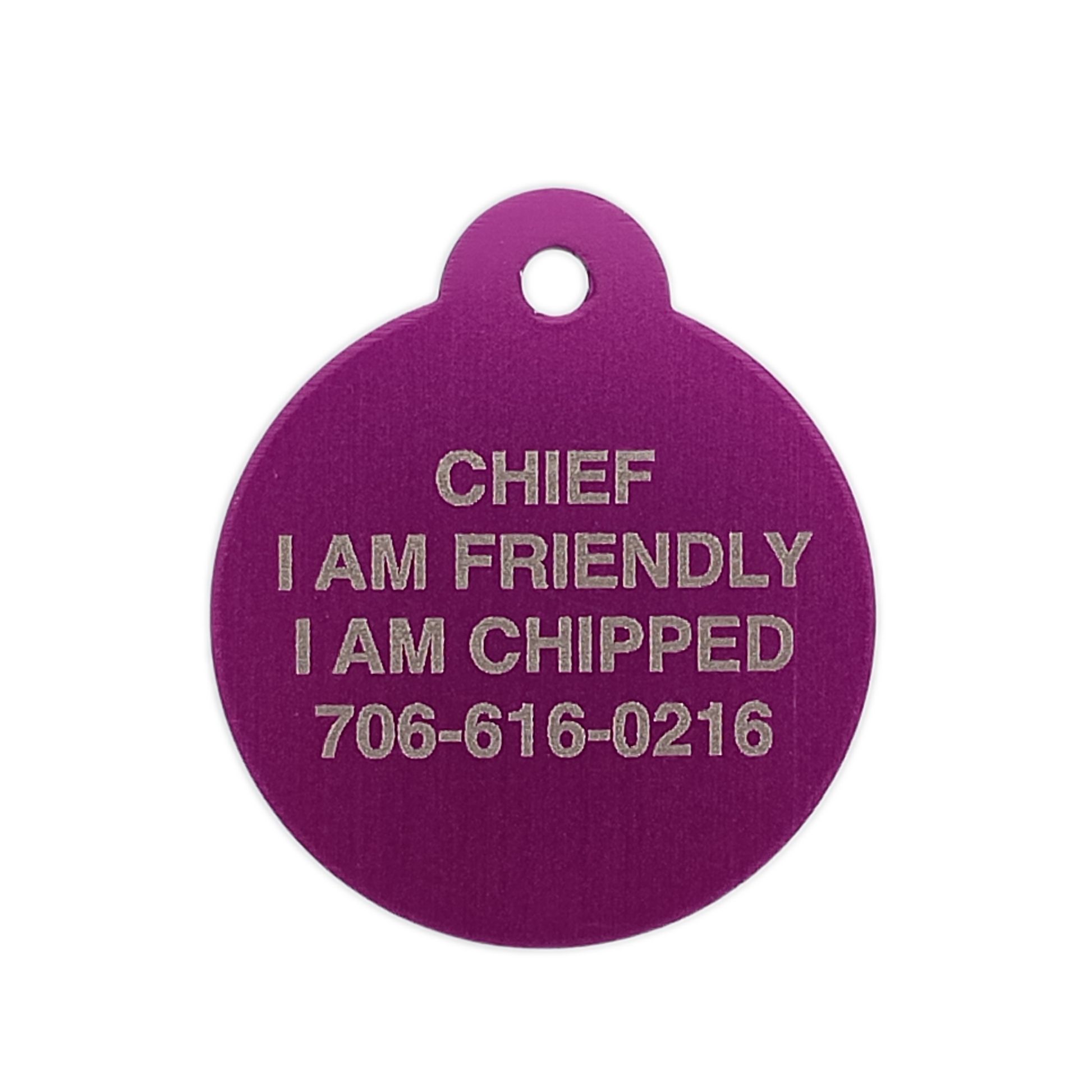 This Purple Round 1 and 1/4 inch Pet Tag is anodized aluminum that allows for 4 lines of text to be engraved on the front and 4 lines of text to be engraved on the back.
