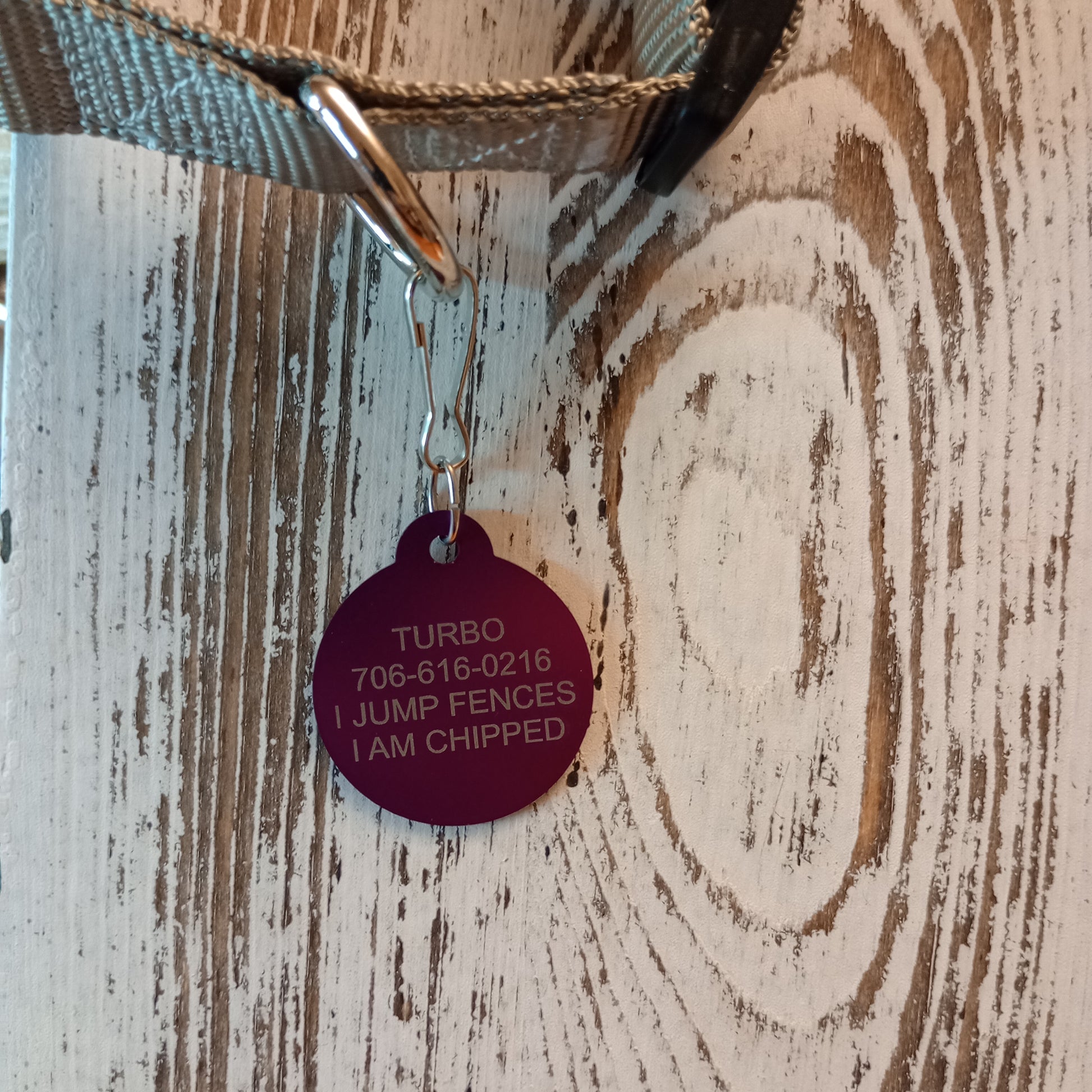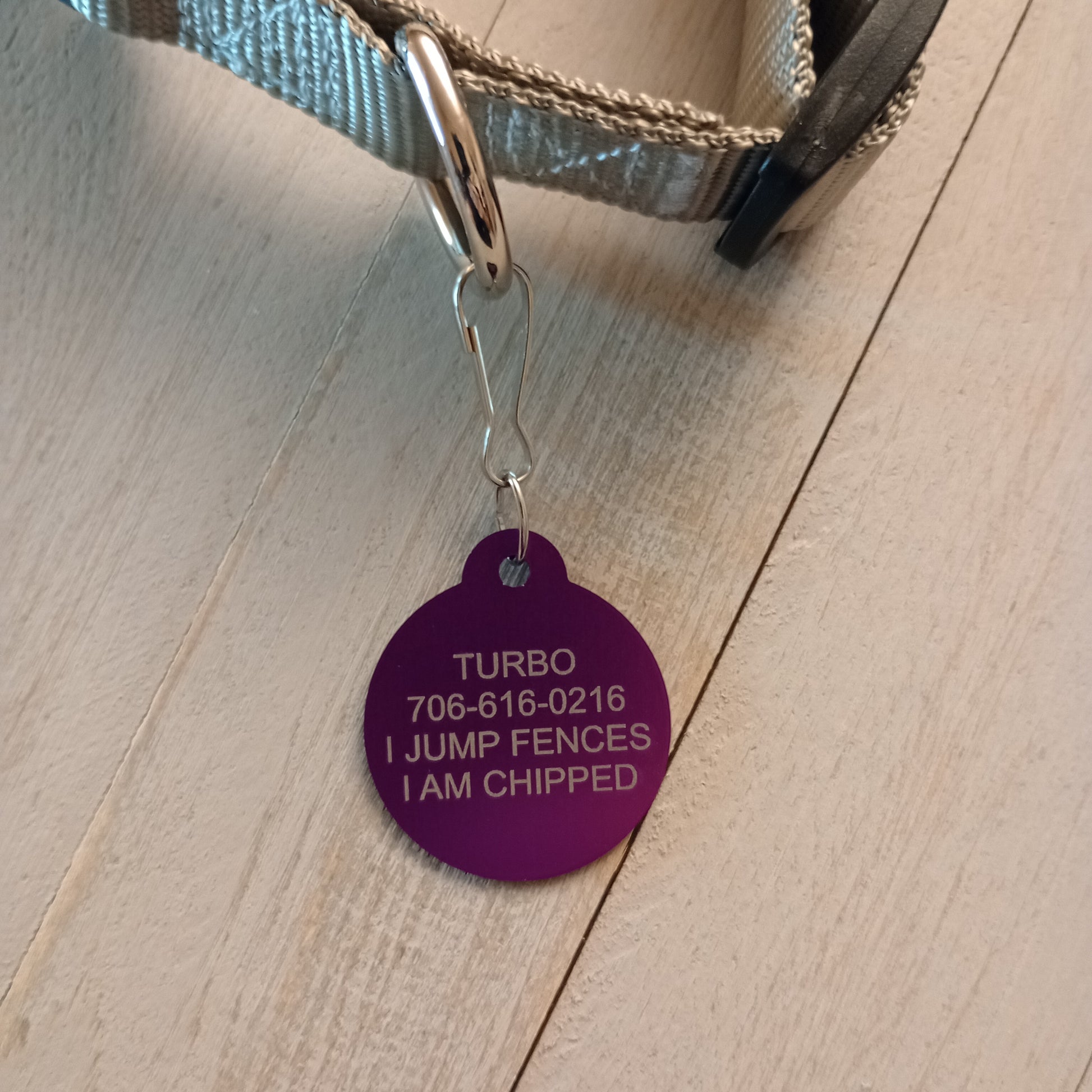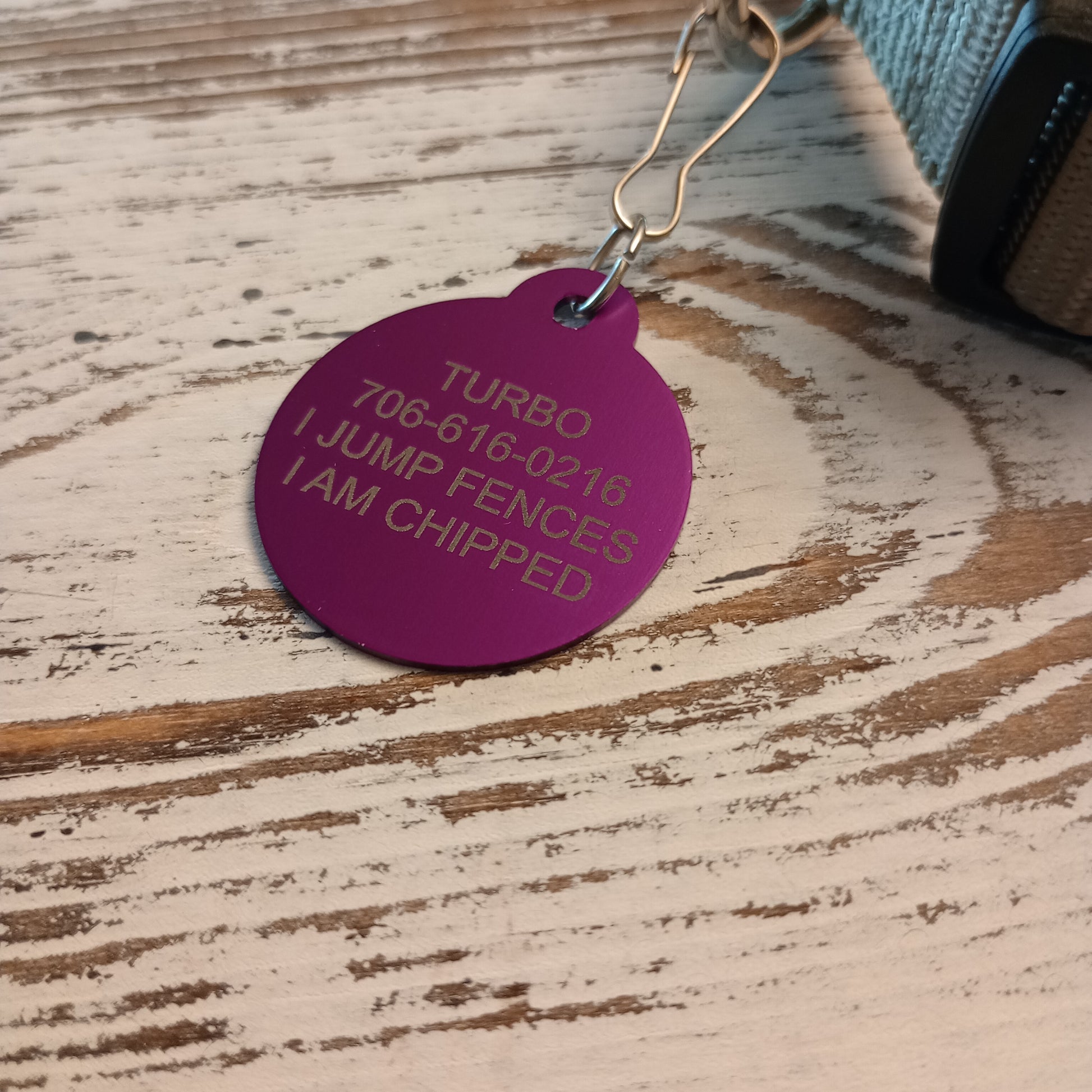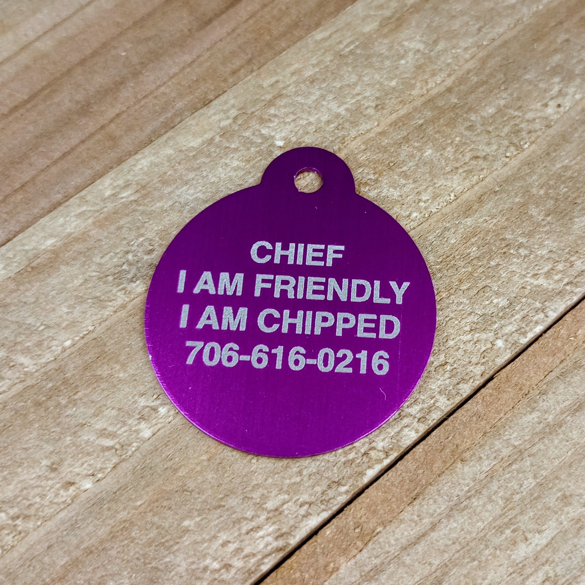 This Purple Round 1 and 1/4 inch Pet Tag is anodized aluminum that allows for 4 lines of text to be engraved on the front and 4 lines of text to be engraved on the back.