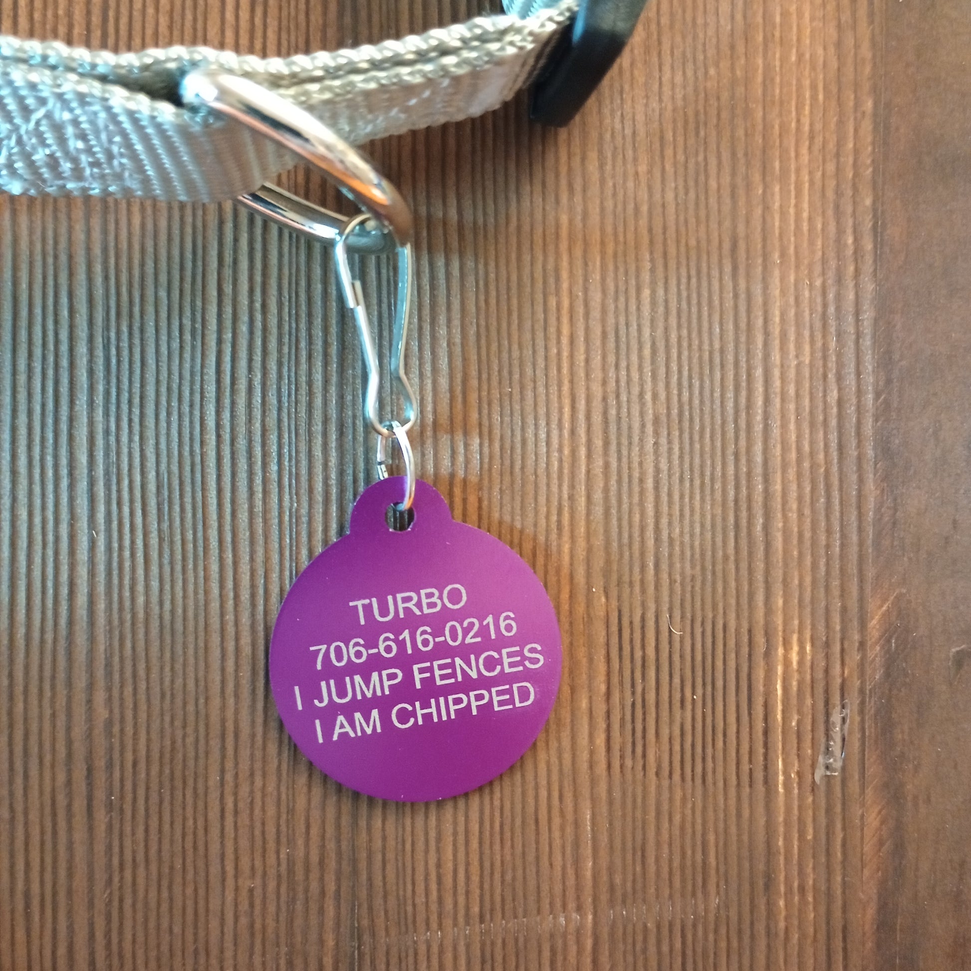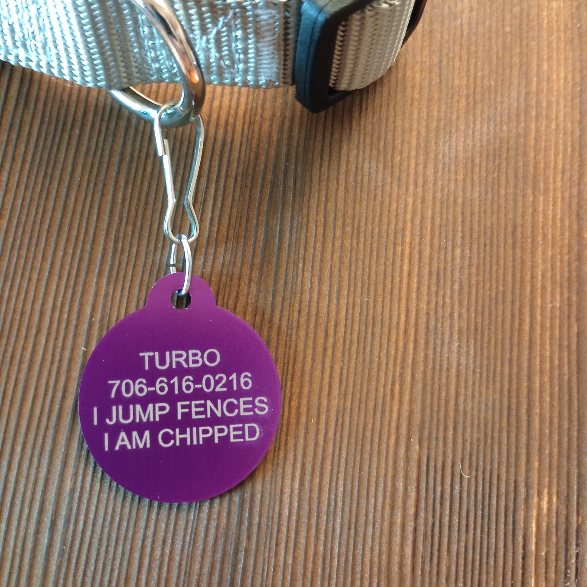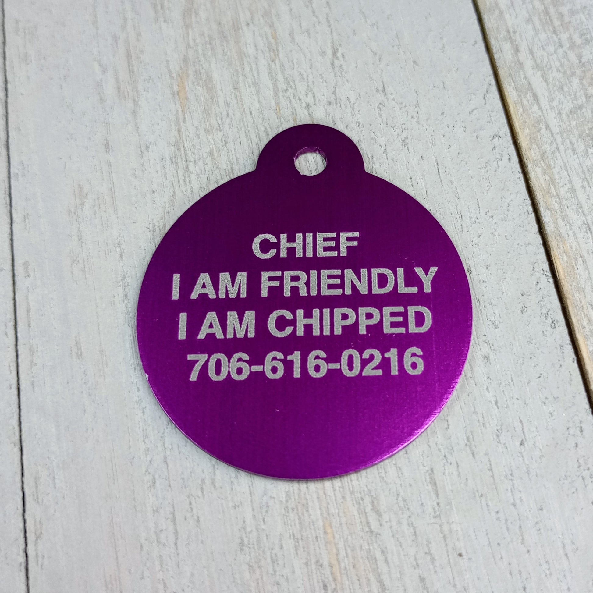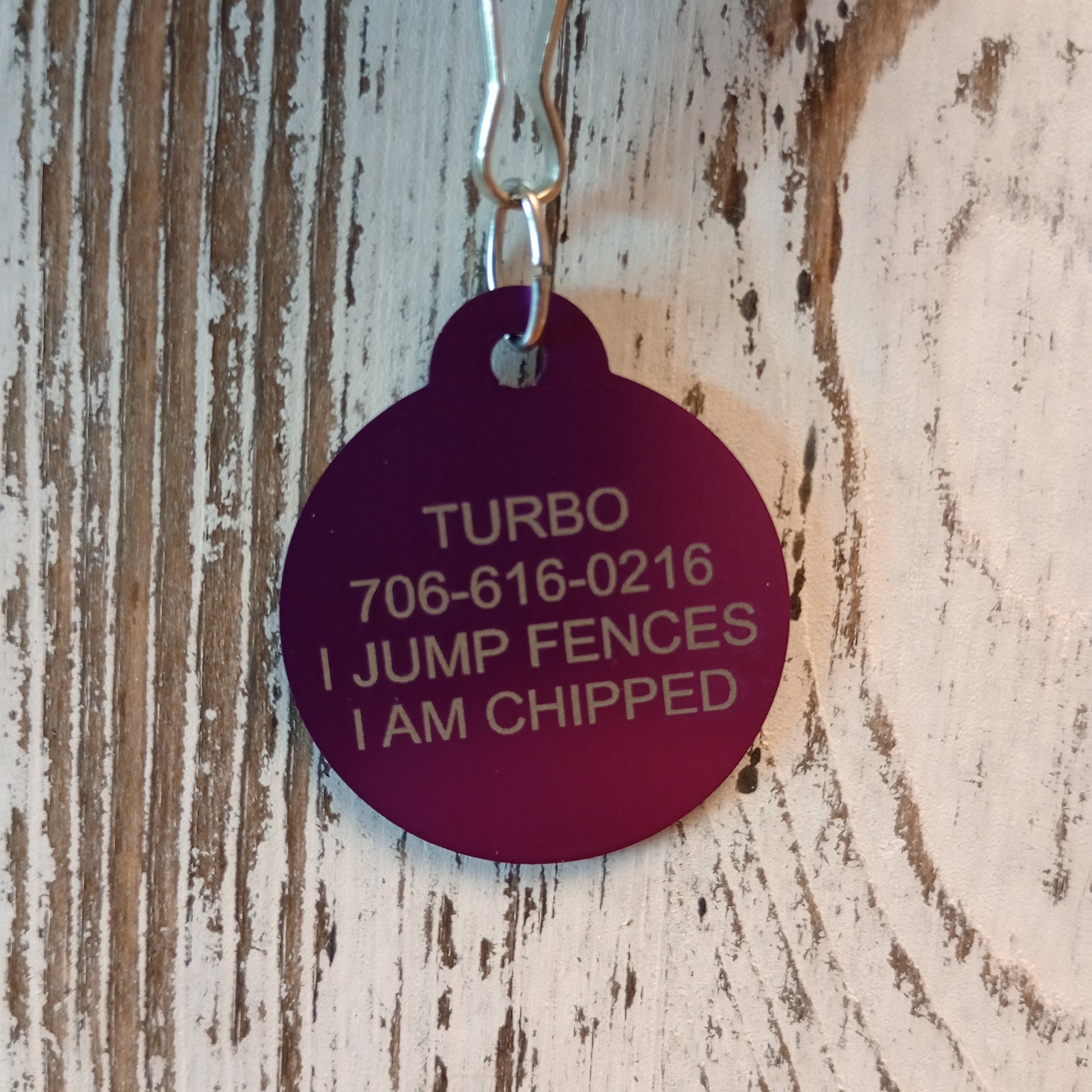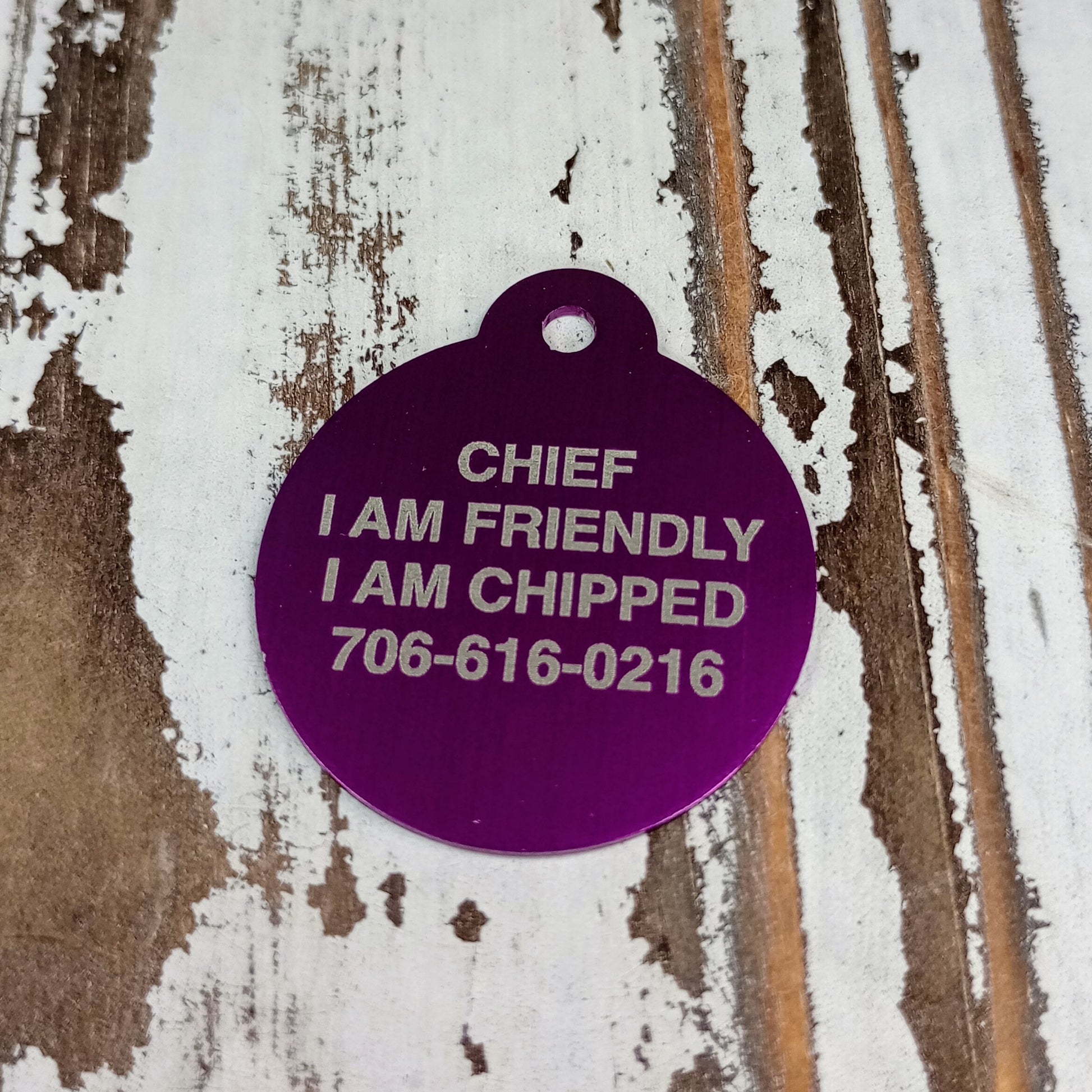 This Purple Round 1 and 1/4 inch Pet Tag is anodized aluminum that allows for 4 lines of text to be engraved on the front and 4 lines of text to be engraved on the back.