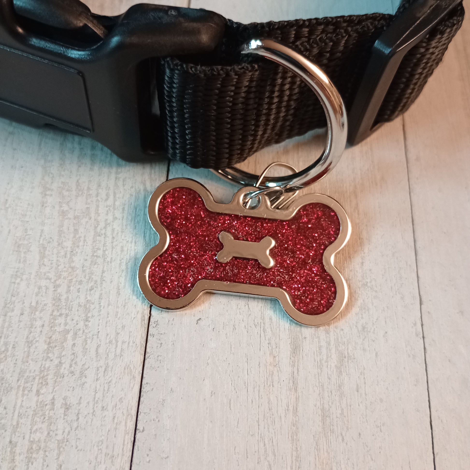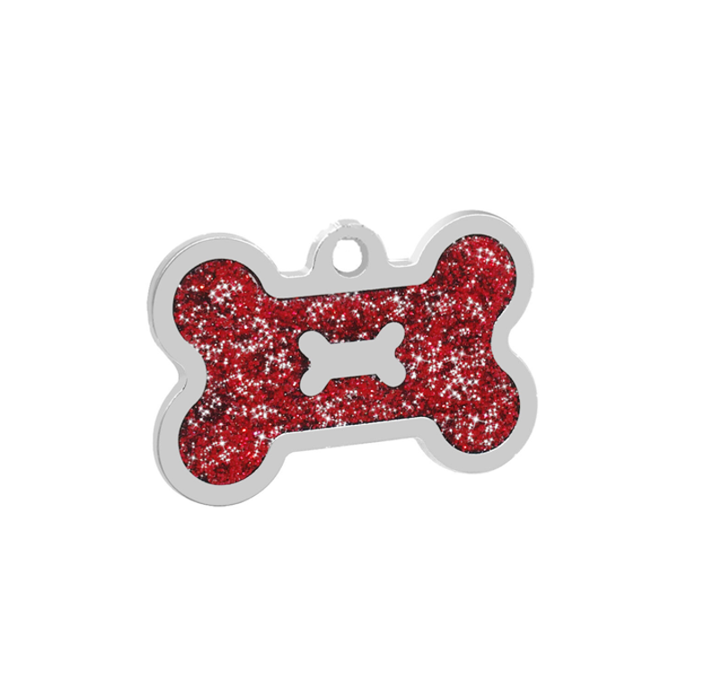 This Red Glitter Bone Shaped Pet Tag is made of zinc alloy and has an undecorated back that allows for 4 lines of text to be engraved.