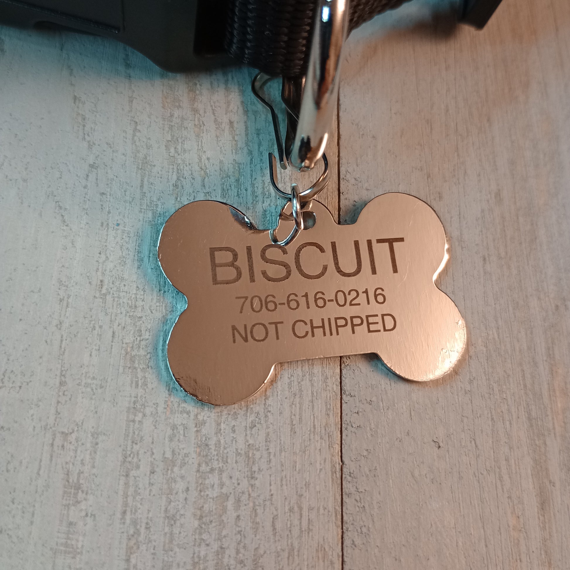 Making the name larger font size: If the tag allows for four lines and you use only three we will use the space from that extra line to make the name of the pet larger than the other lines of text.