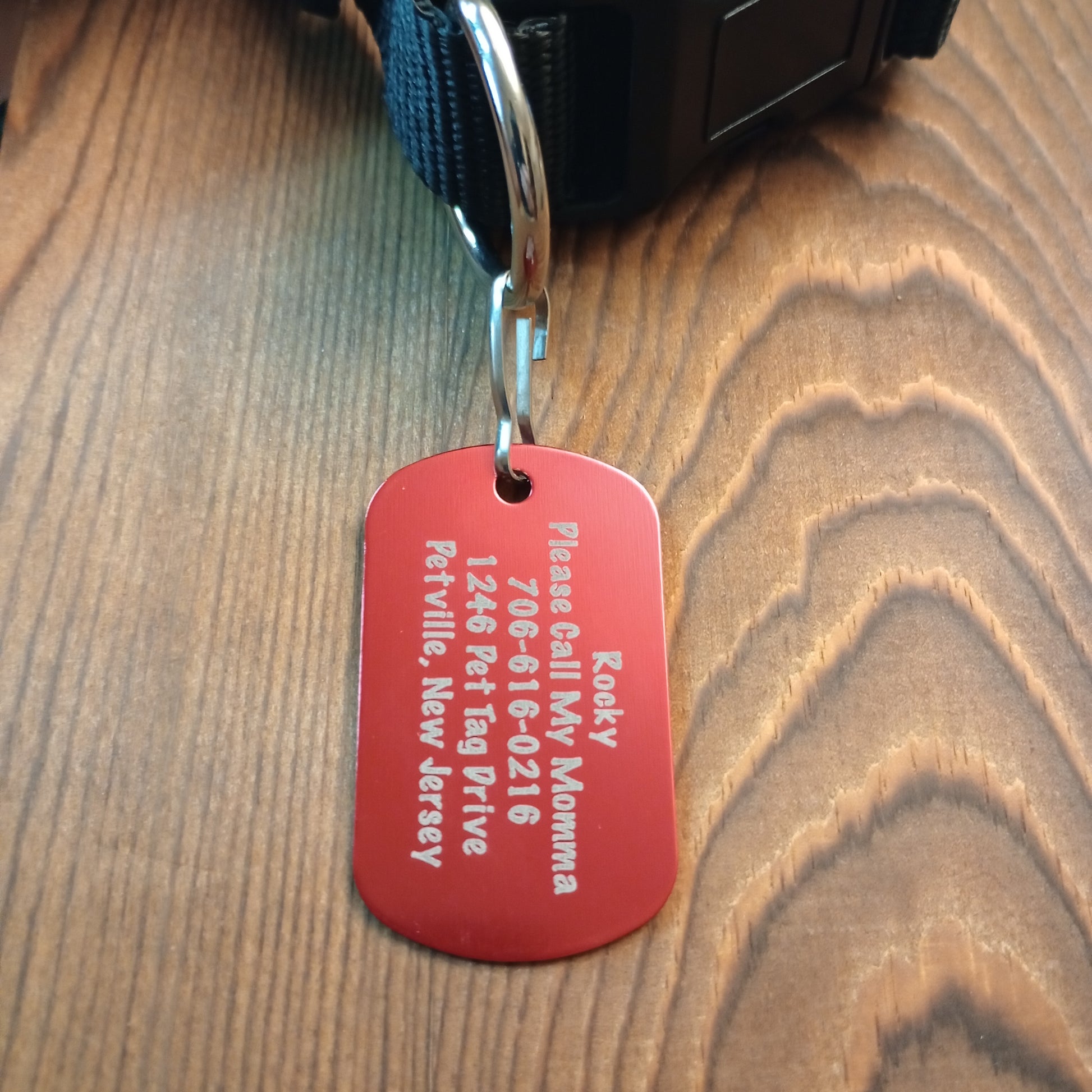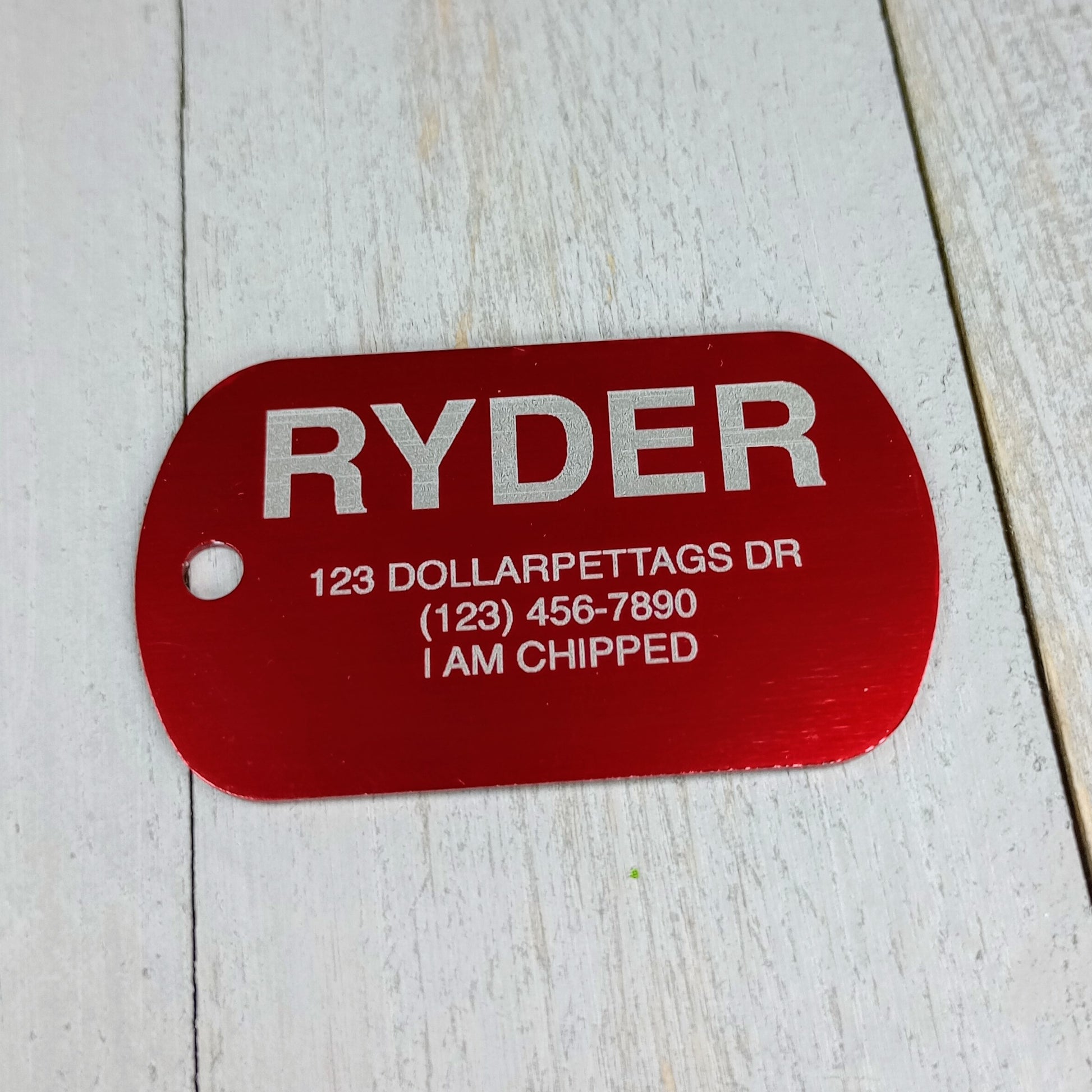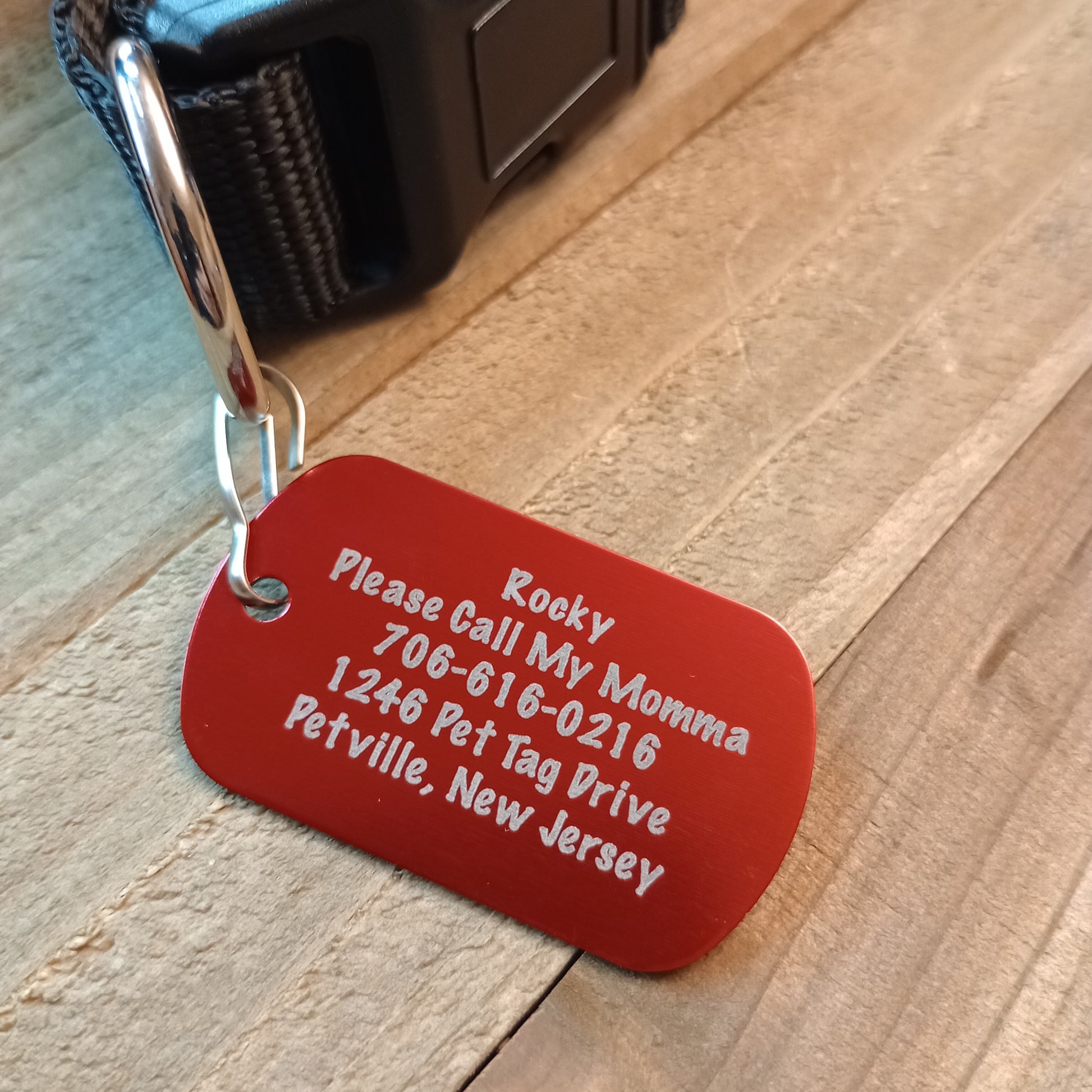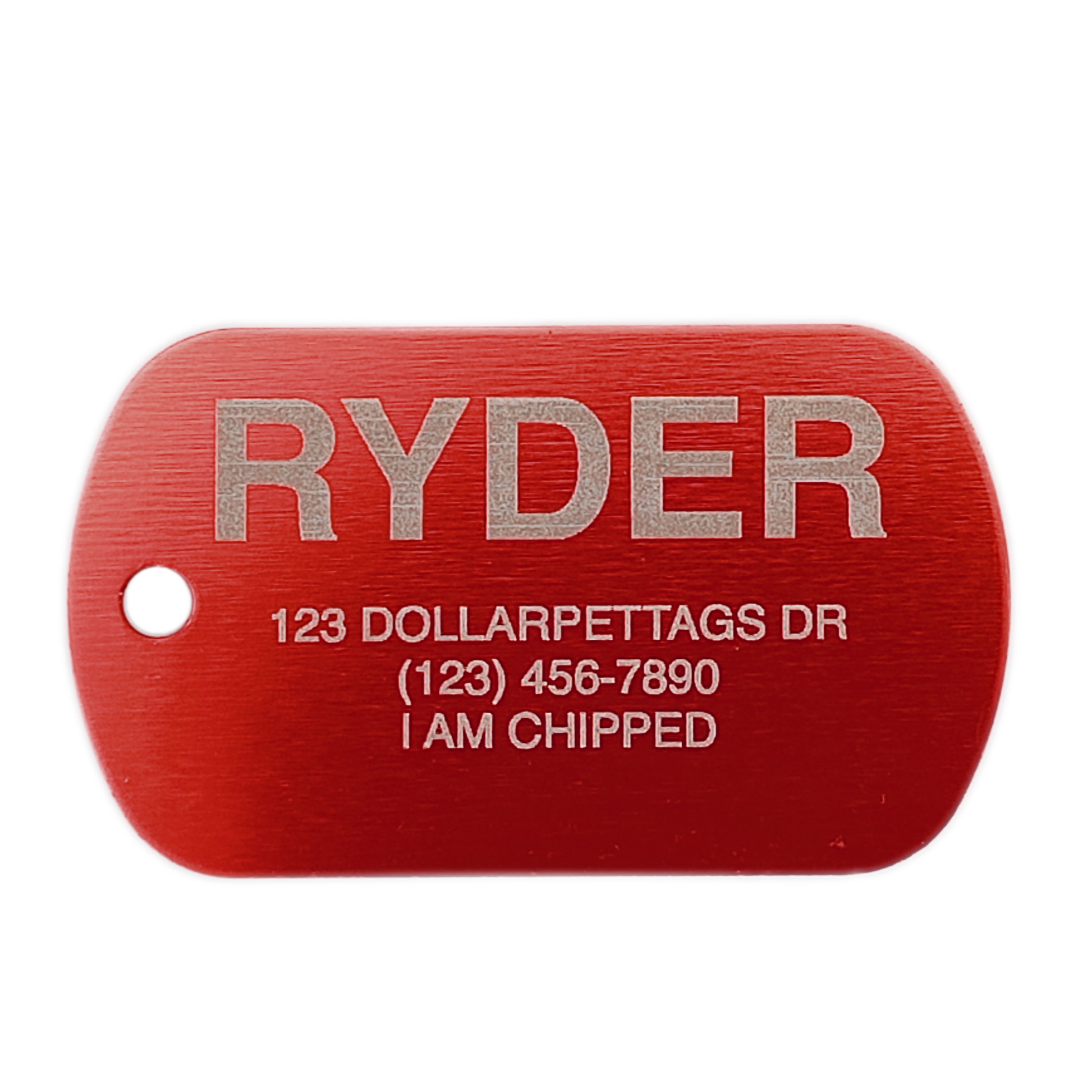 This Red Military Style Pet Tag is anodized aluminum that allows for 5 lines of text to be engraved lengthwise on the front and 5 lines of text to be engraved lengthwise on the back.