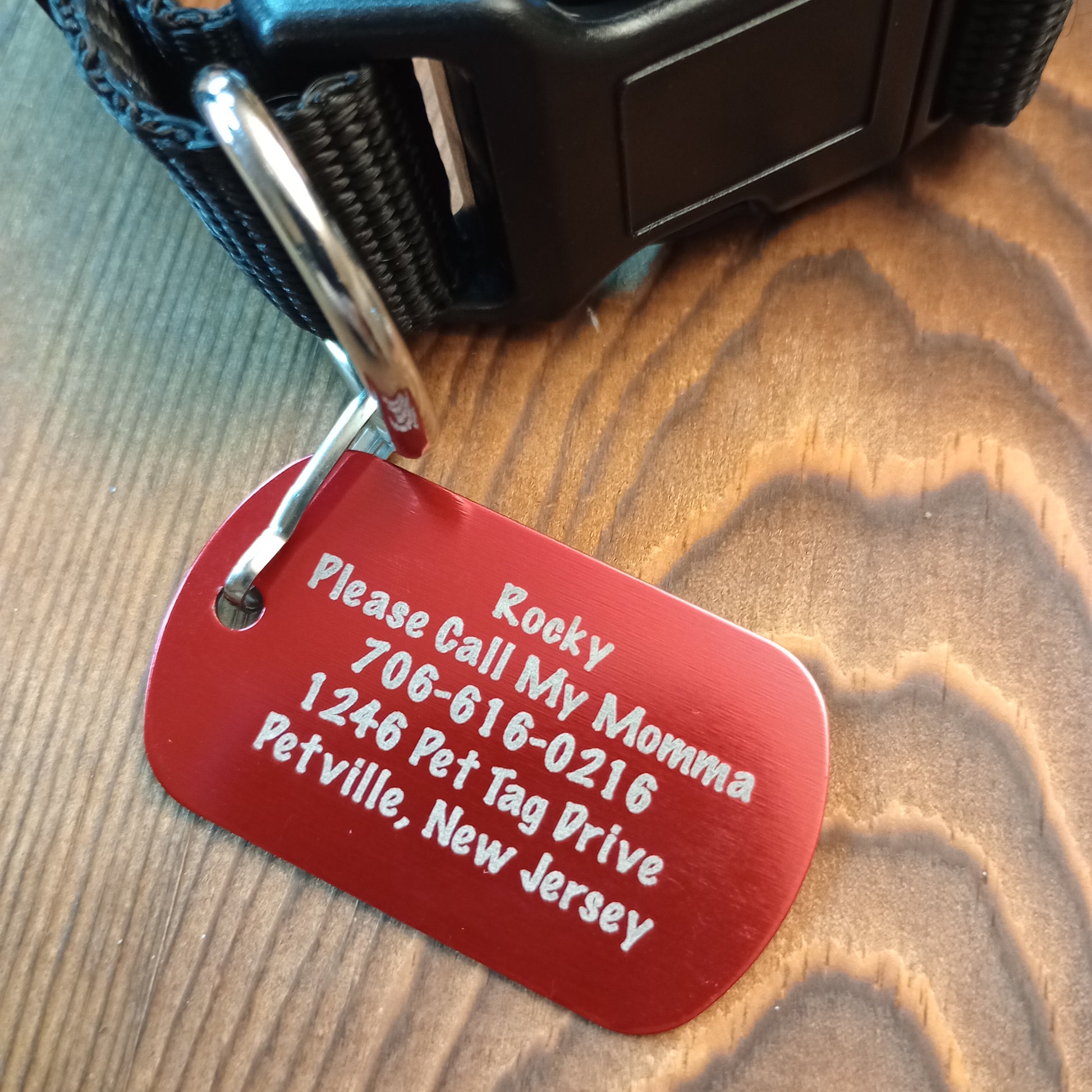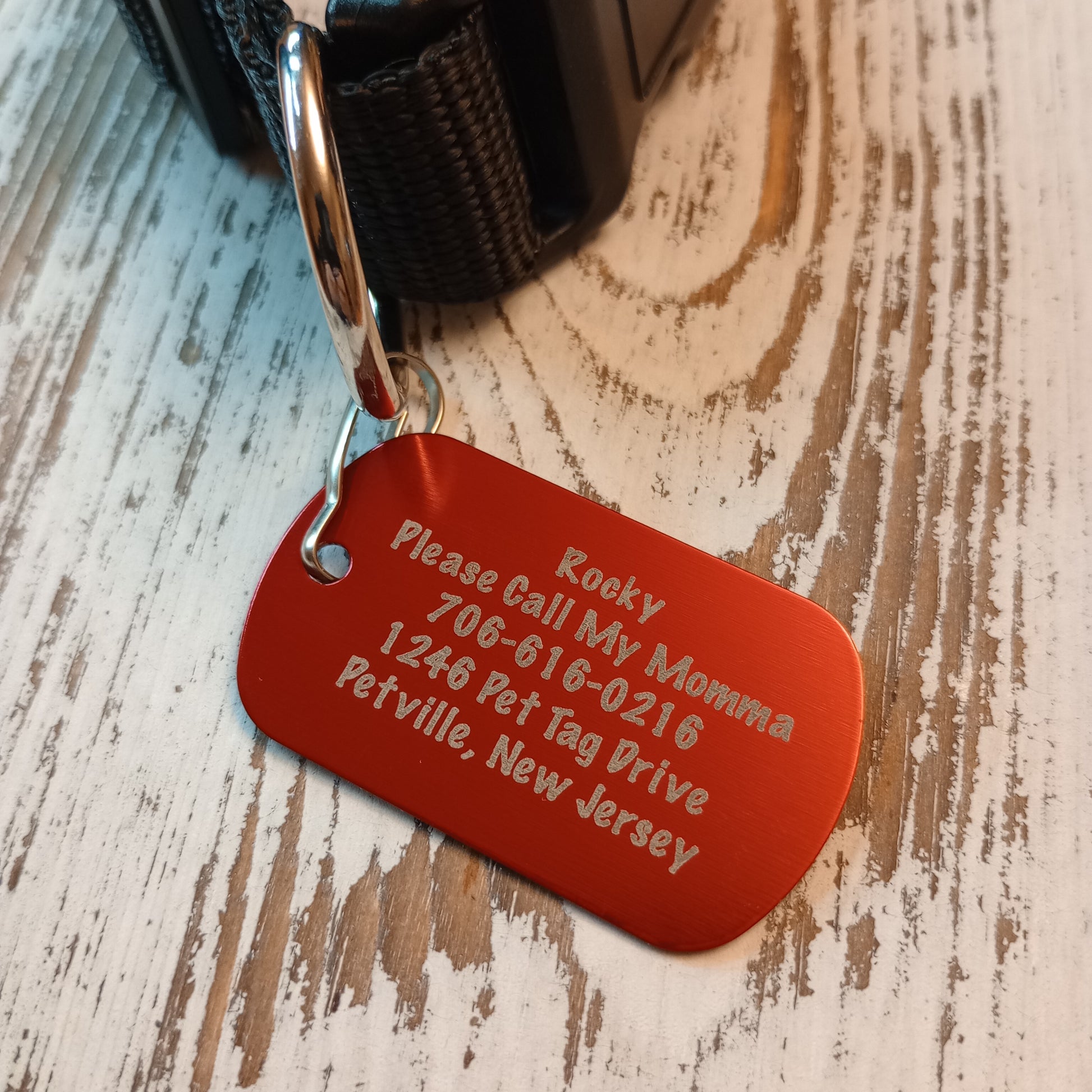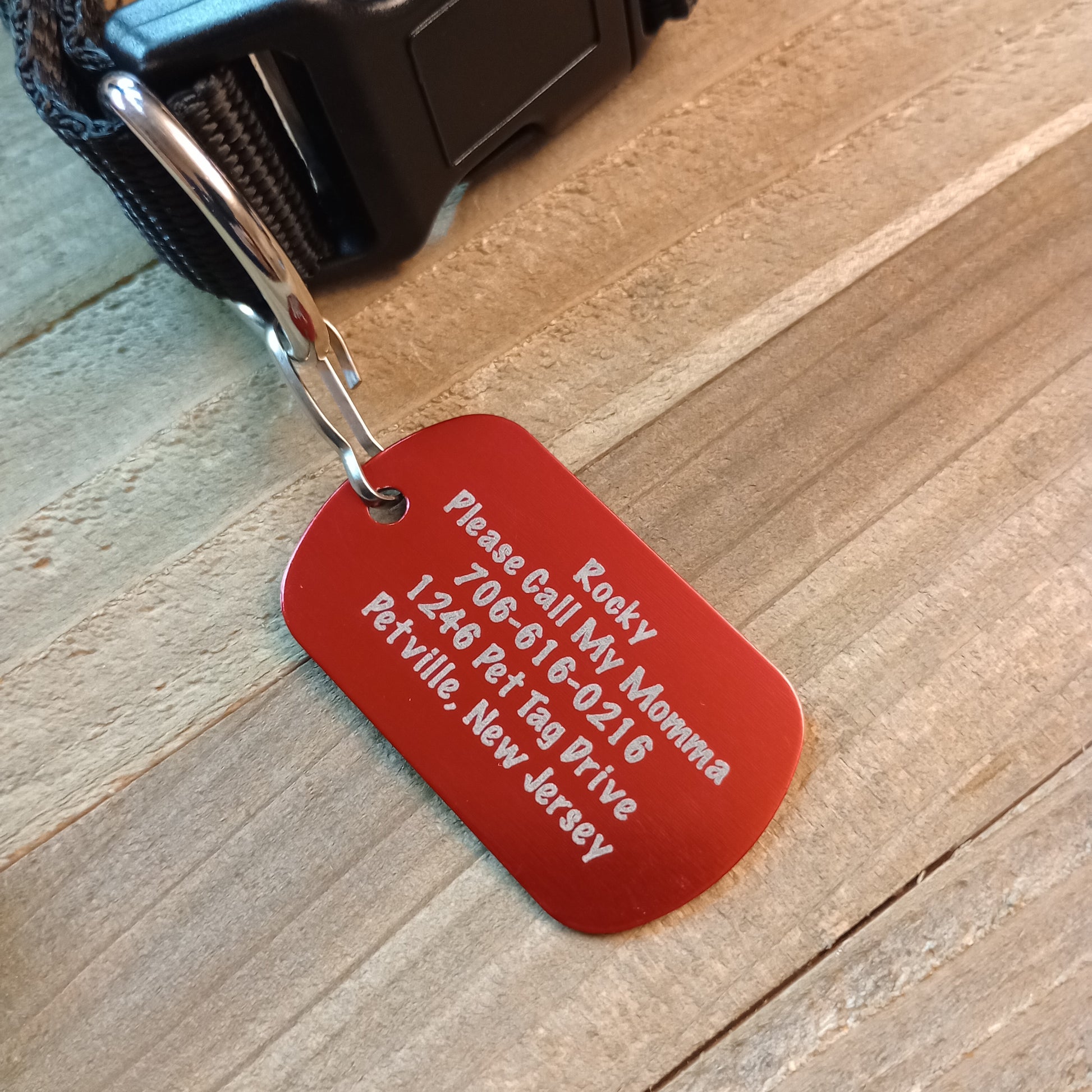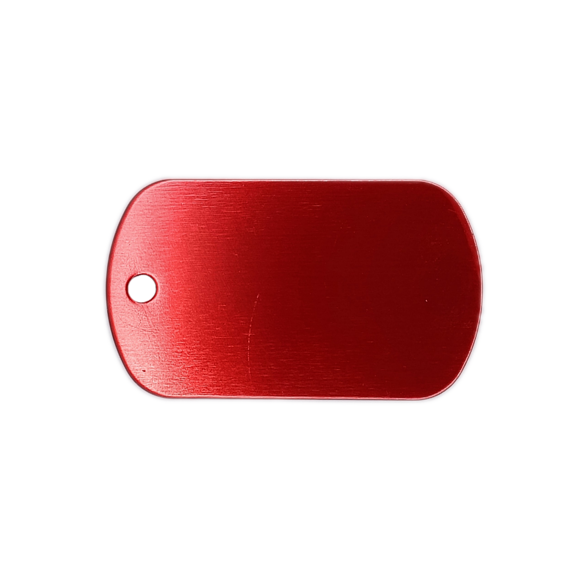 This Red Military Style Pet Tag is anodized aluminum that allows for 5 lines of text to be engraved lengthwise on the front and 5 lines of text to be engraved lengthwise on the back.