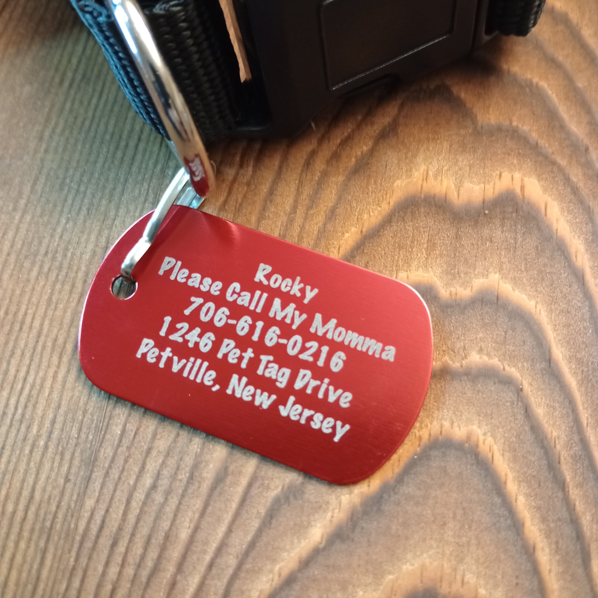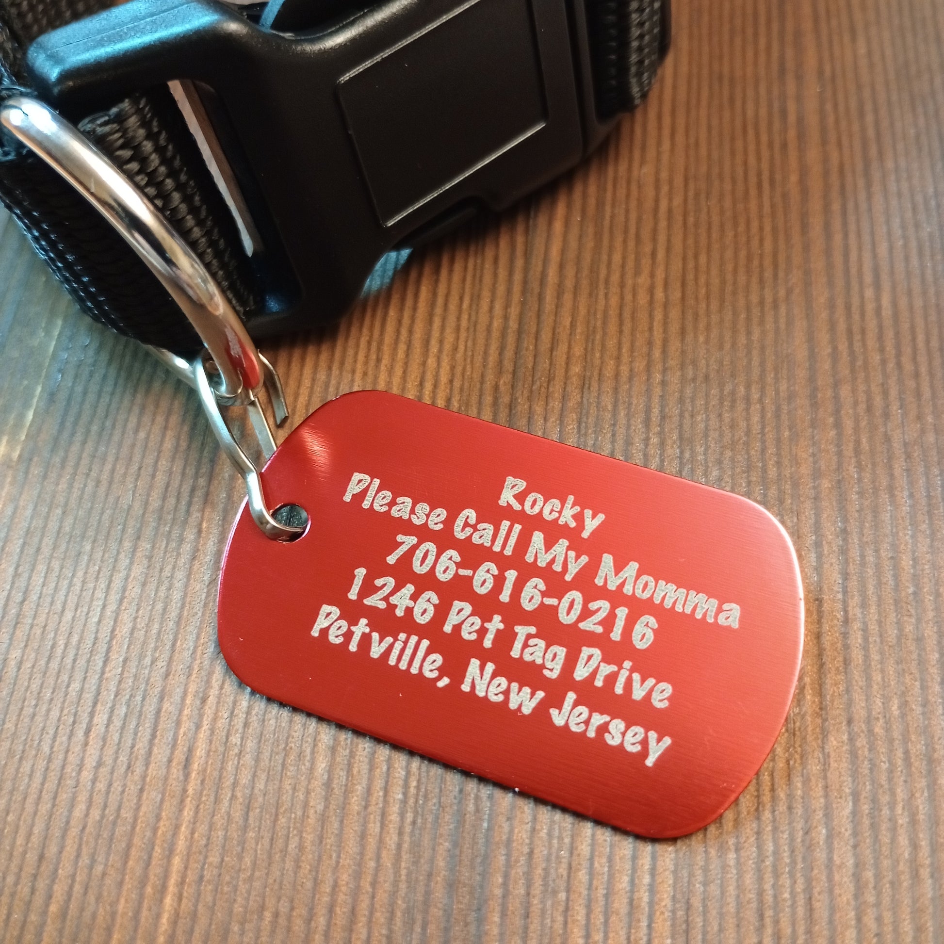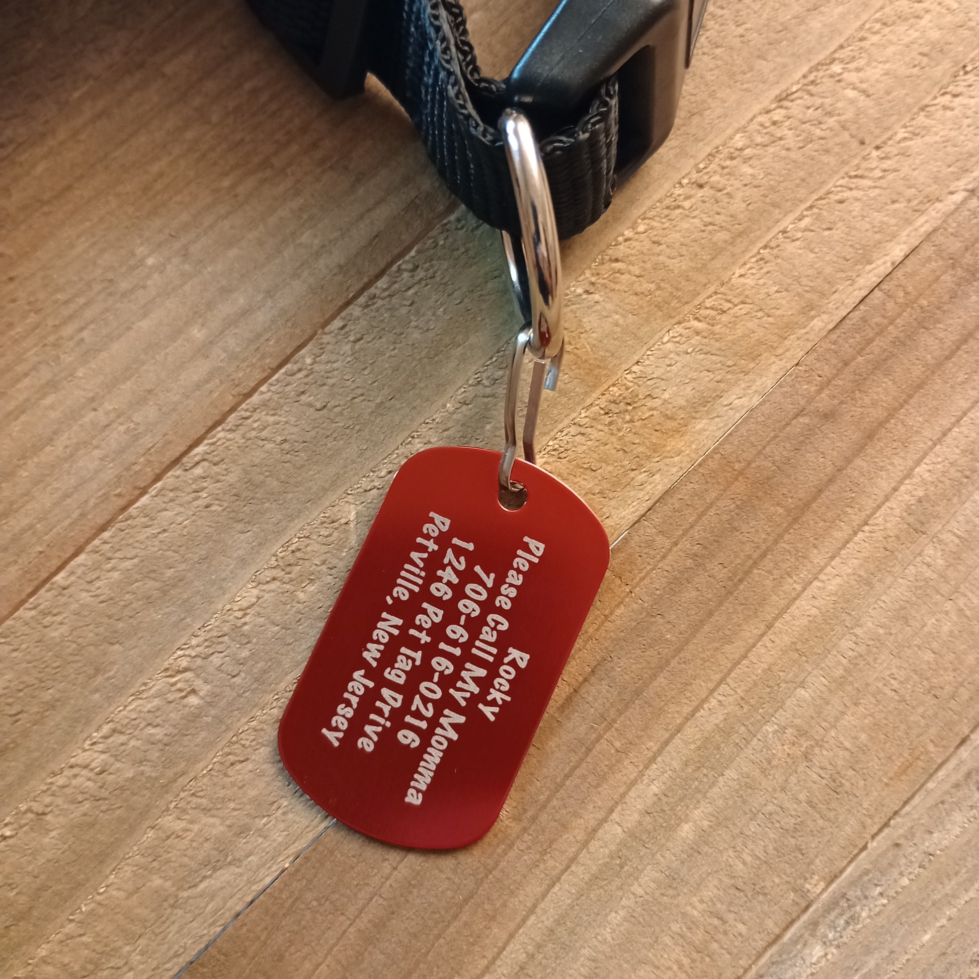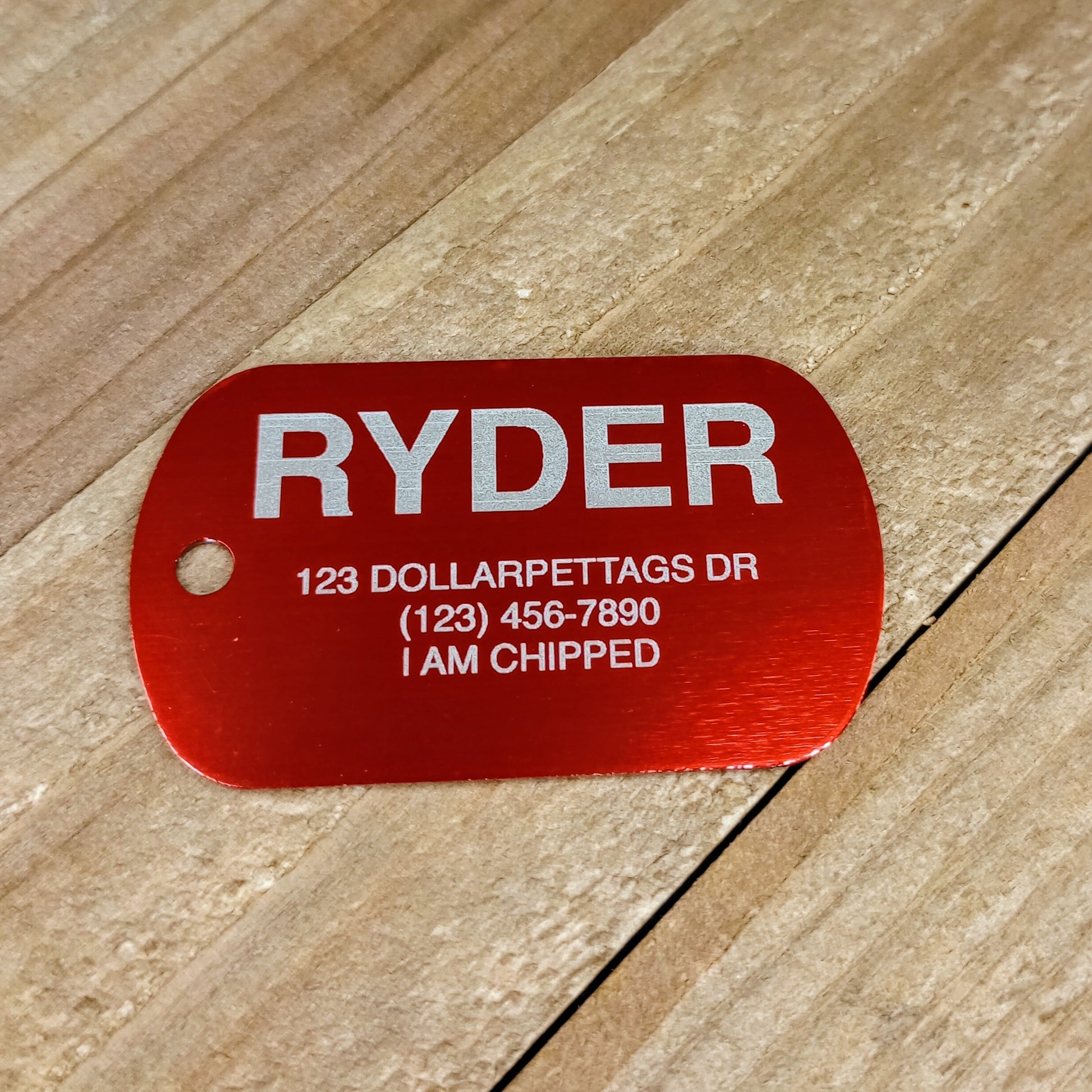 This Red Military Style Pet Tag is anodized aluminum that allows for 5 lines of text to be engraved lengthwise on the front and 5 lines of text to be engraved lengthwise on the back.