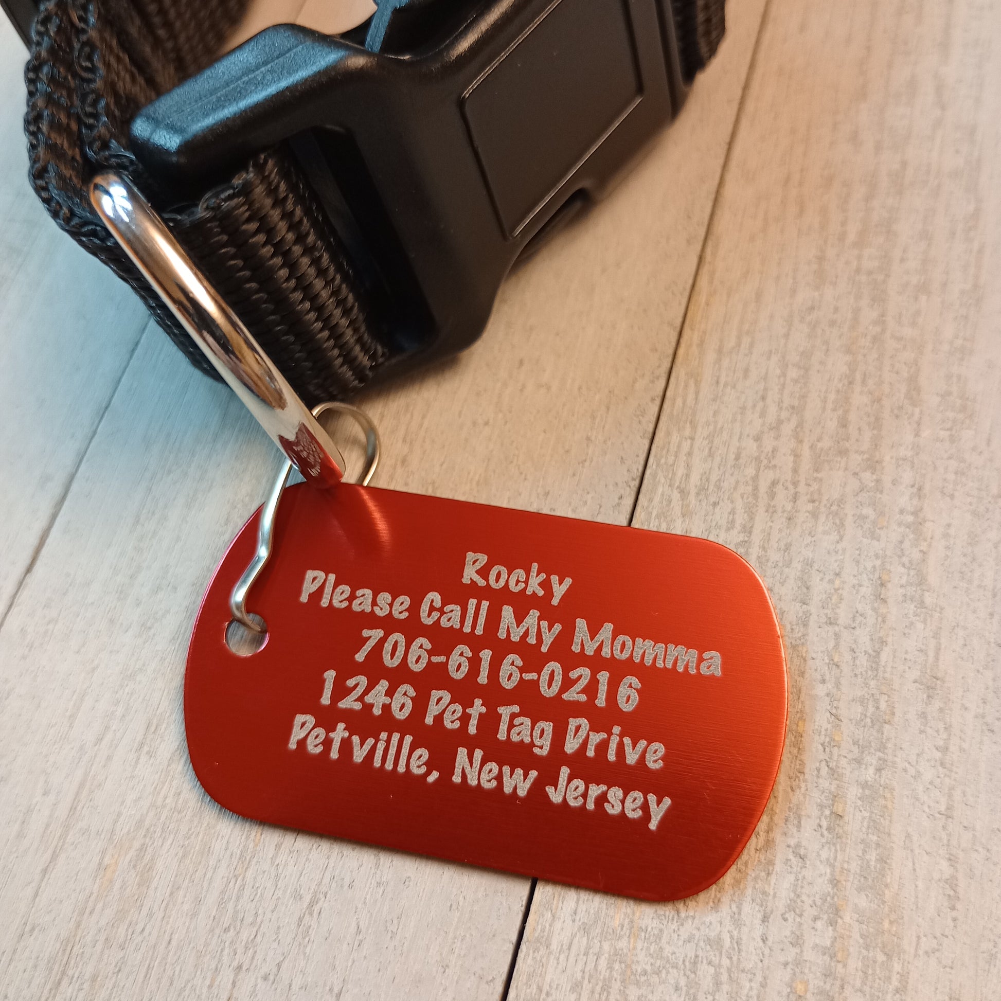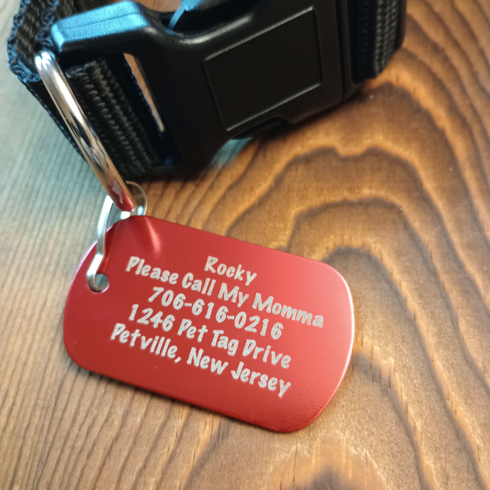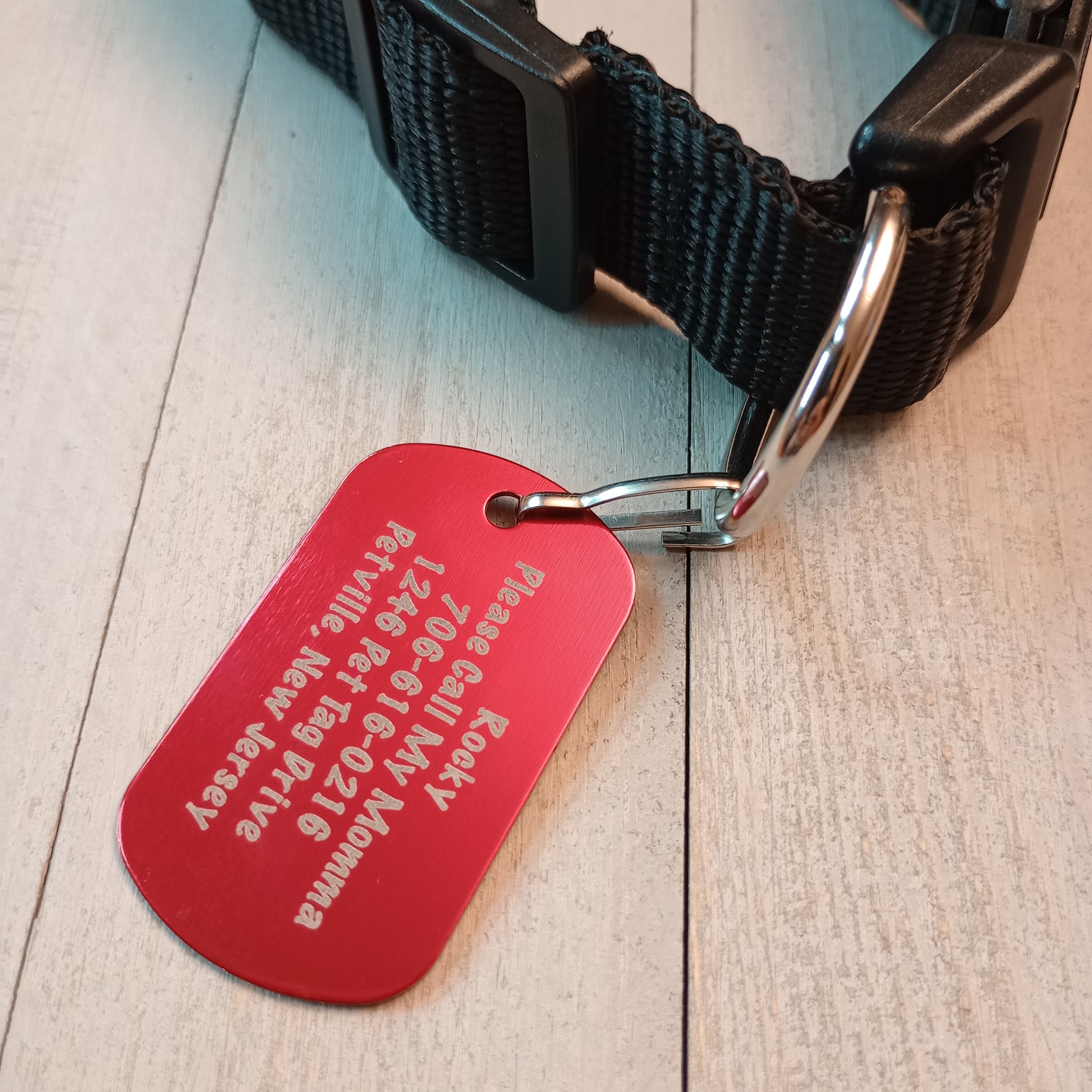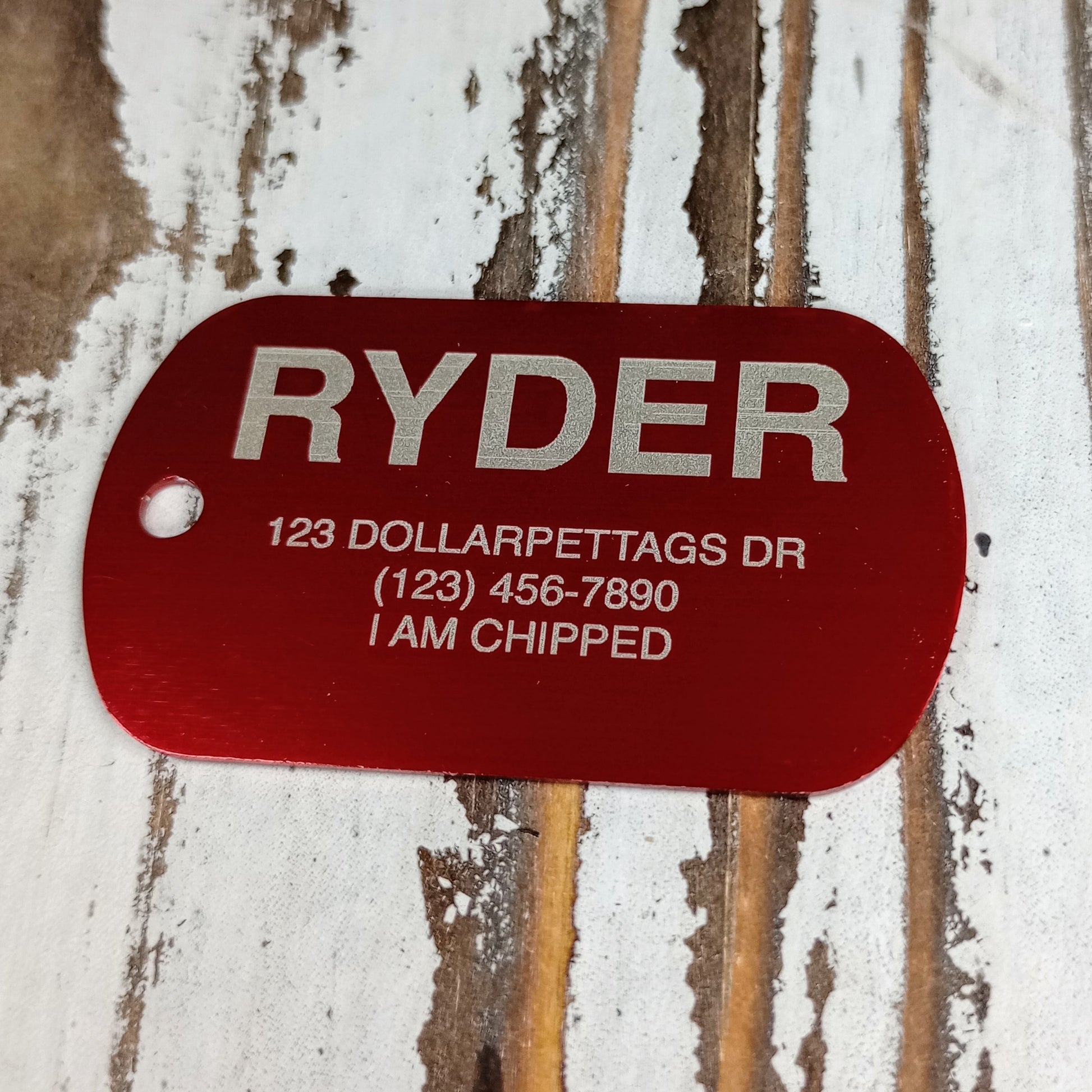 This Red Military Style Pet Tag is anodized aluminum that allows for 5 lines of text to be engraved lengthwise on the front and 5 lines of text to be engraved lengthwise on the back.