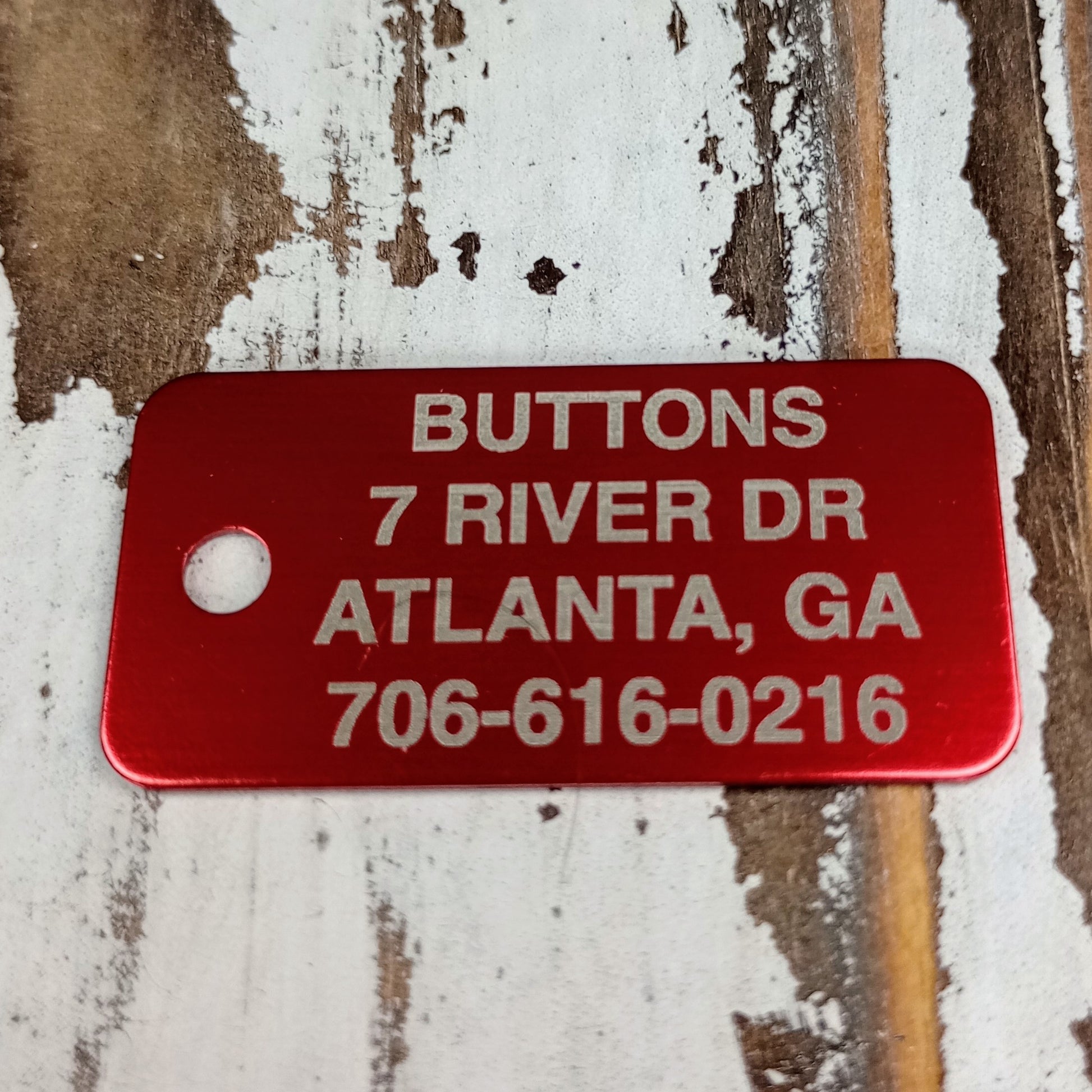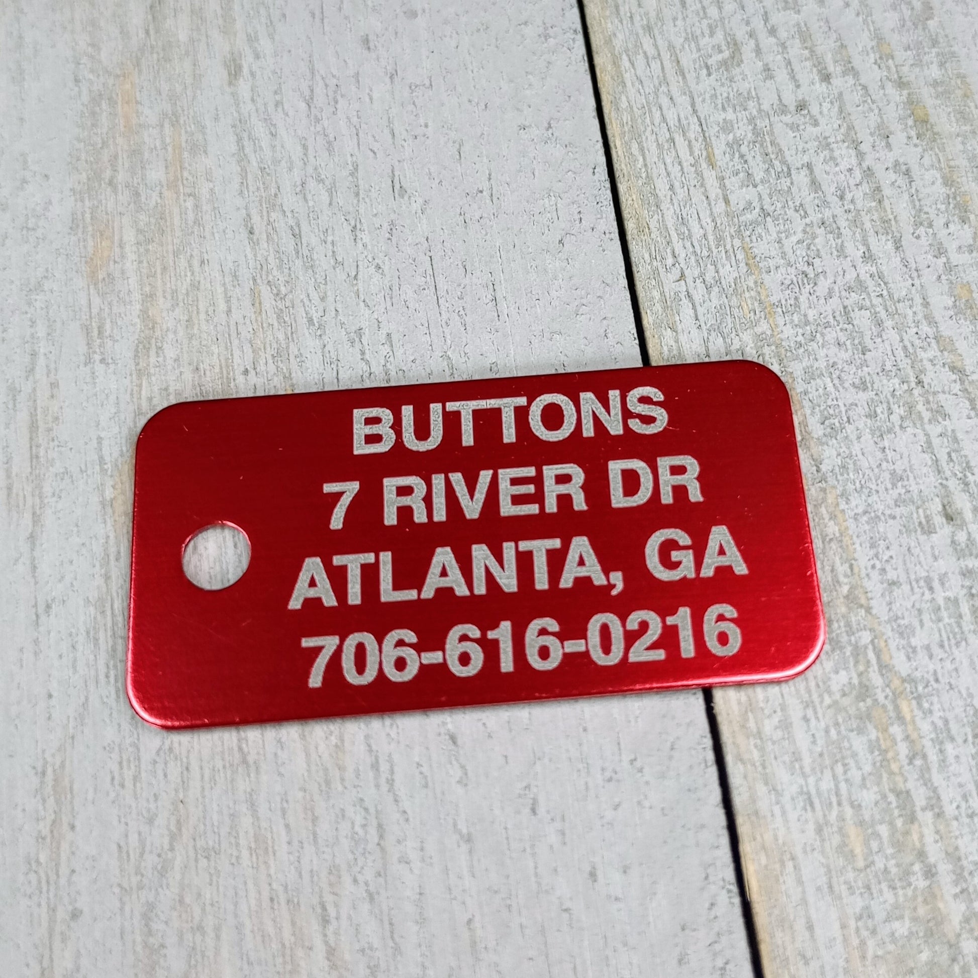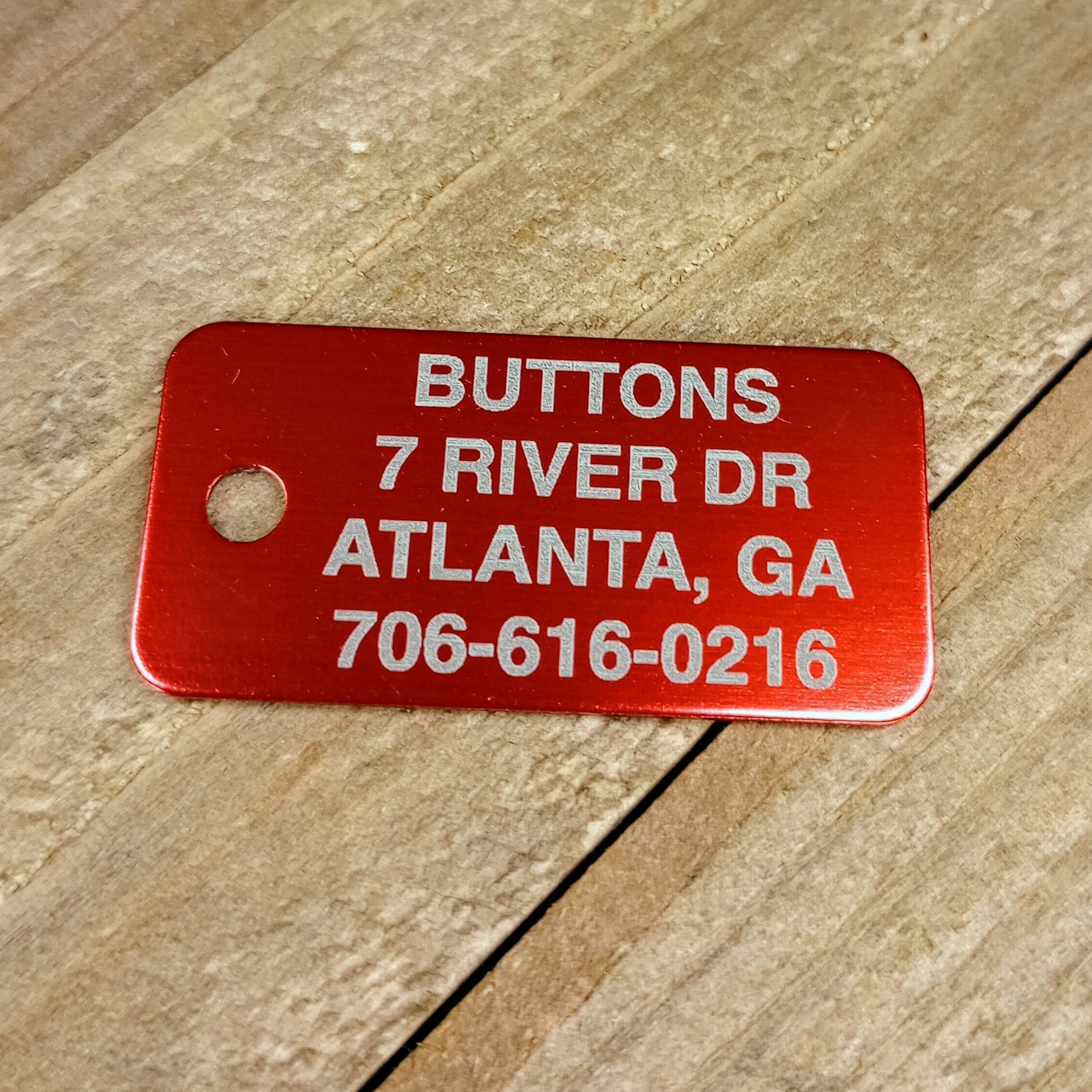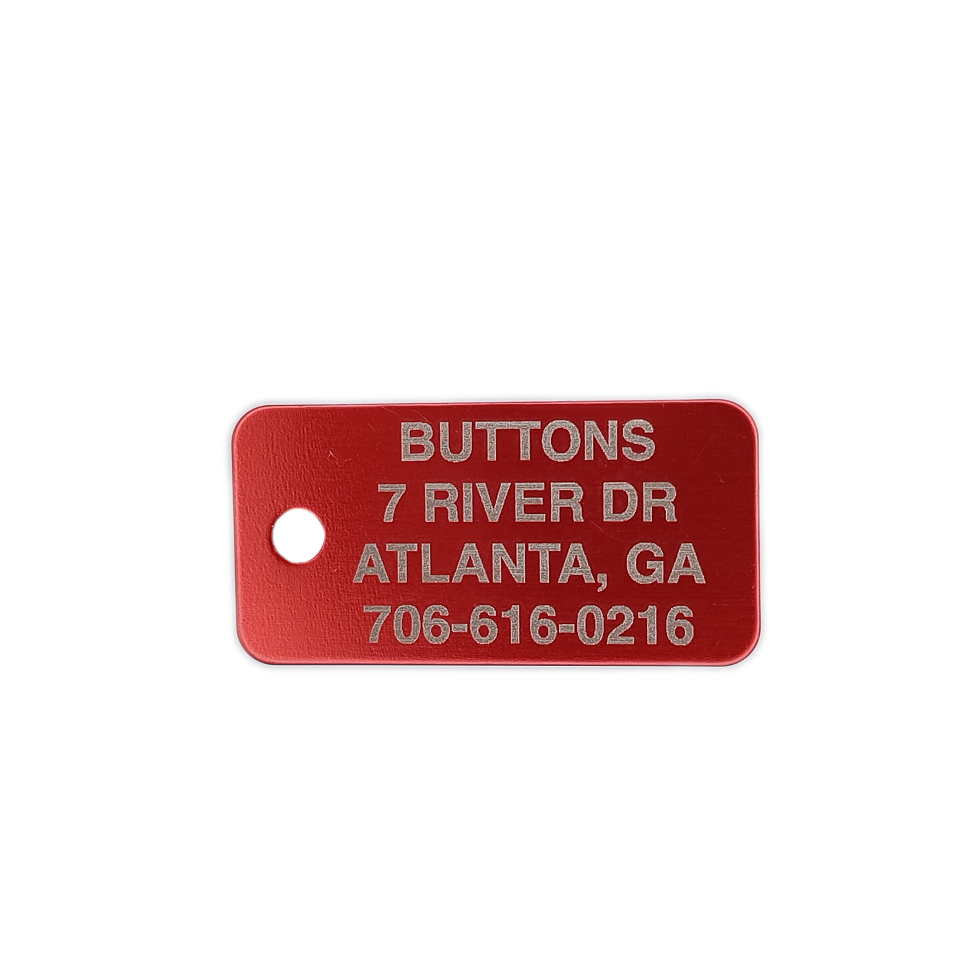This Red Rectangular Pet Tag is anodized aluminum that allows for 4 lines of text to be engraved lengthwise on the front and 4 lines of text to be engraved lengthwise on the back.