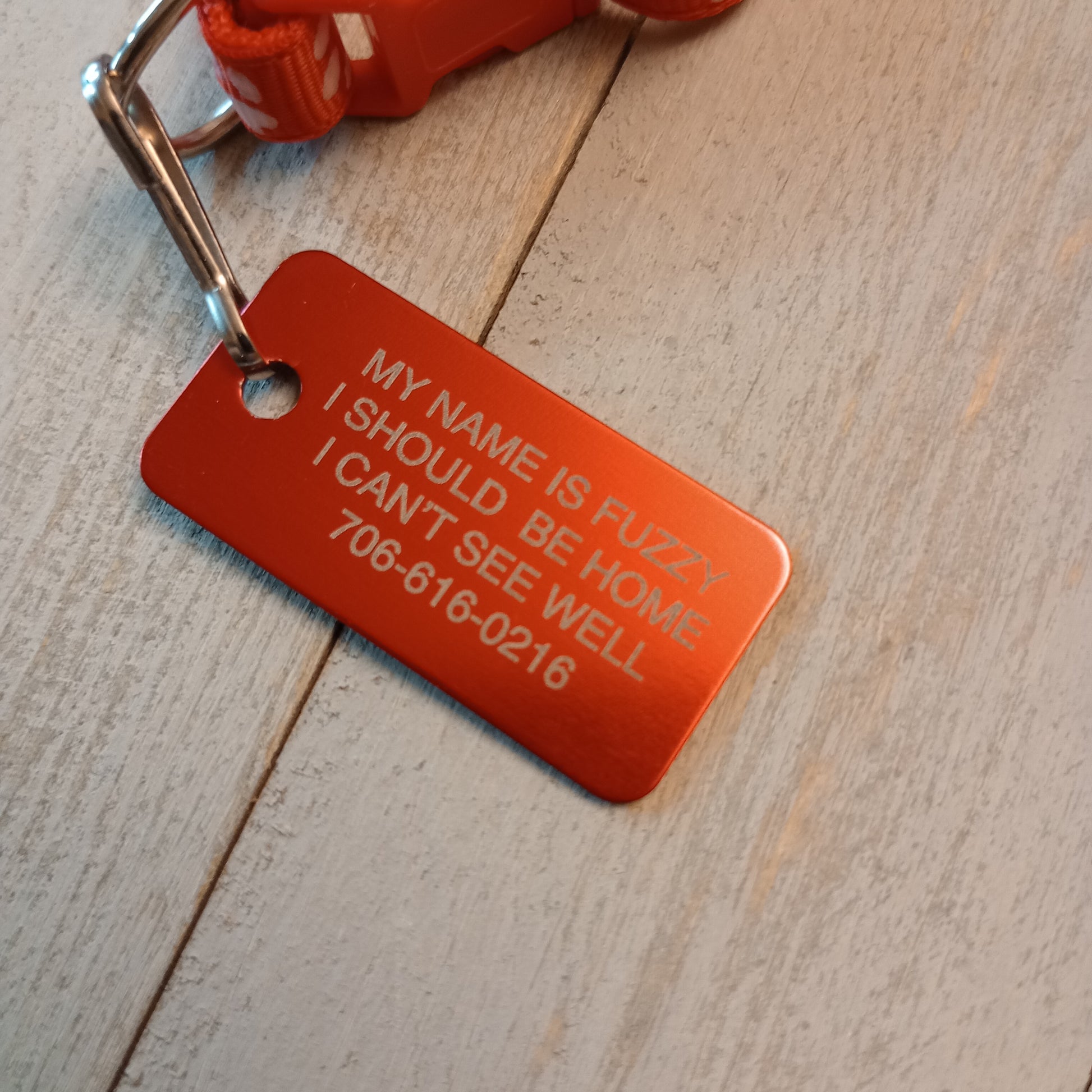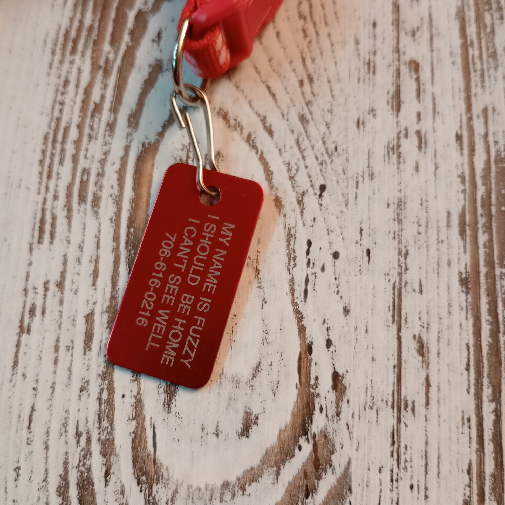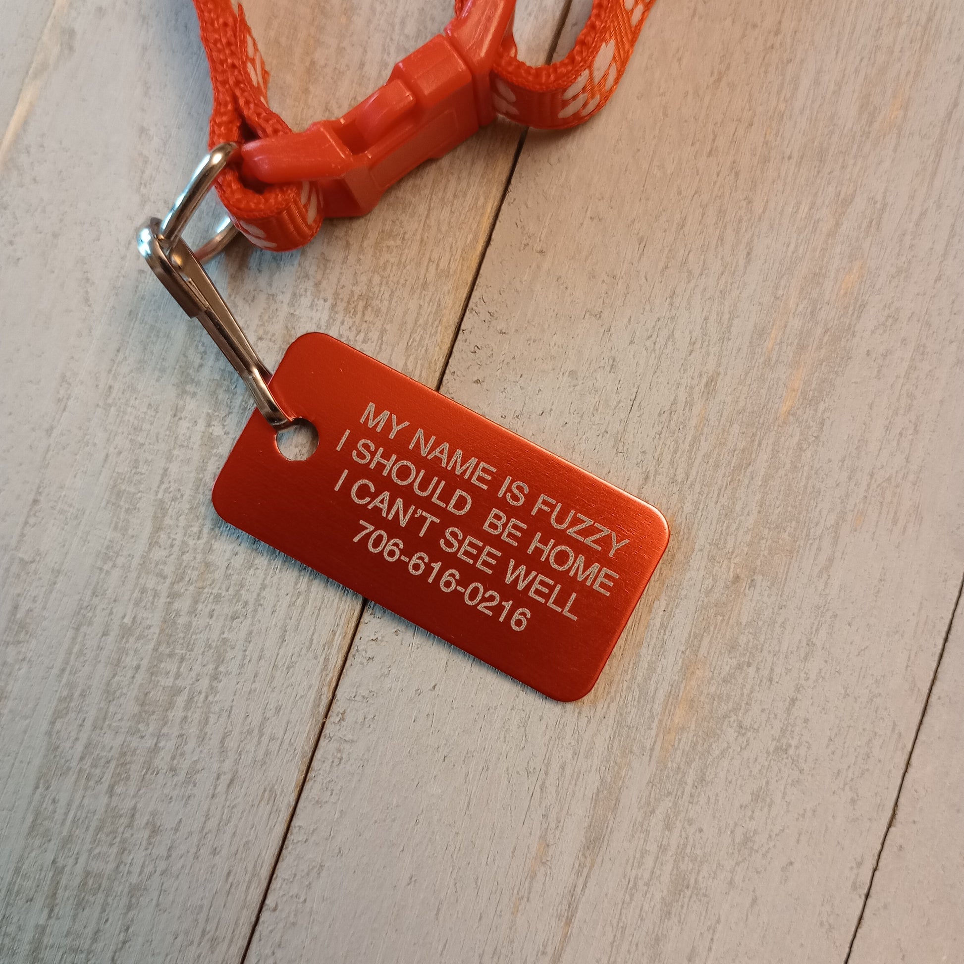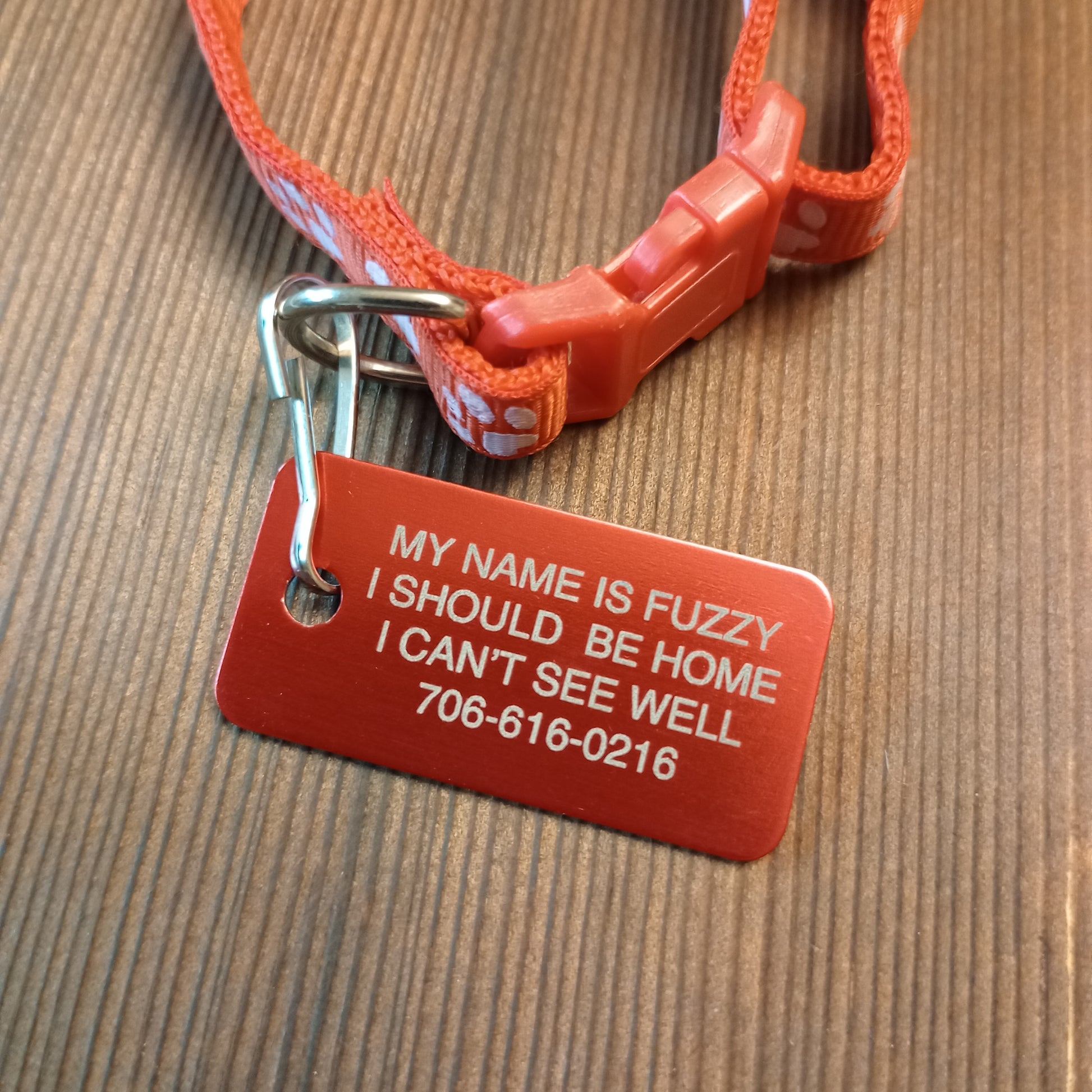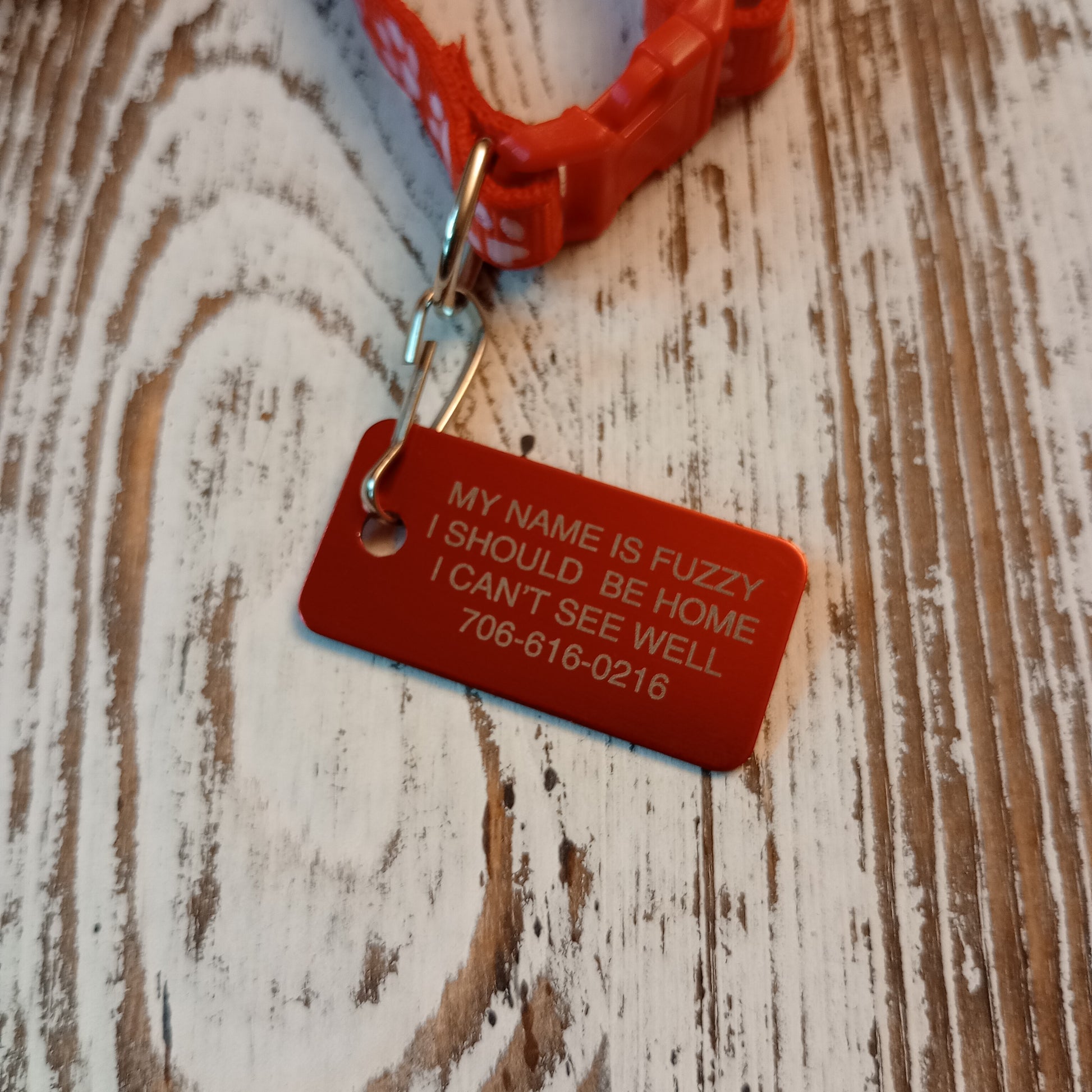 This Red Rectangular Pet Tag is anodized aluminum that allows for 4 lines of text to be engraved lengthwise on the front and 4 lines of text to be engraved lengthwise on the back.