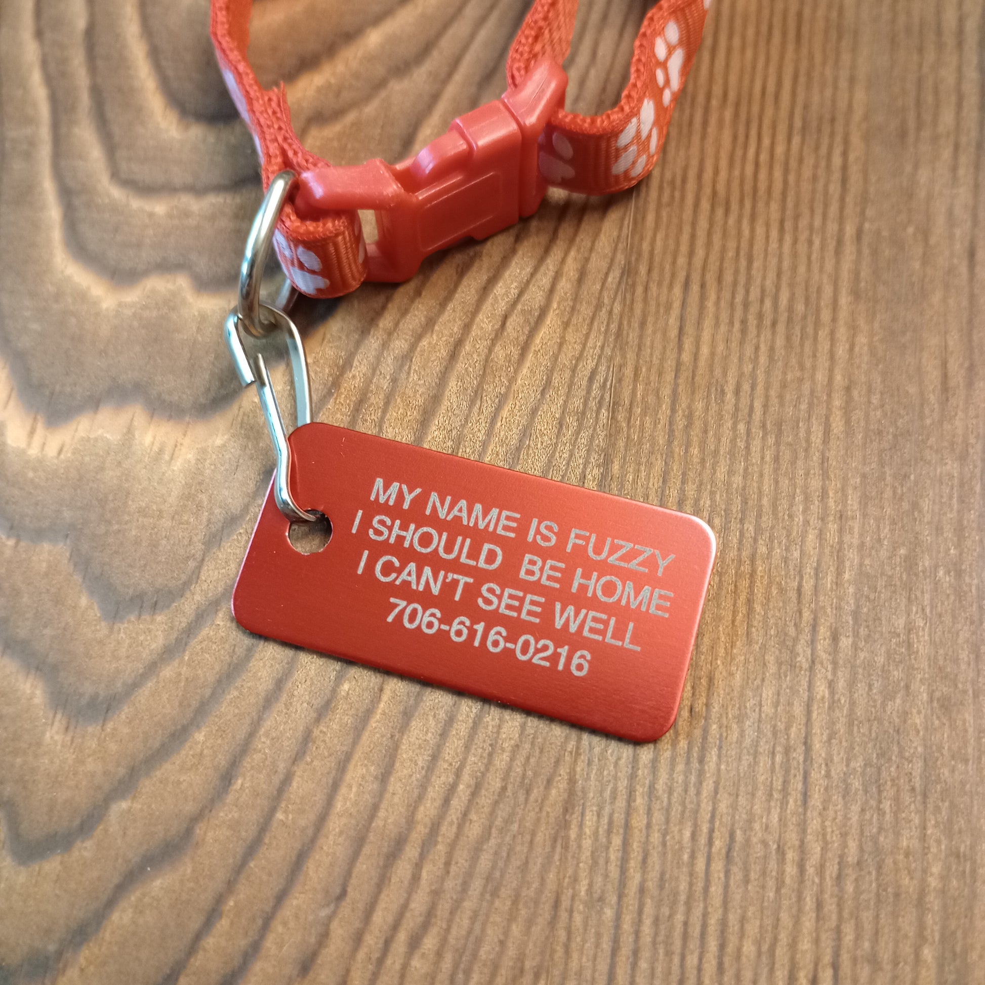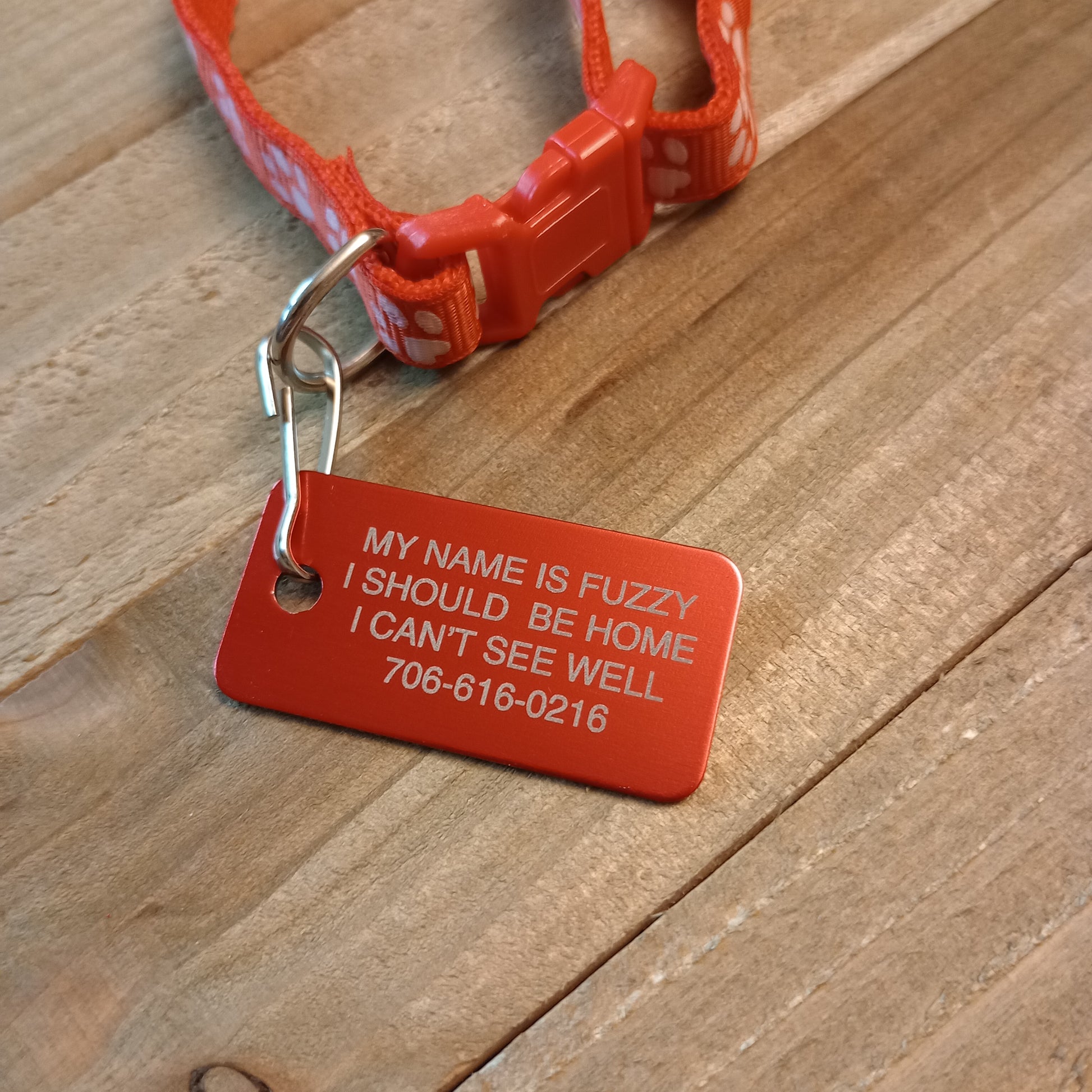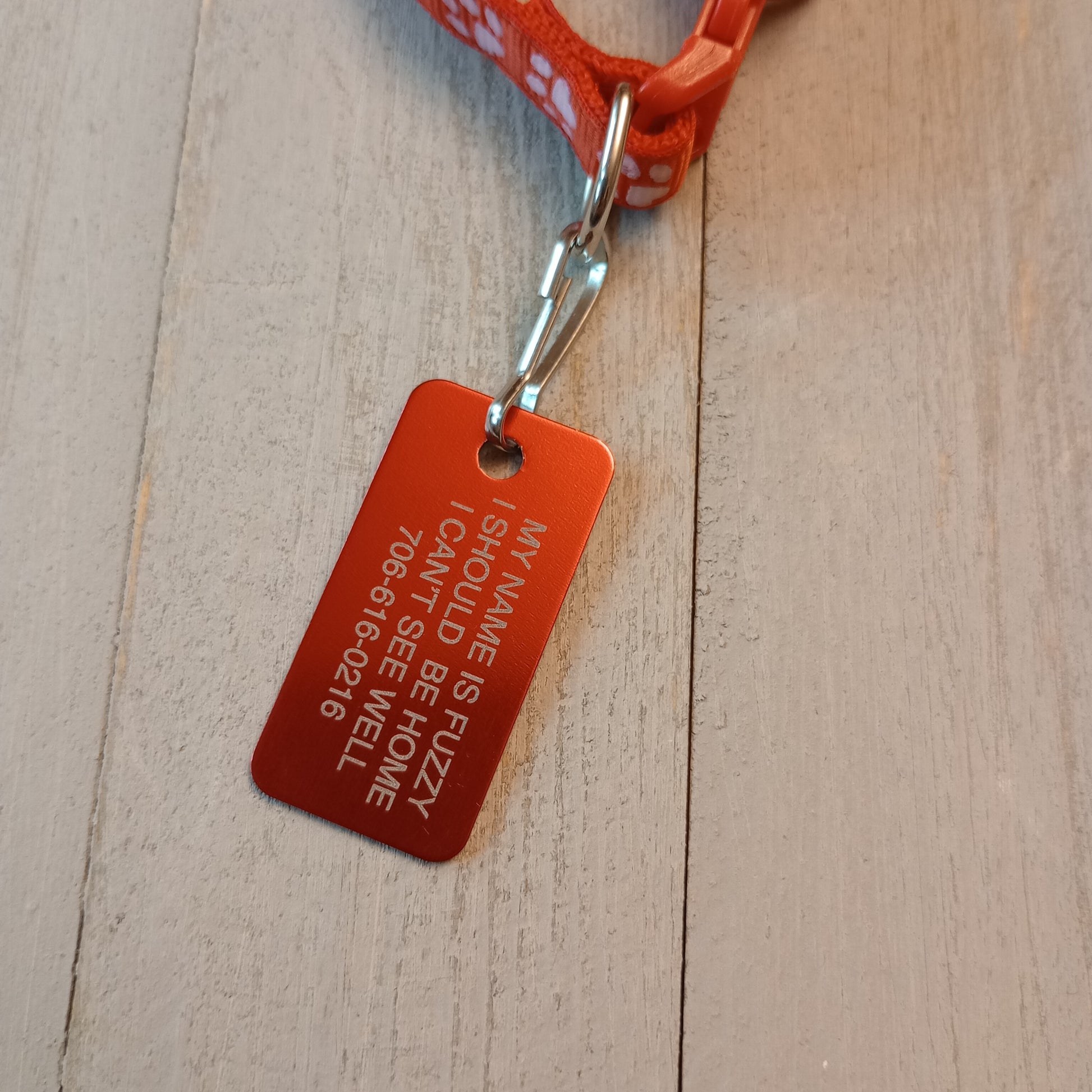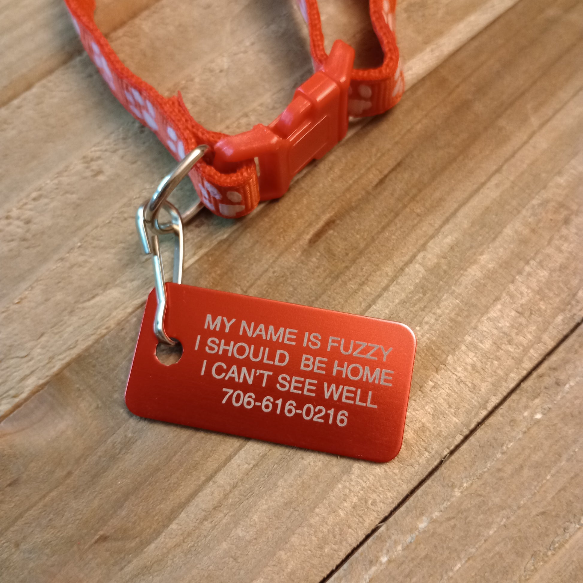 This Red Rectangular Pet Tag is anodized aluminum that allows for 4 lines of text to be engraved lengthwise on the front and 4 lines of text to be engraved lengthwise on the back.