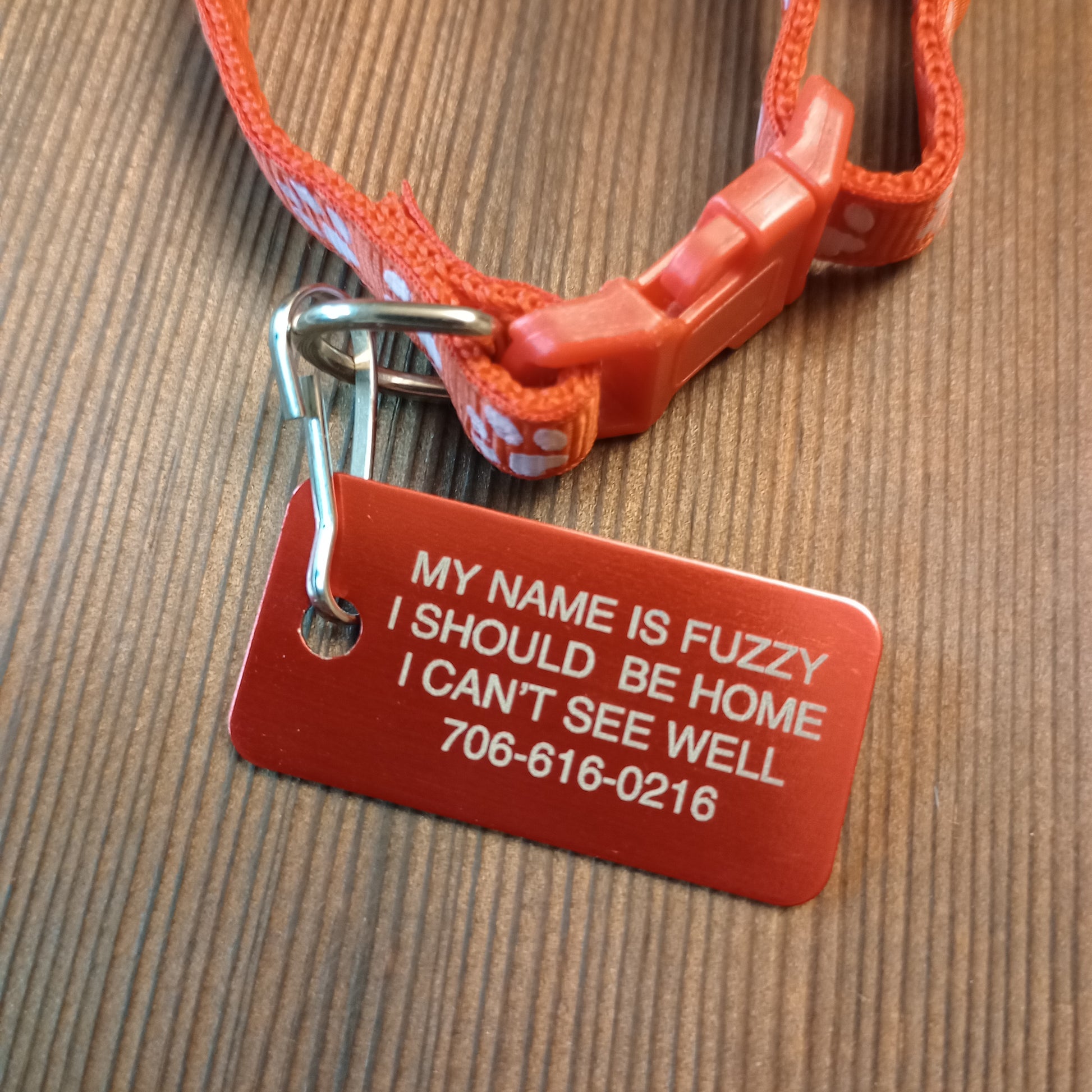 Making the name larger font size: If the tag allows for four lines and you use only three we will use the space from that extra line to make the name of the pet larger than the other lines of text.