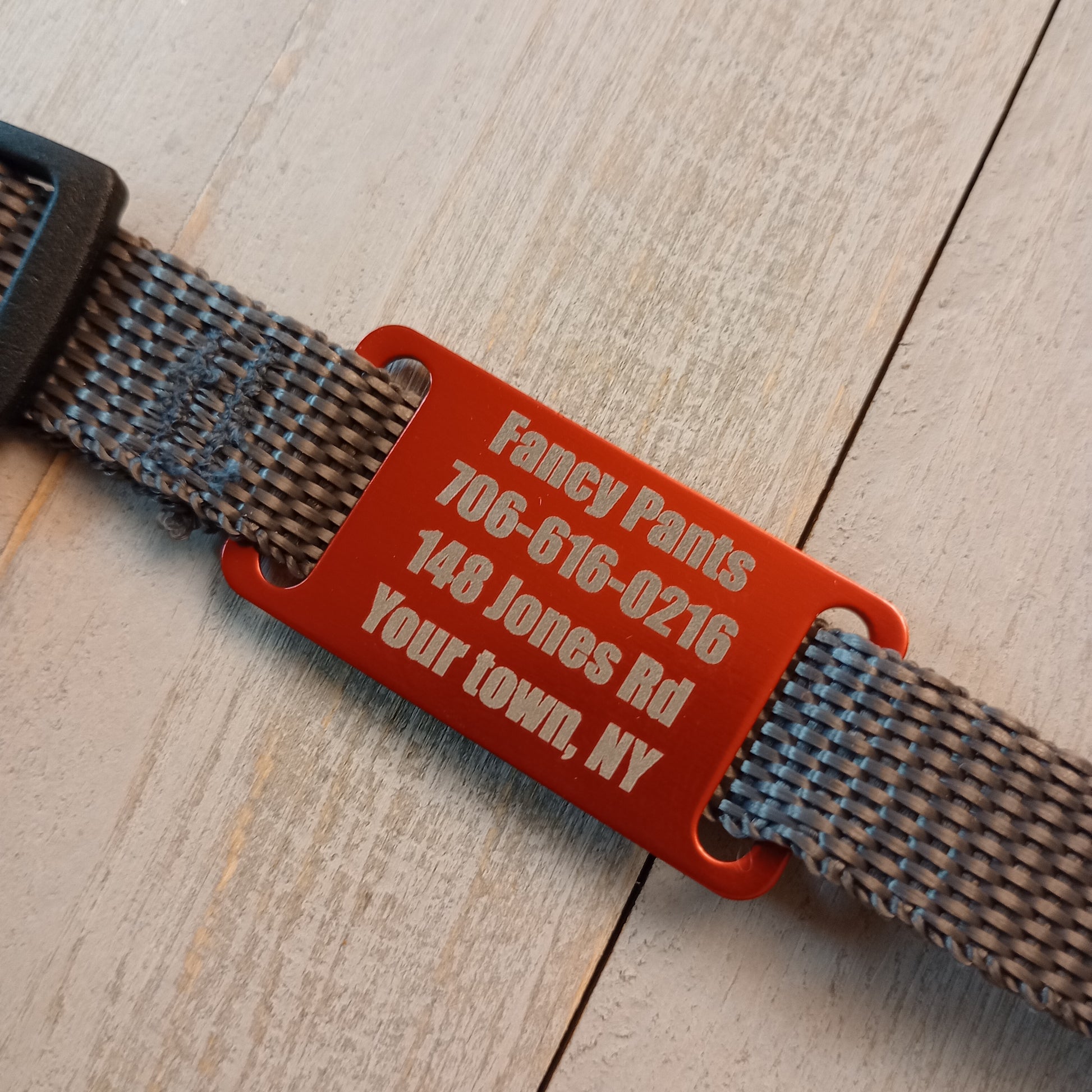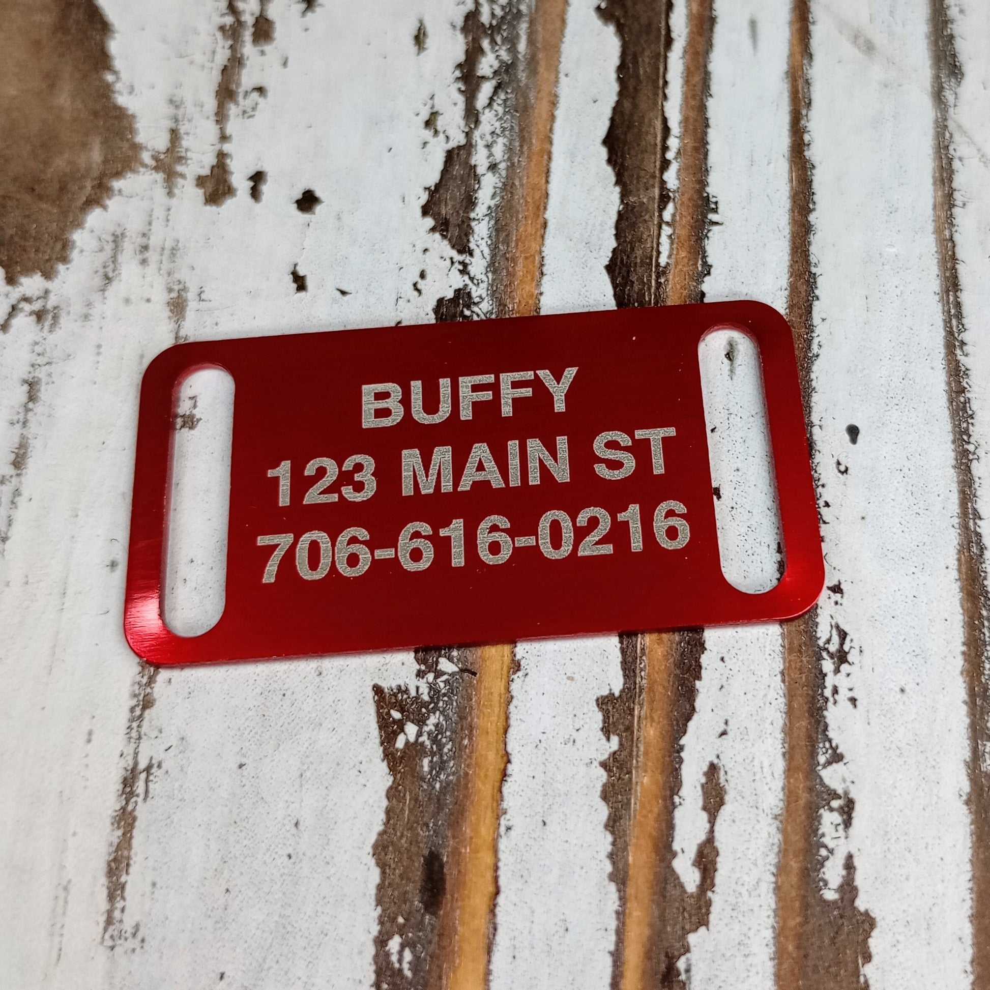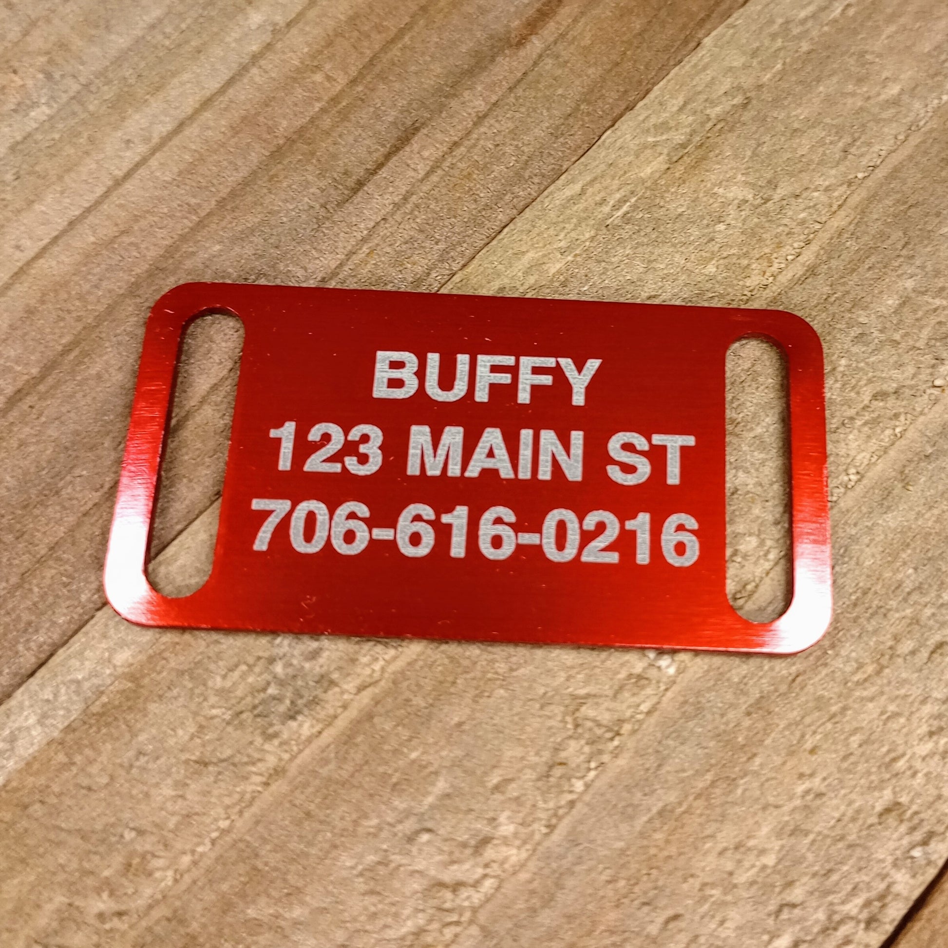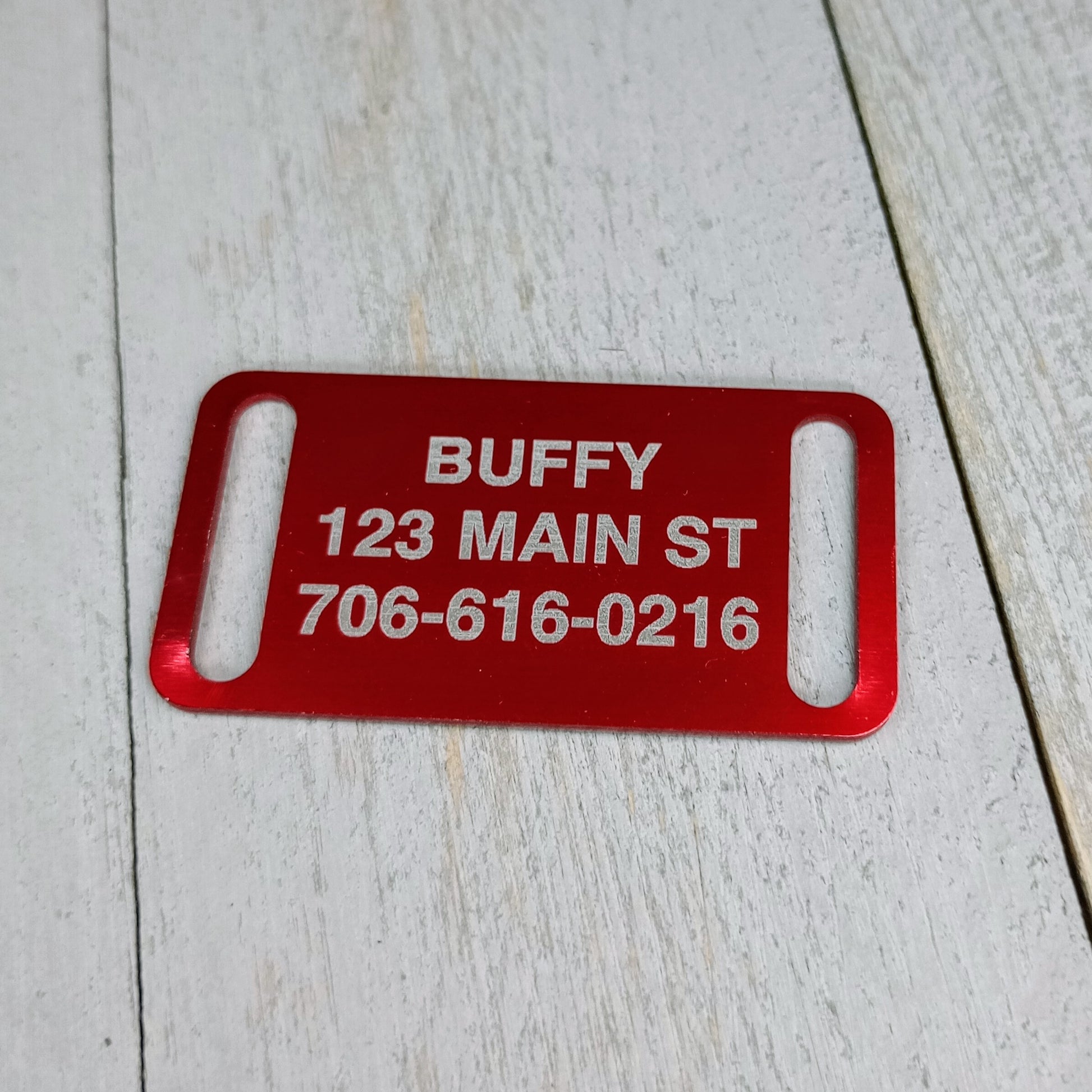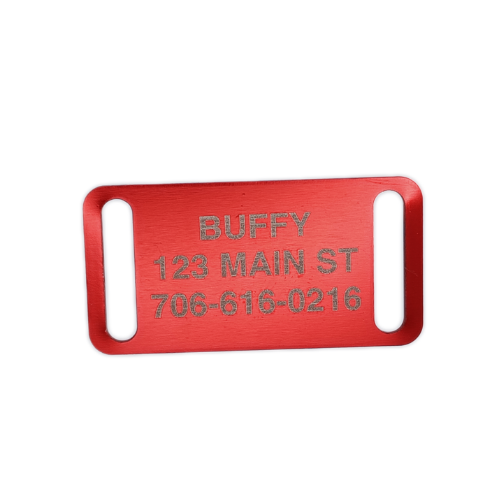 This Red Slide-On Pet Tag is anodized aluminum that allows for 4 lines of text on the front. This tag will slide on a collar that is 3/4 inch wide or less.