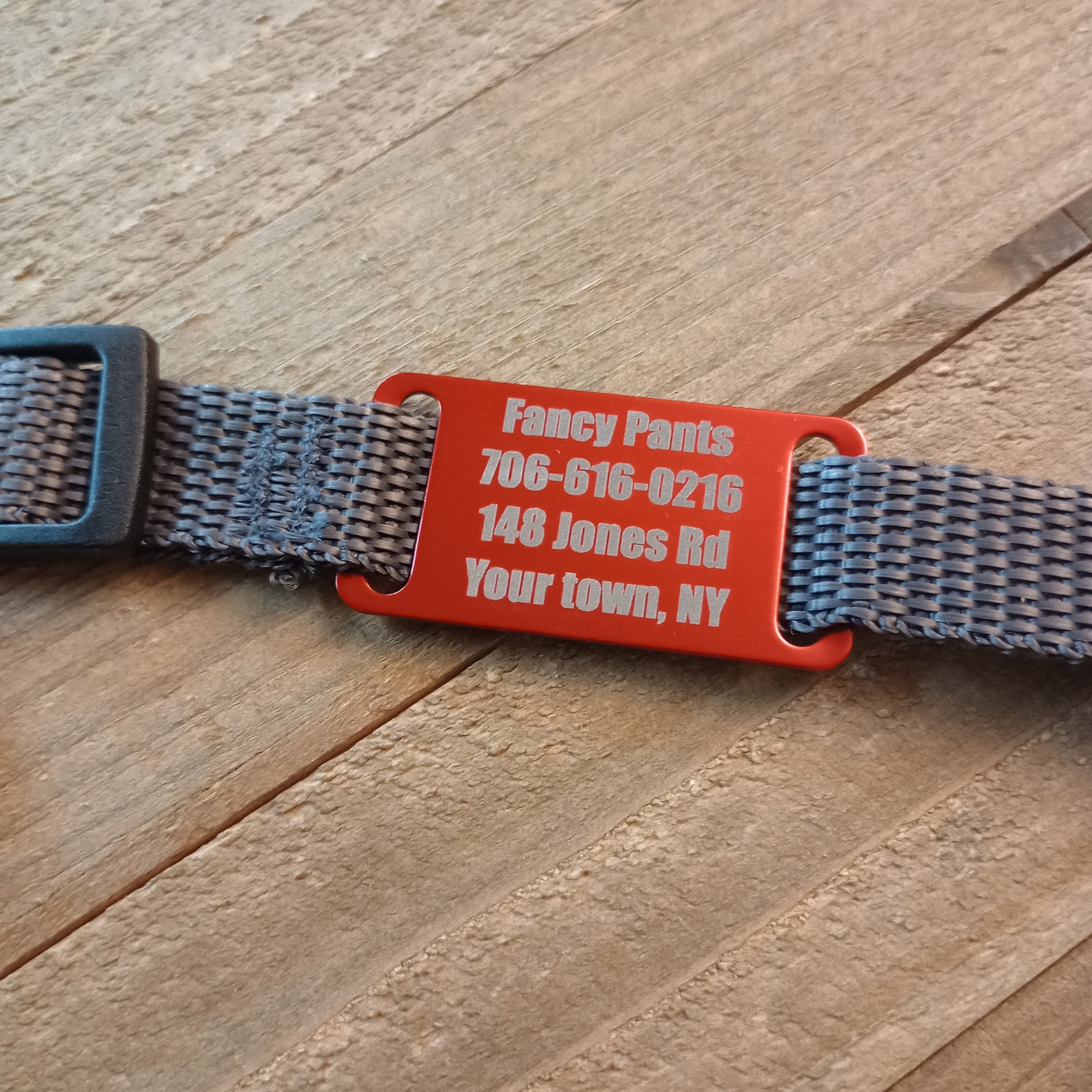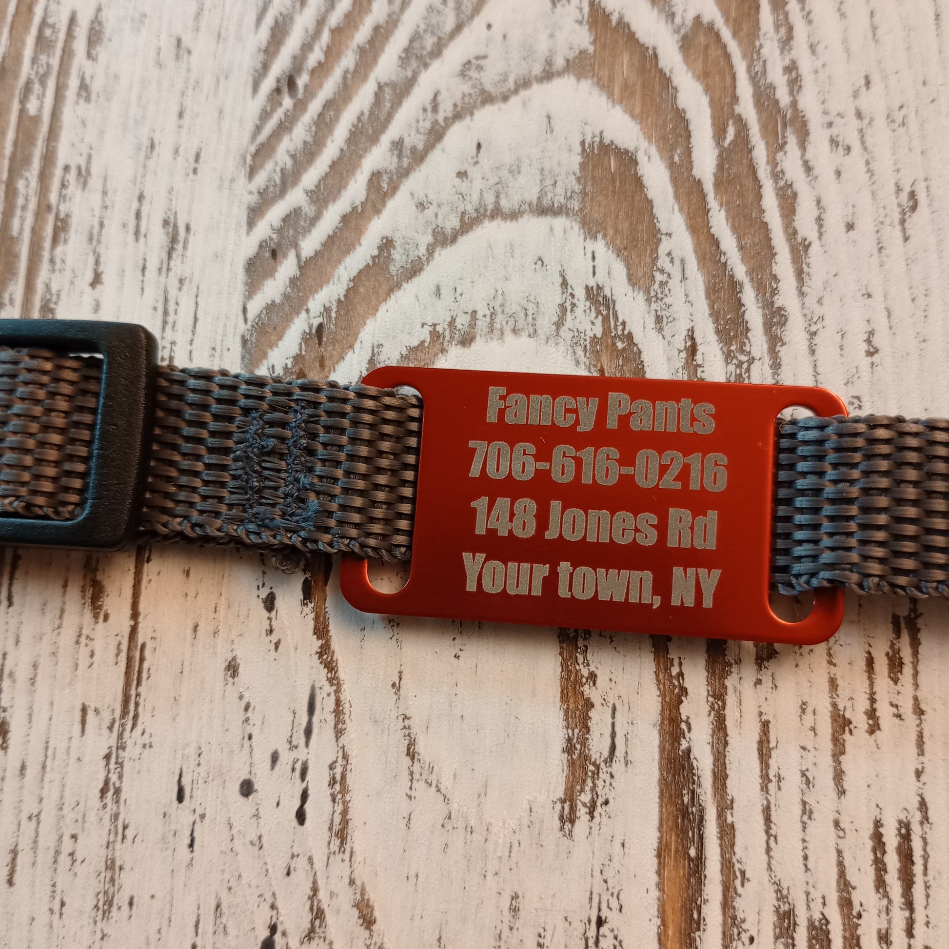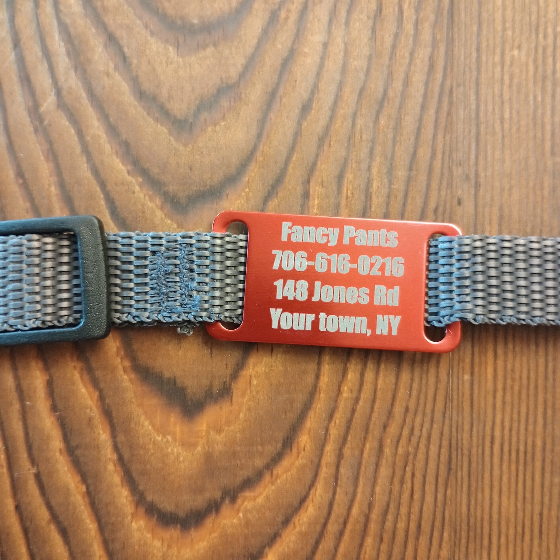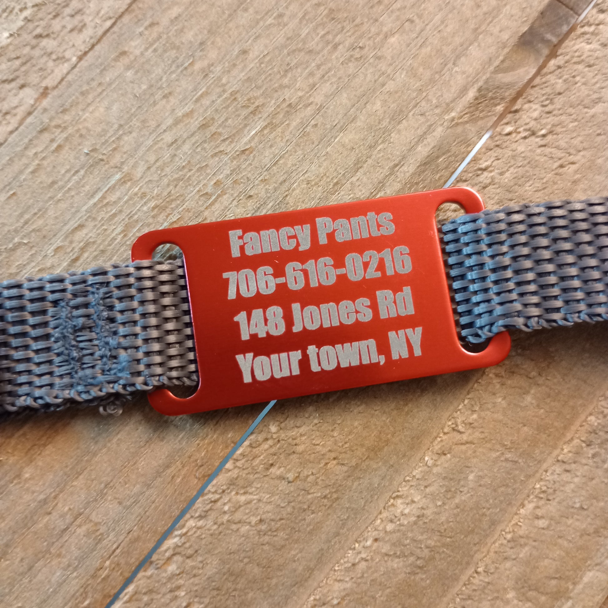 This Red Slide-On Pet Tag is anodized aluminum that allows for 4 lines of text on the front. This tag will slide on a collar that is 3/4 inch wide or less.