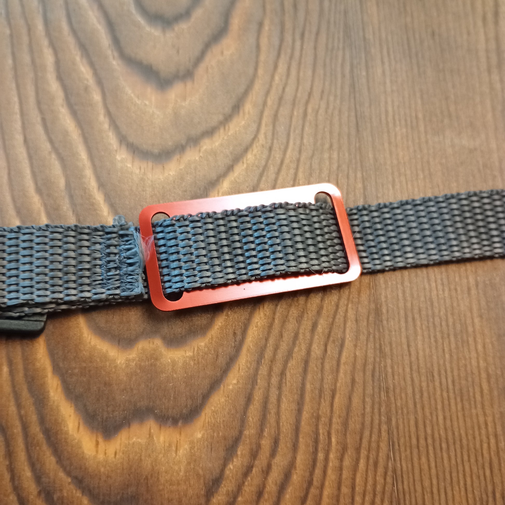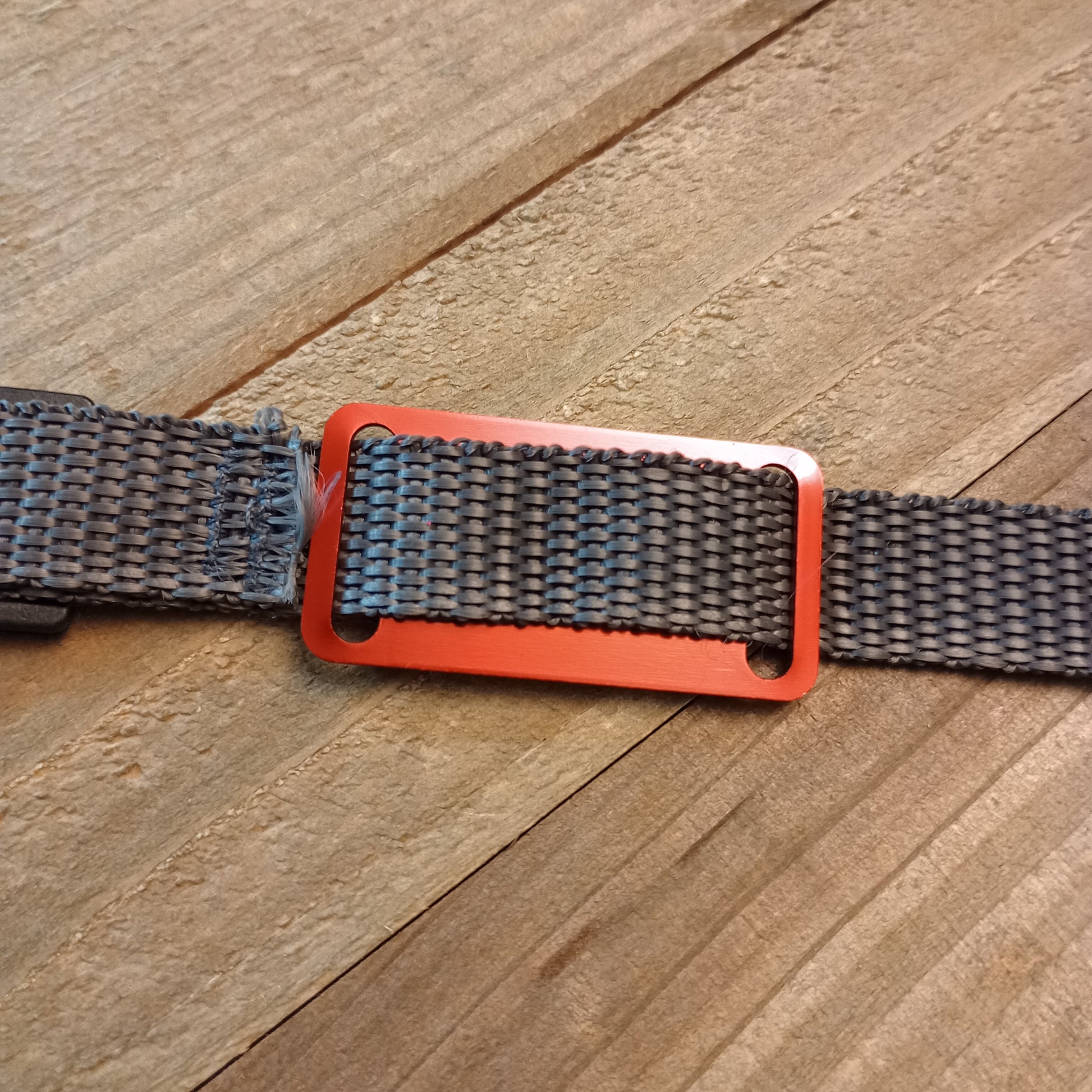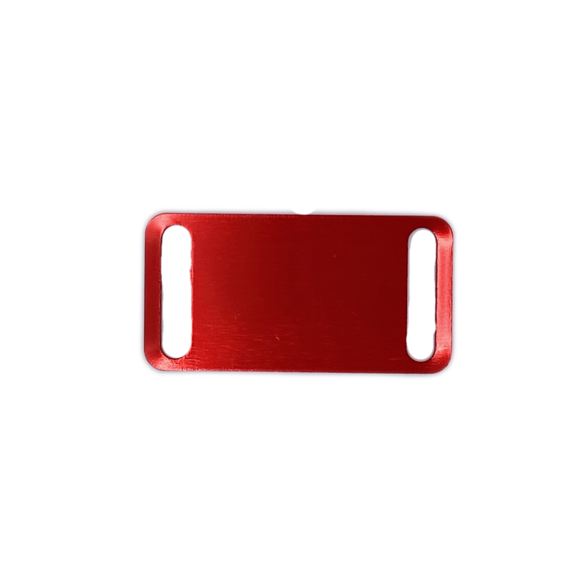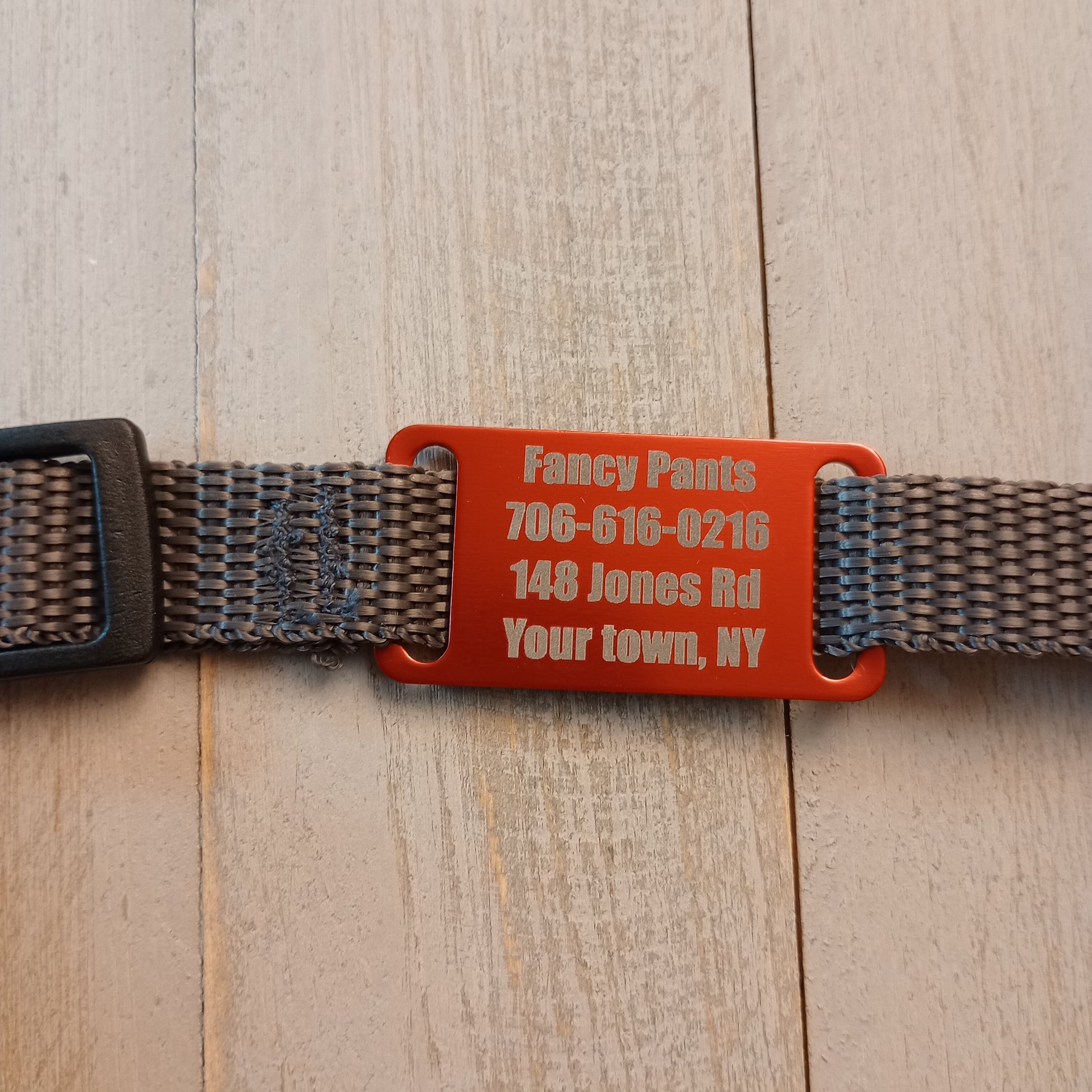This Red Slide-On Pet Tag is anodized aluminum that allows for 4 lines of text on the front. This tag will slide on a collar that is 3/4 inch wide or less.