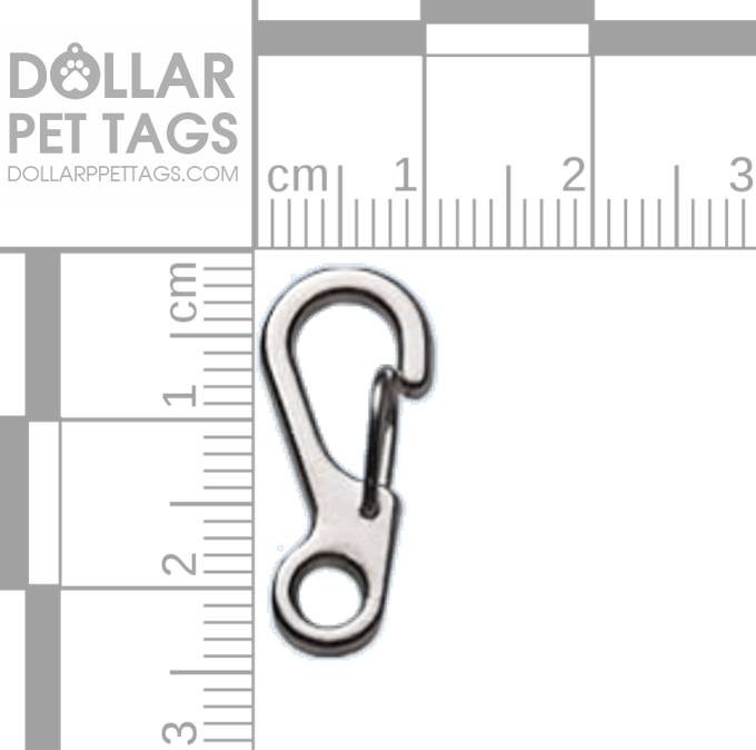 This silver colored mini spring clip carabiner is made of a zinc alloy and electroplated. The spring clip allows this to be easily removed or put on a leash or collar. The opening of the clip is about 6 mm which is a little less than a quarter of an inch.