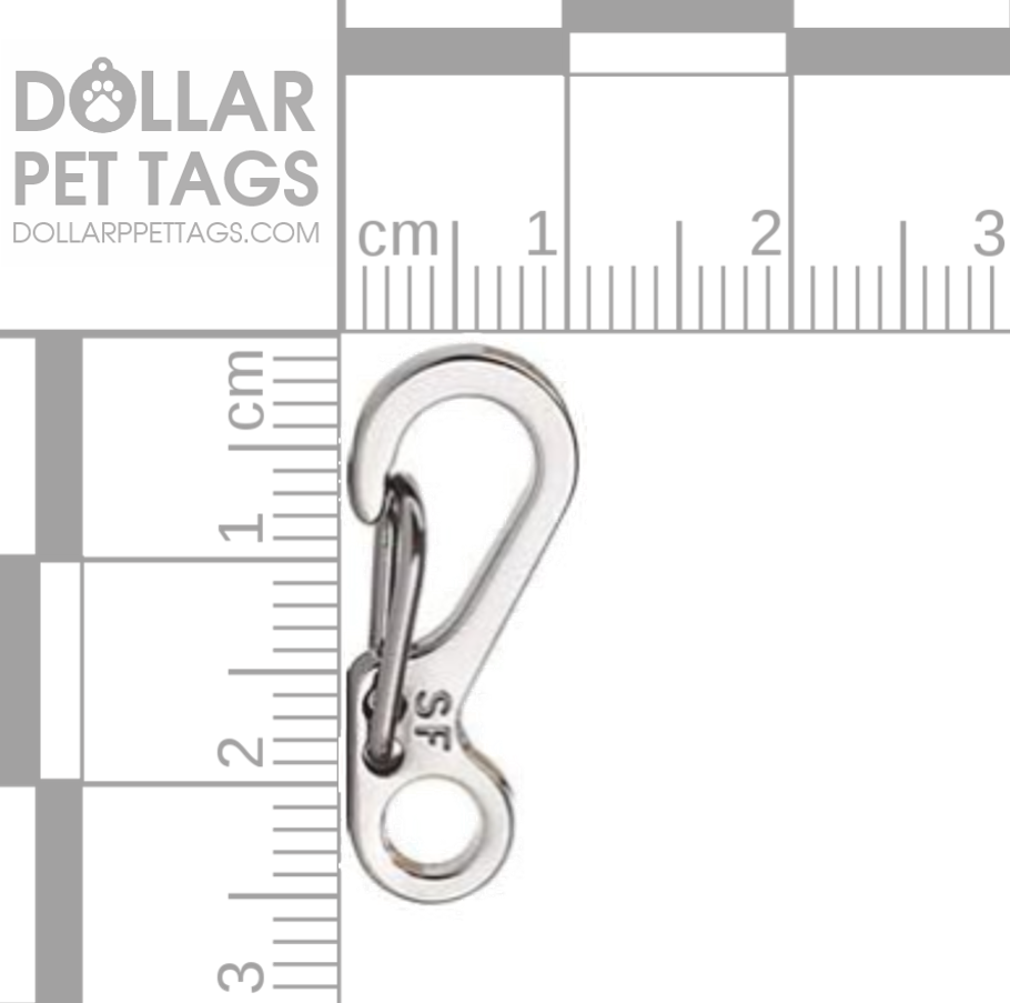 This silver colored SF mini spring clip carabiner is made of aluminum allow with a nickel-free plating. The spring clip allows this to be easily removed or put on a leash or collar. The opening of the clip is about 7 mm which is about 1/4 inch.