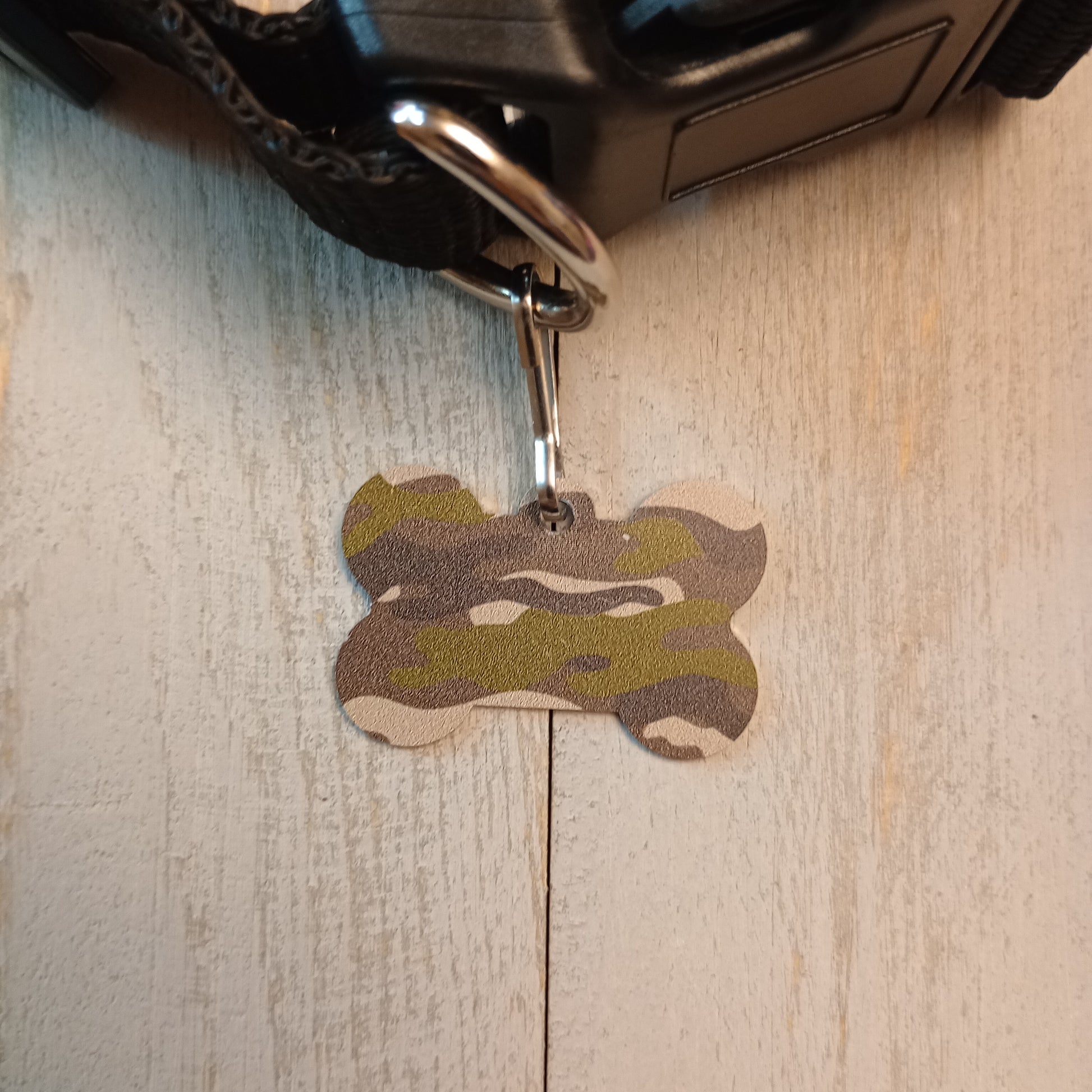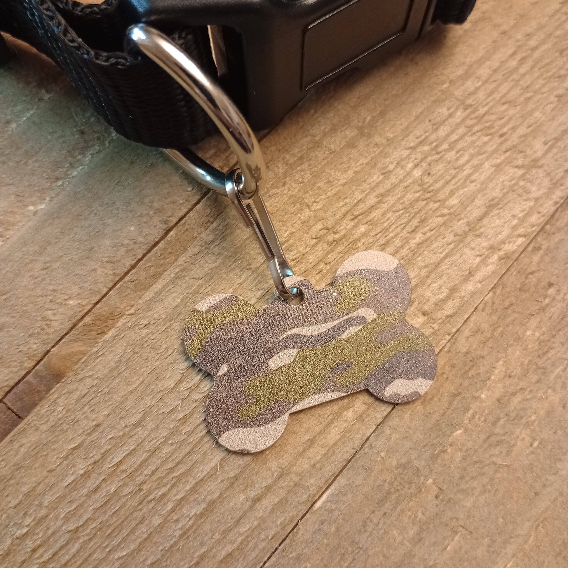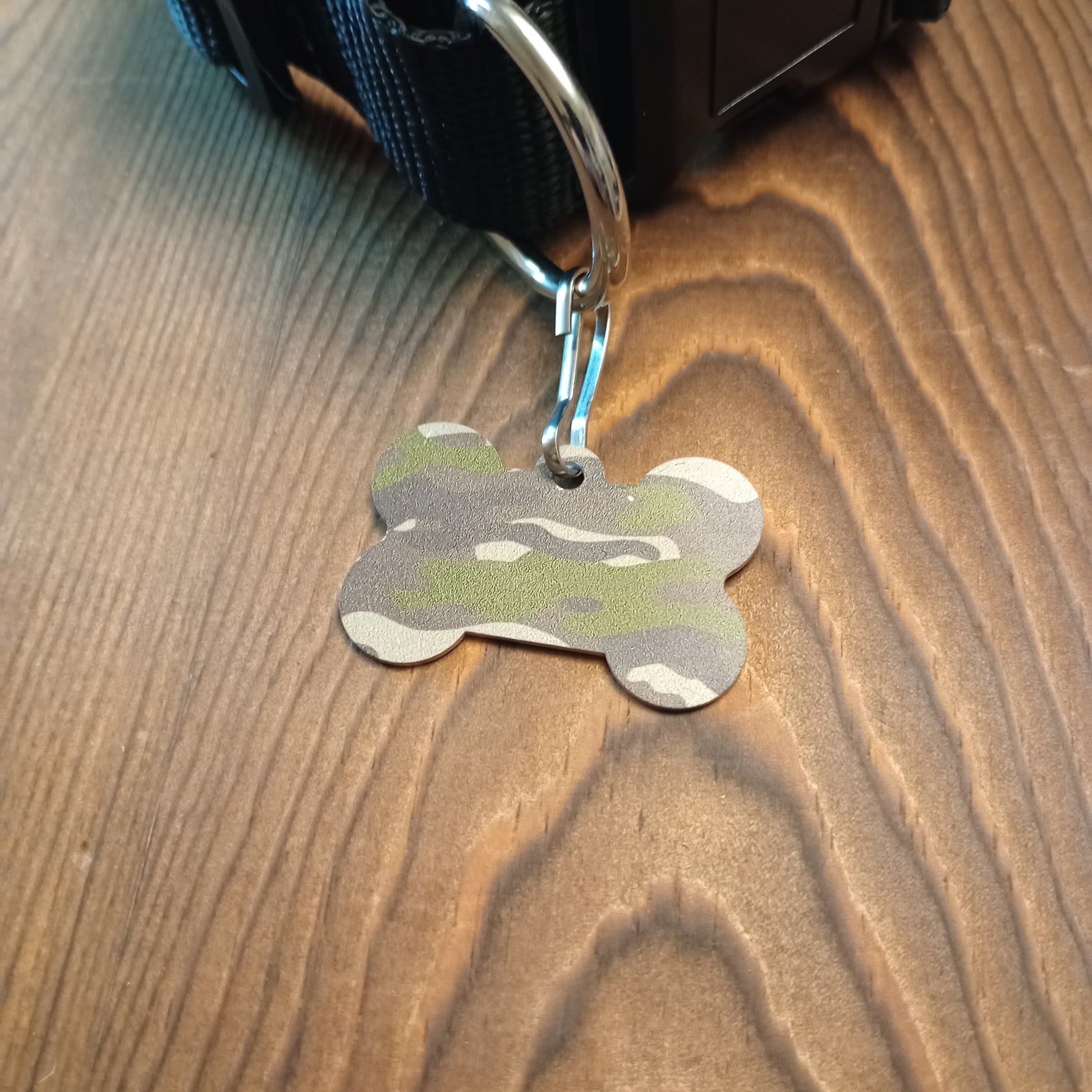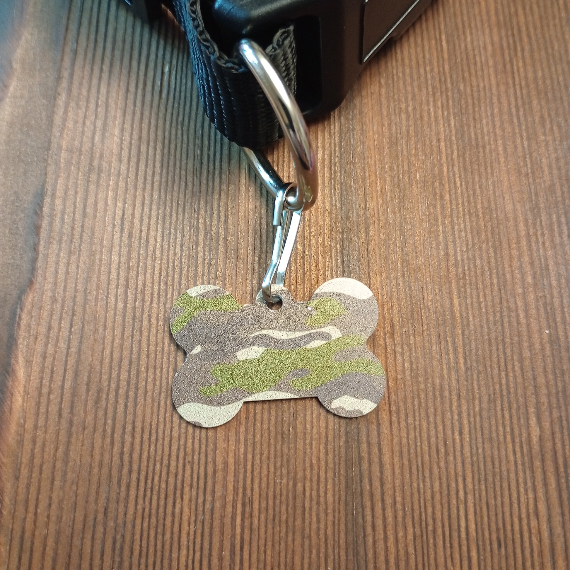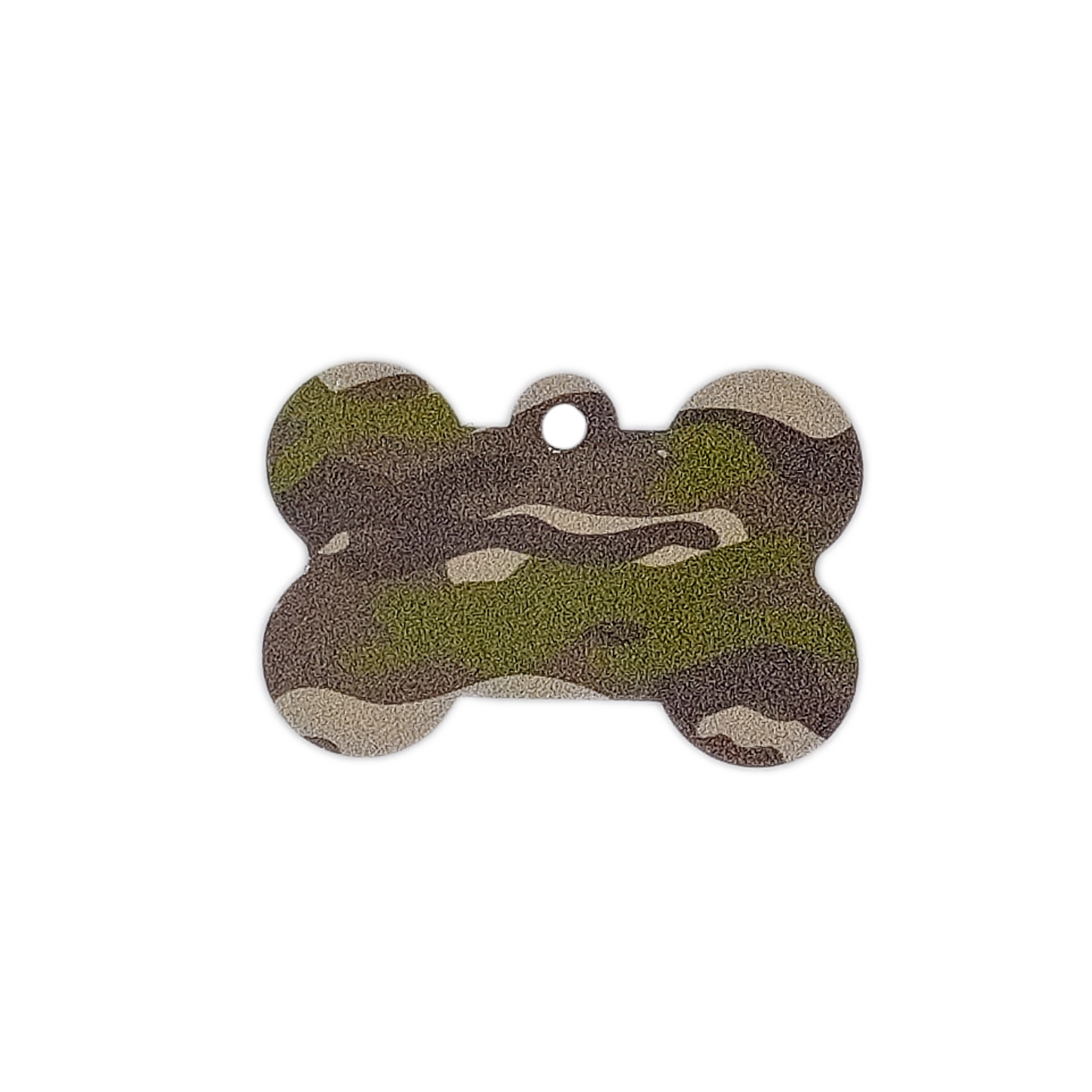 This Woodland Green Camouflage Bone Shaped Pet Tag is anodized aluminum that allows for 4 lines of text on the back only. The back of the tag is silver colored with no camouflage design.