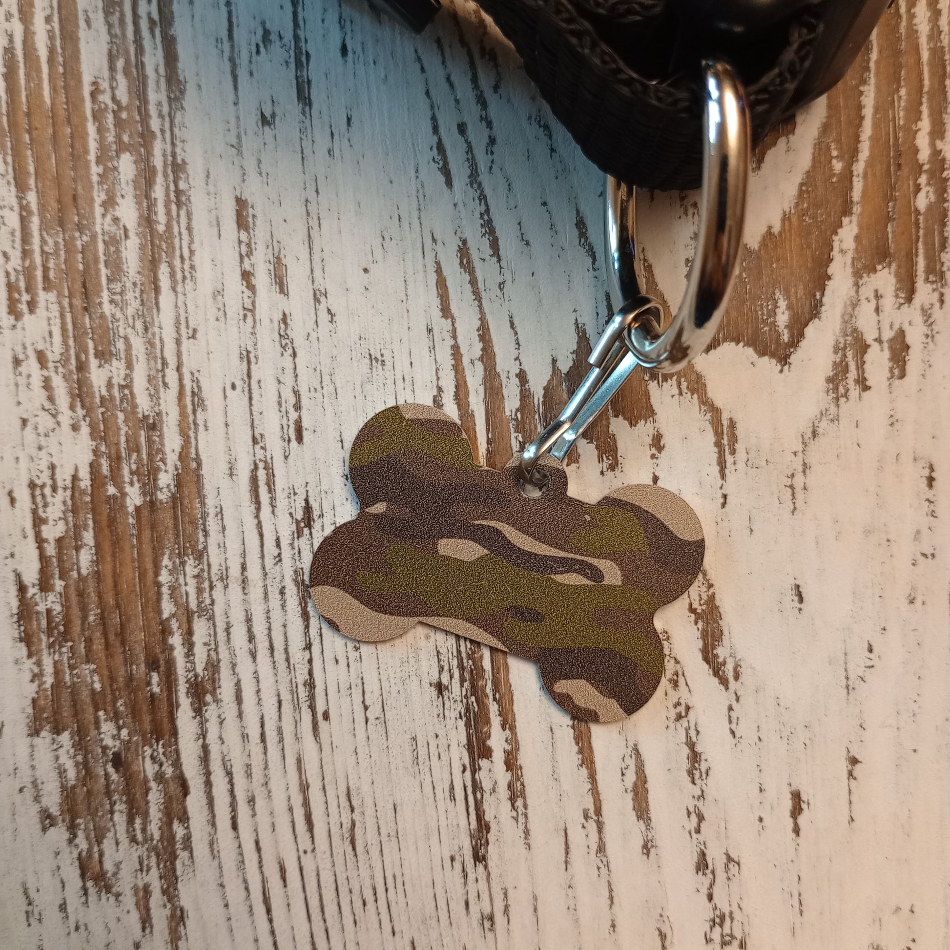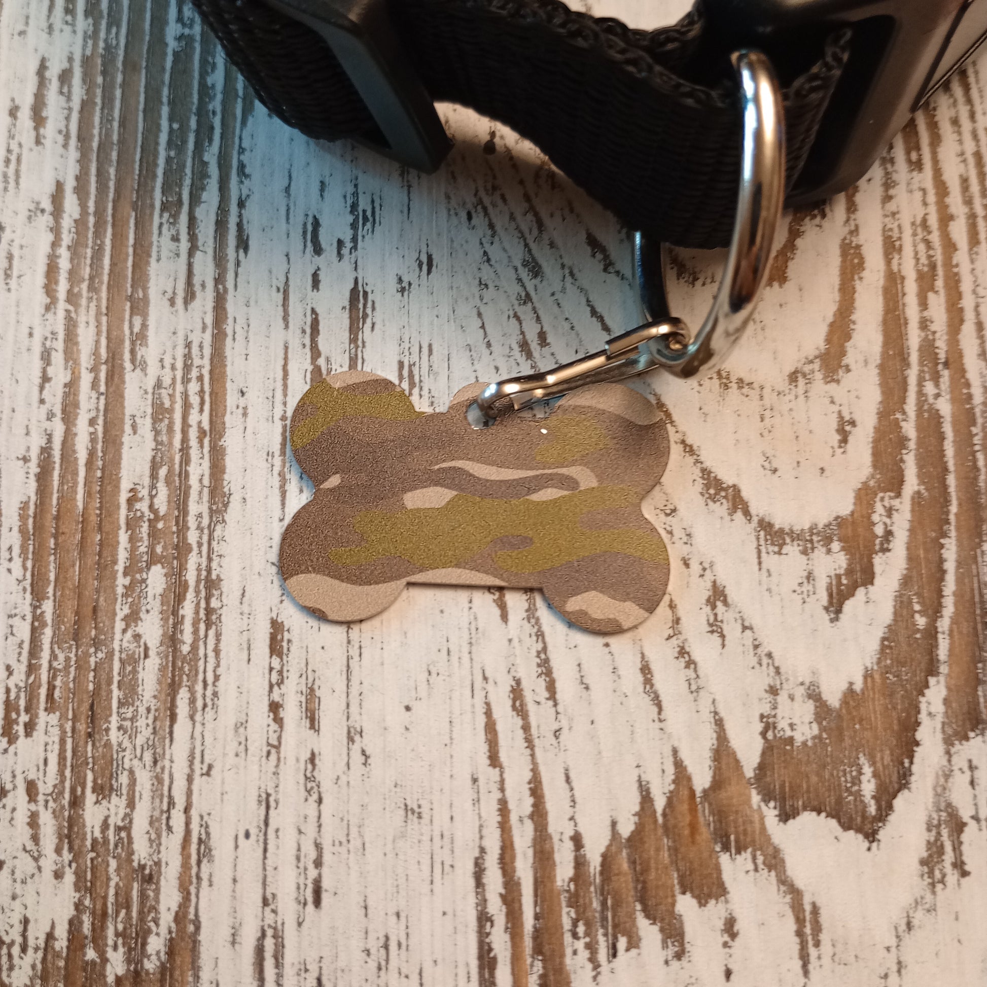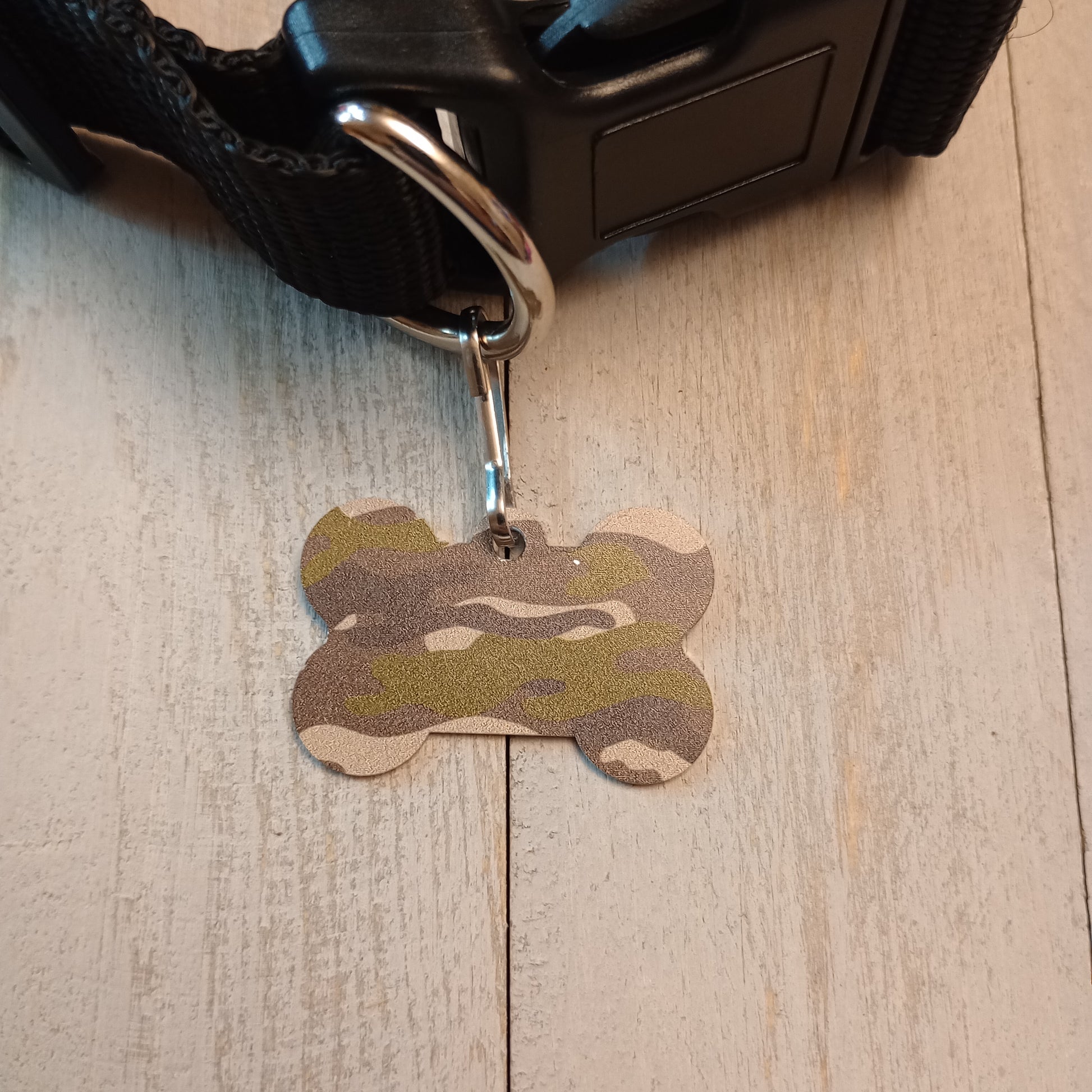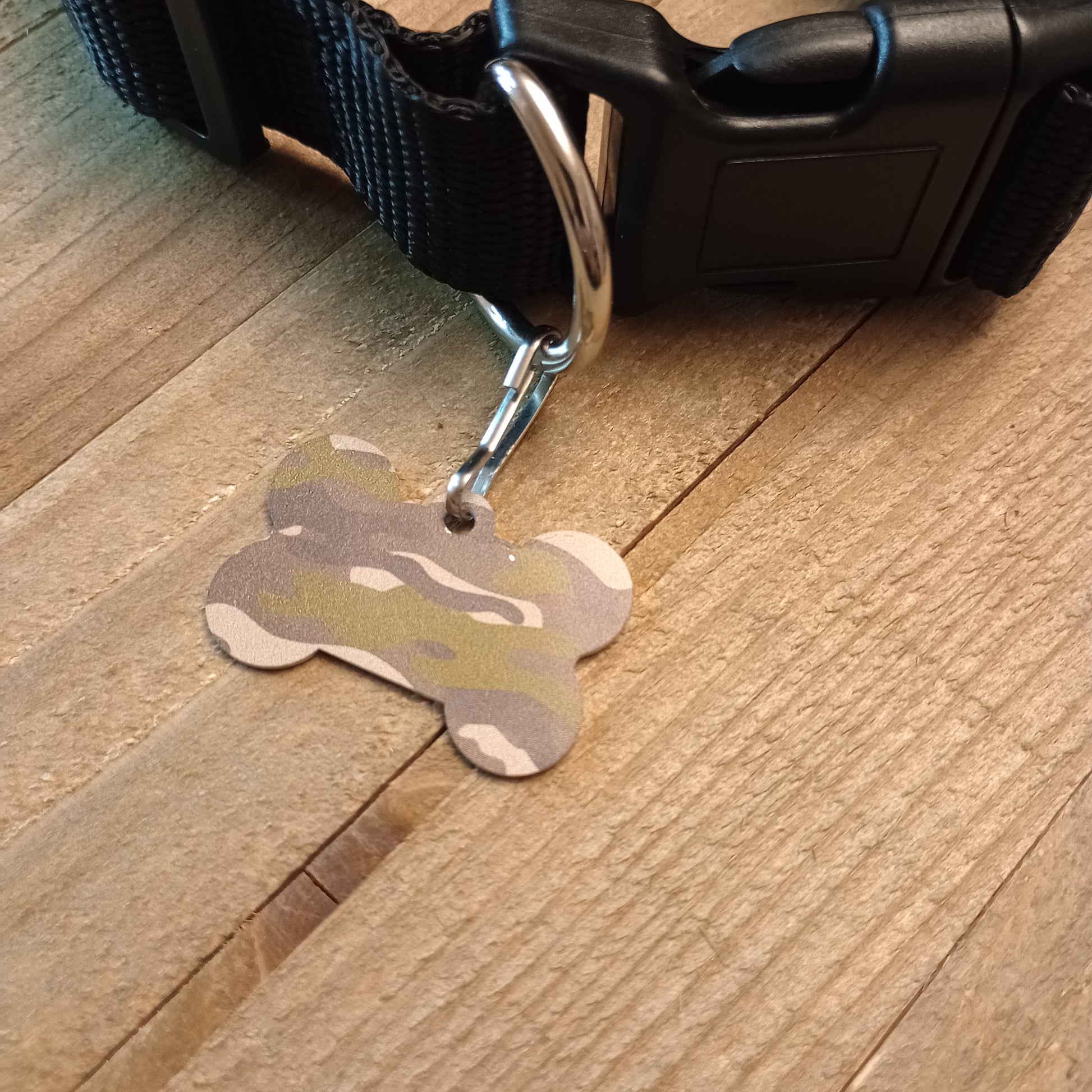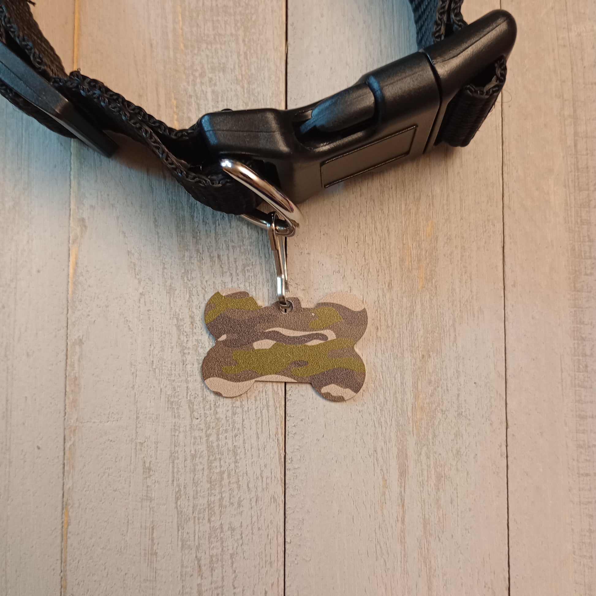 This Woodland Green Camouflage Bone Shaped Pet Tag is anodized aluminum that allows for 4 lines of text on the back only. The back of the tag is silver colored with no camouflage design.