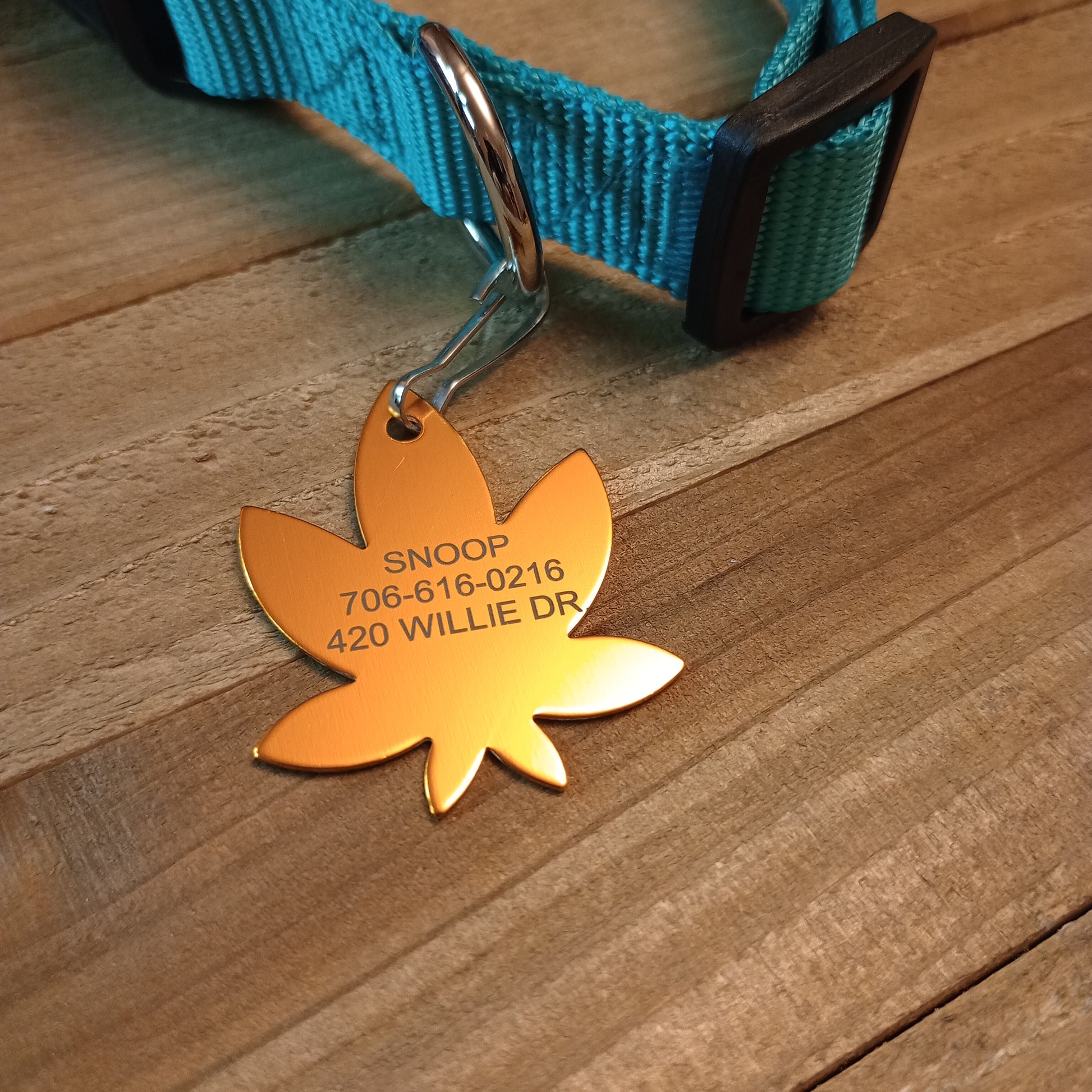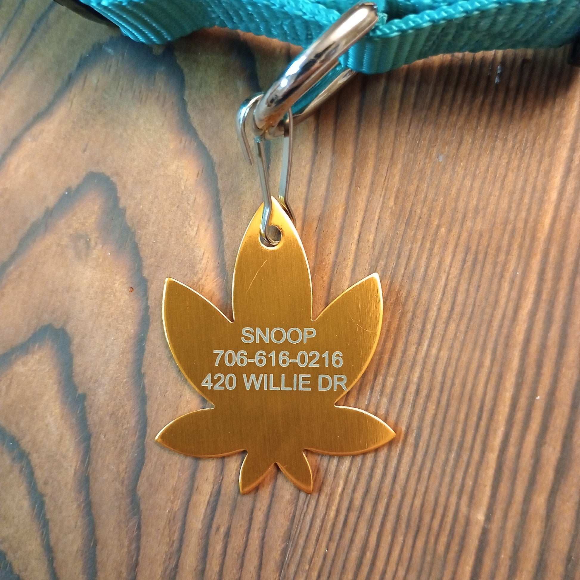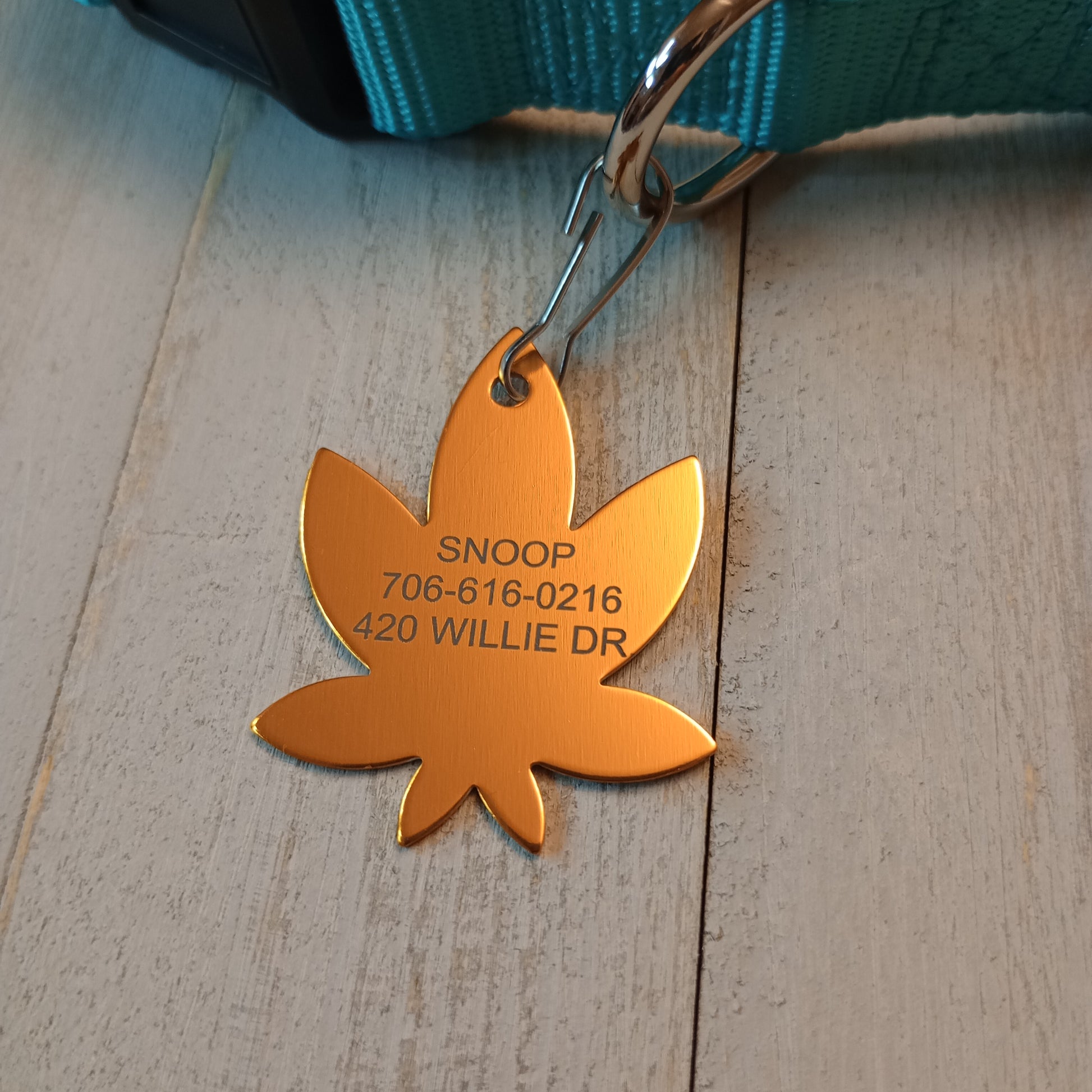 This Yellow 420 Friendly Style Pet Tag is anodized aluminum that allows for 3 lines of text to be engraved on the front and 3 lines of text to be engraved on the back. The shape of the pet tag resembles a marijuana leaf.
