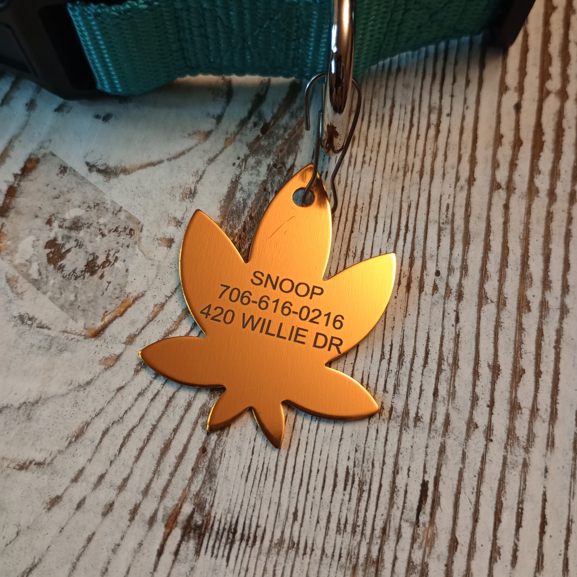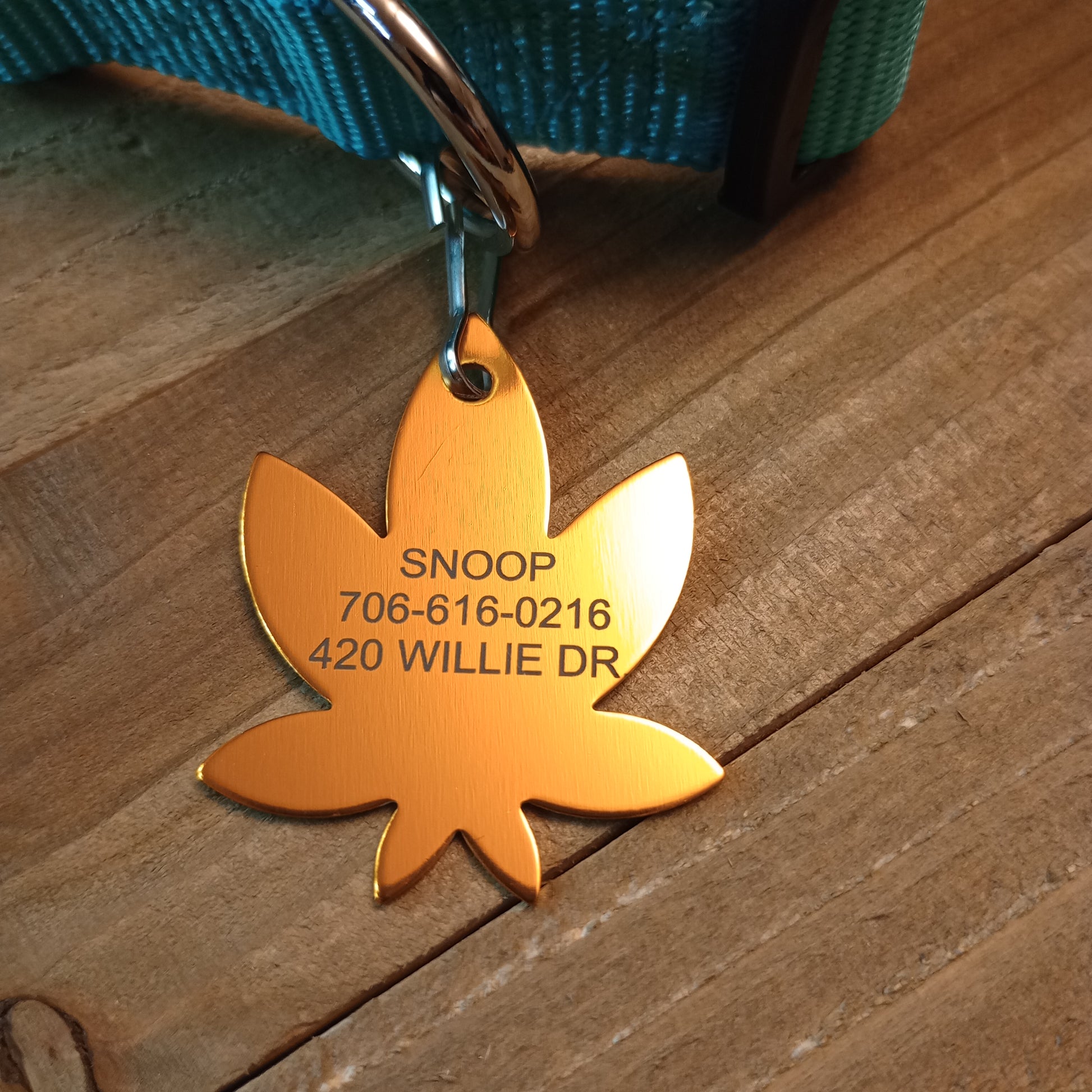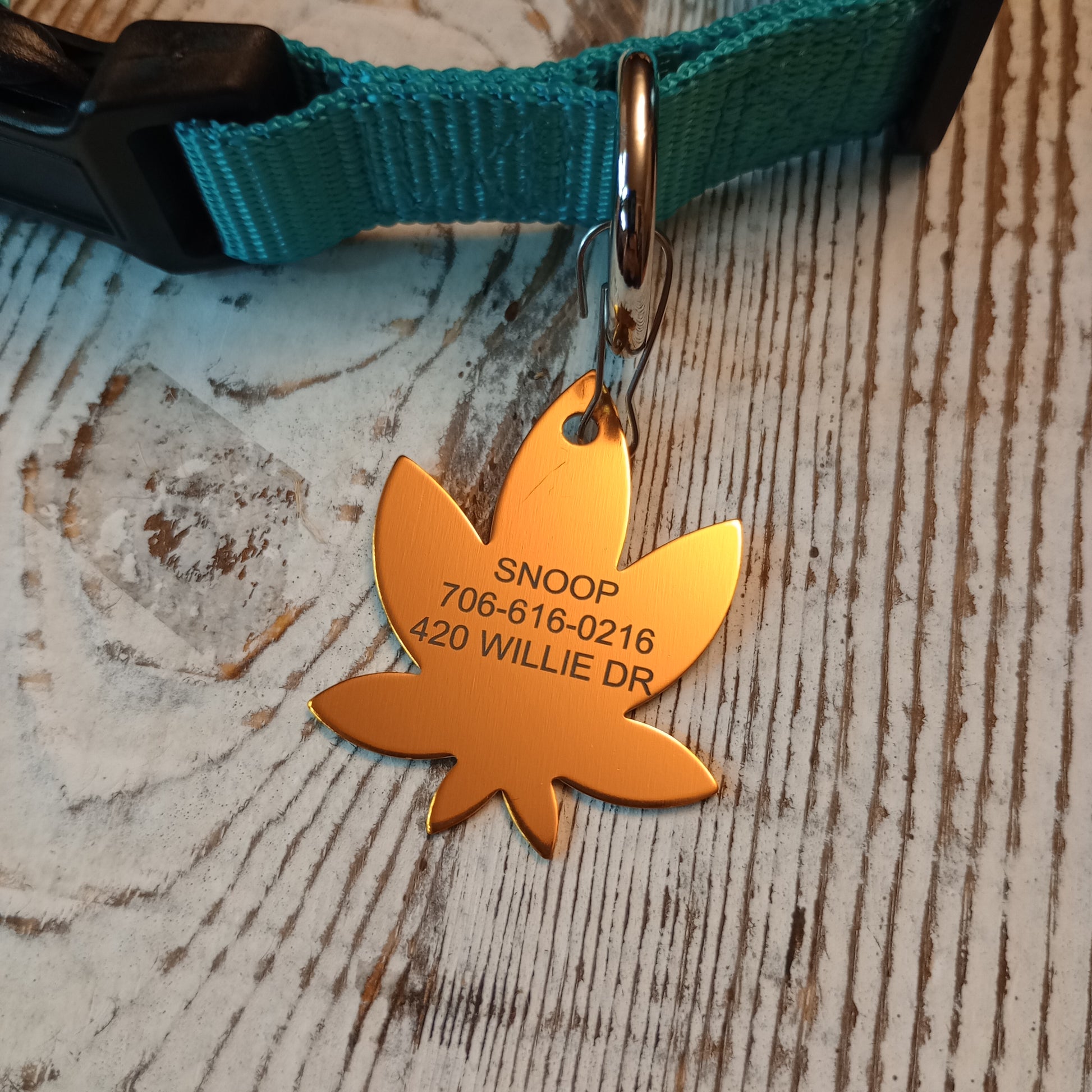 This Yellow 420 Friendly Style Pet Tag is anodized aluminum that allows for 3 lines of text to be engraved on the front and 3 lines of text to be engraved on the back. The shape of the pet tag resembles a marijuana leaf.