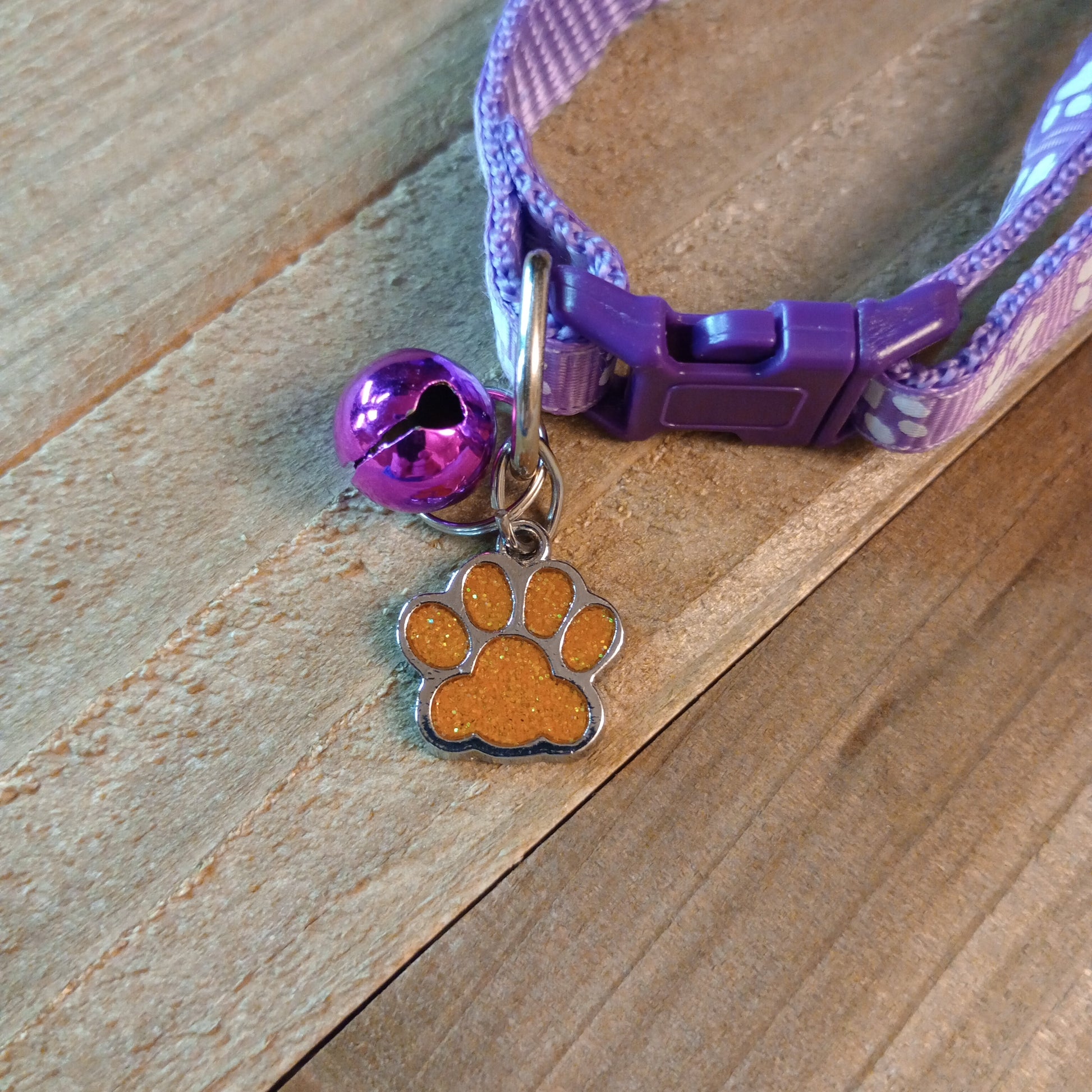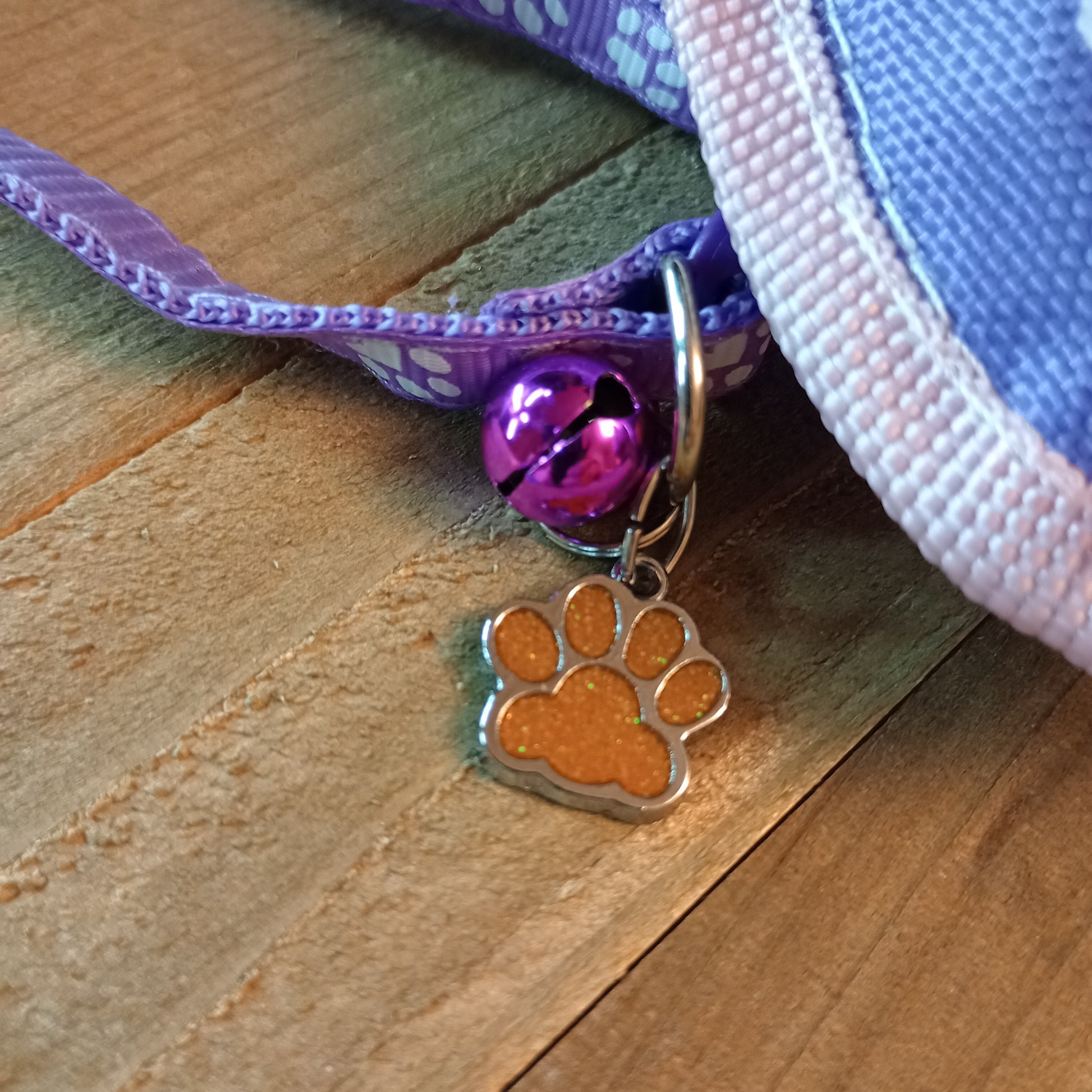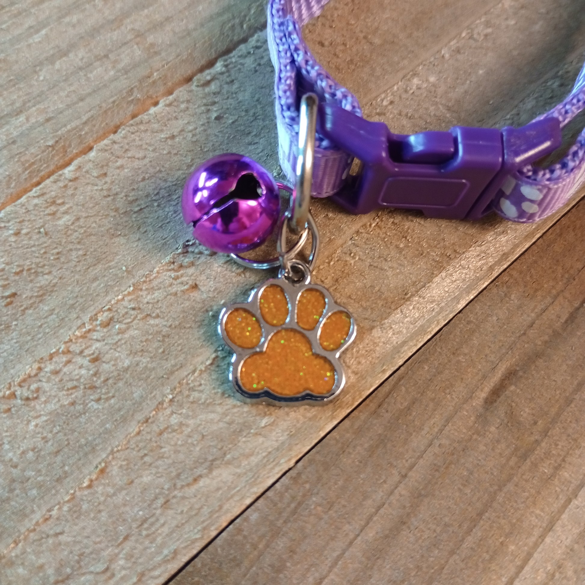 This Yellow Glitter Paw Pet Tag is 0.7 x 0.67 inches and made of metal alloy with an non-decorated silver colored back that allows for 1 line of text on the back.