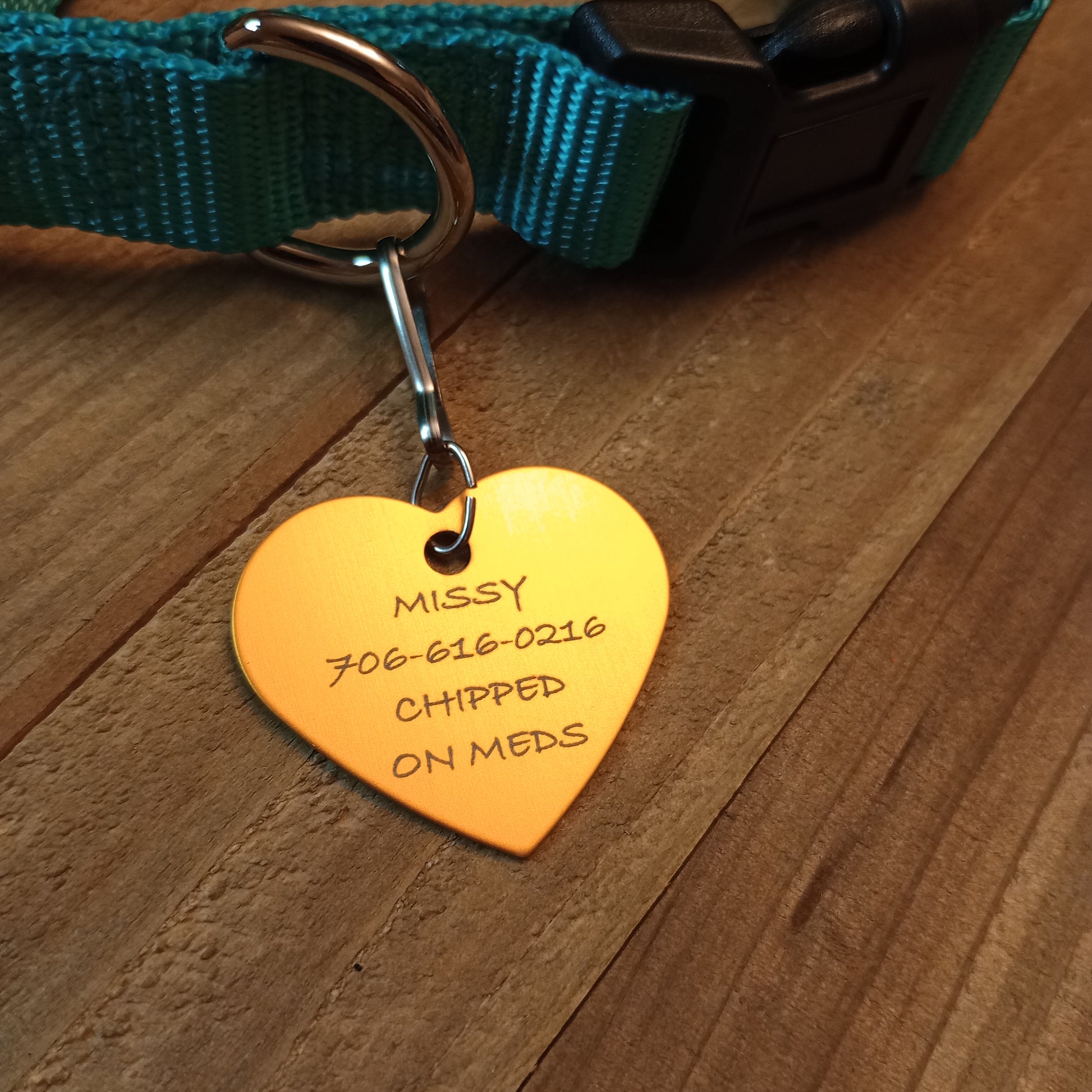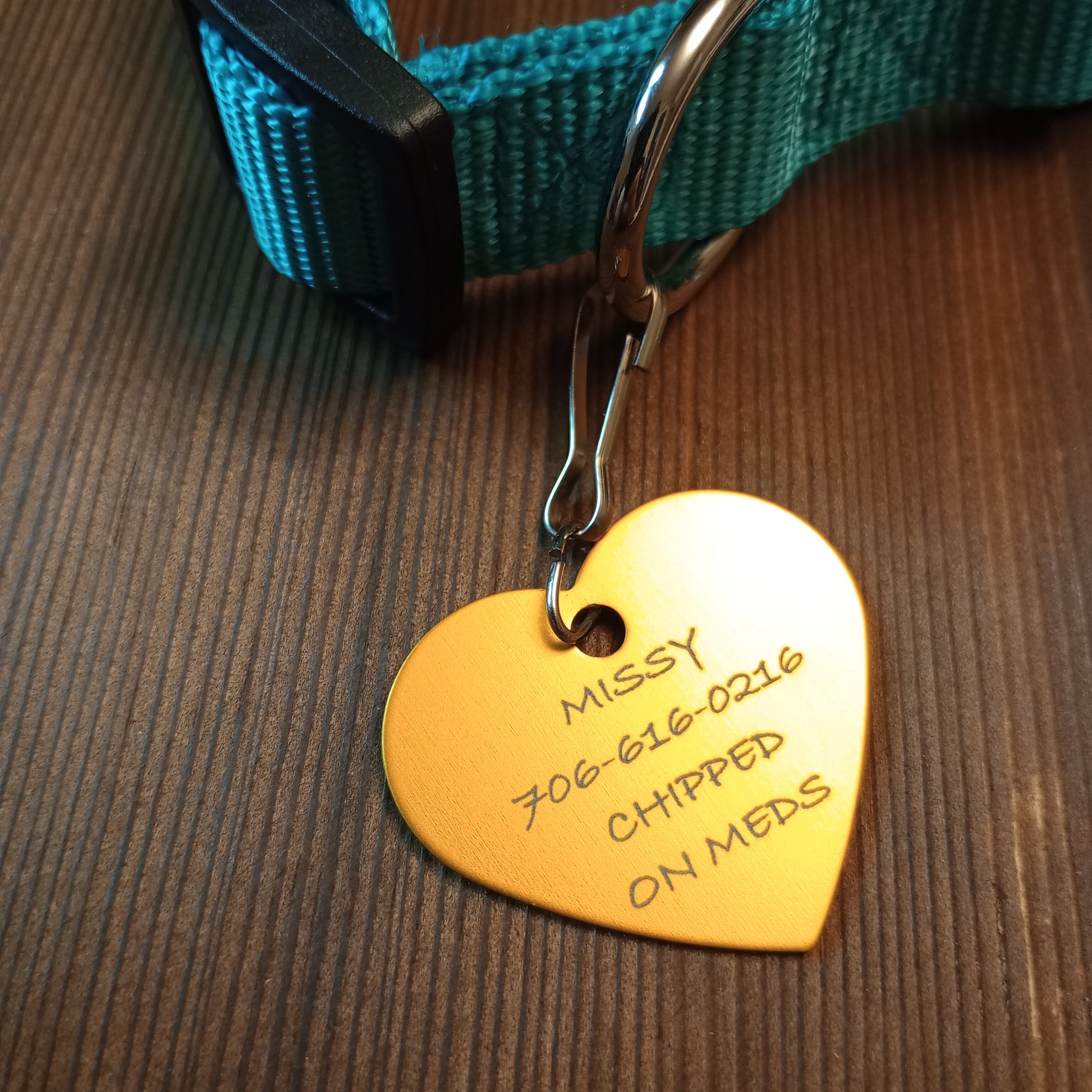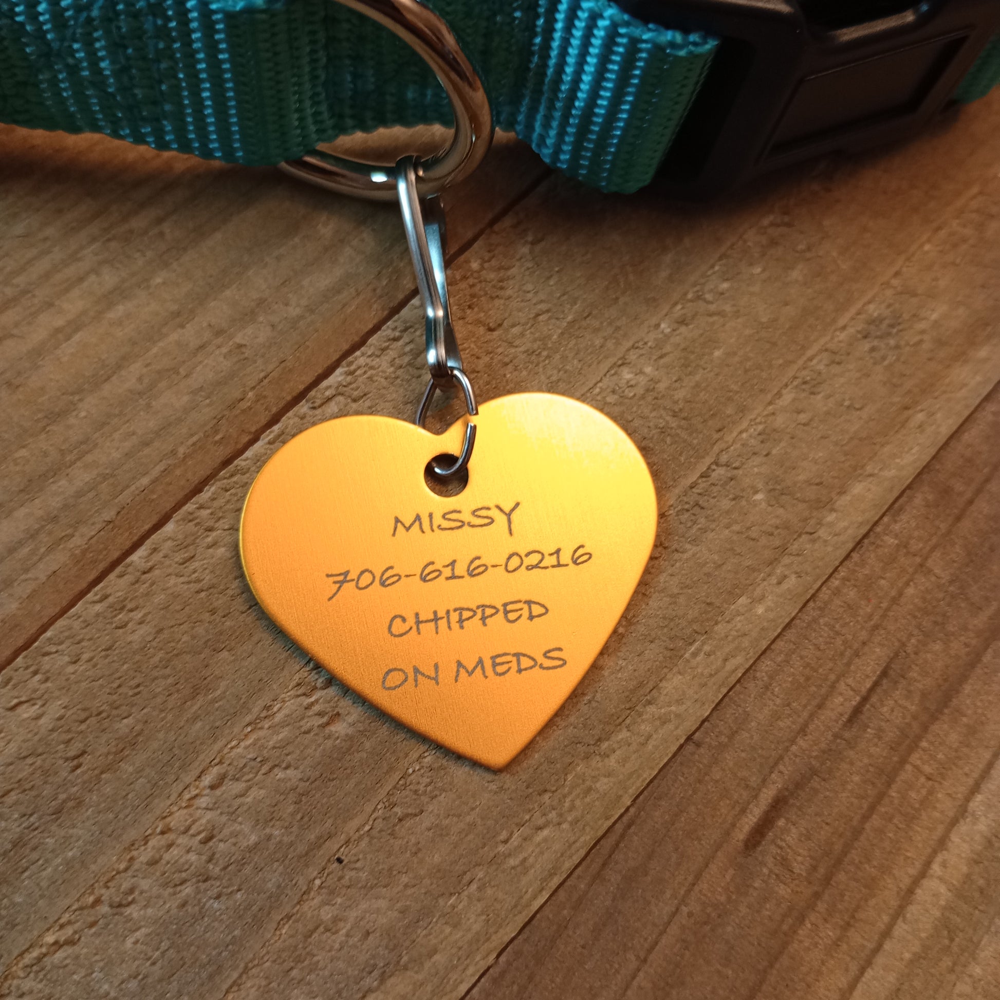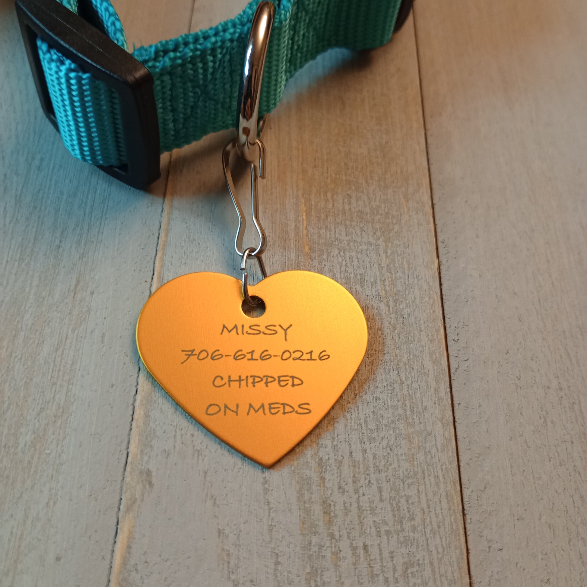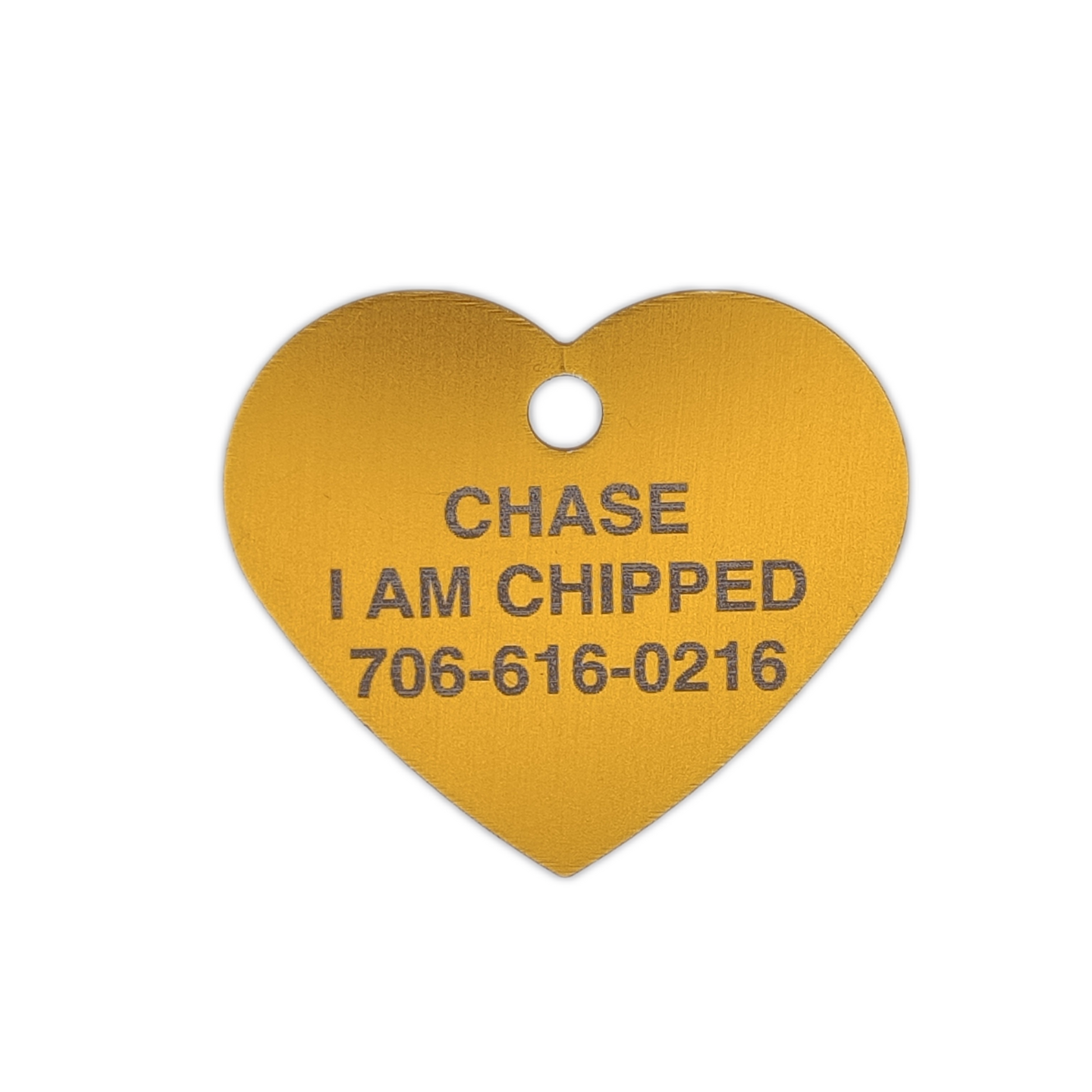 This Yellow Heart Shaped Pet Tag is anodized aluminum that allows for 4 lines of text to be engraved on the front and lines of text to be engraved on the back.