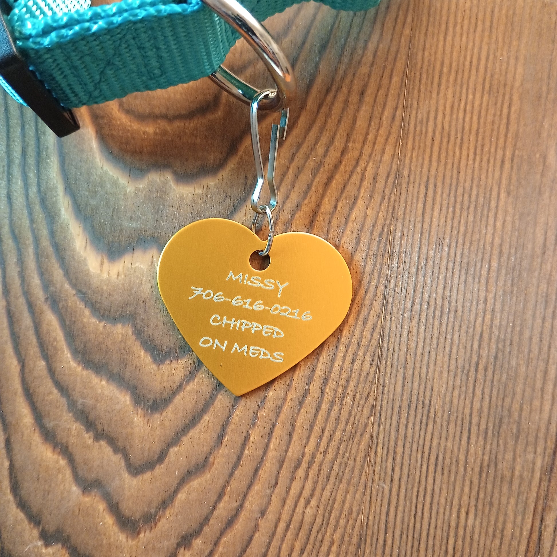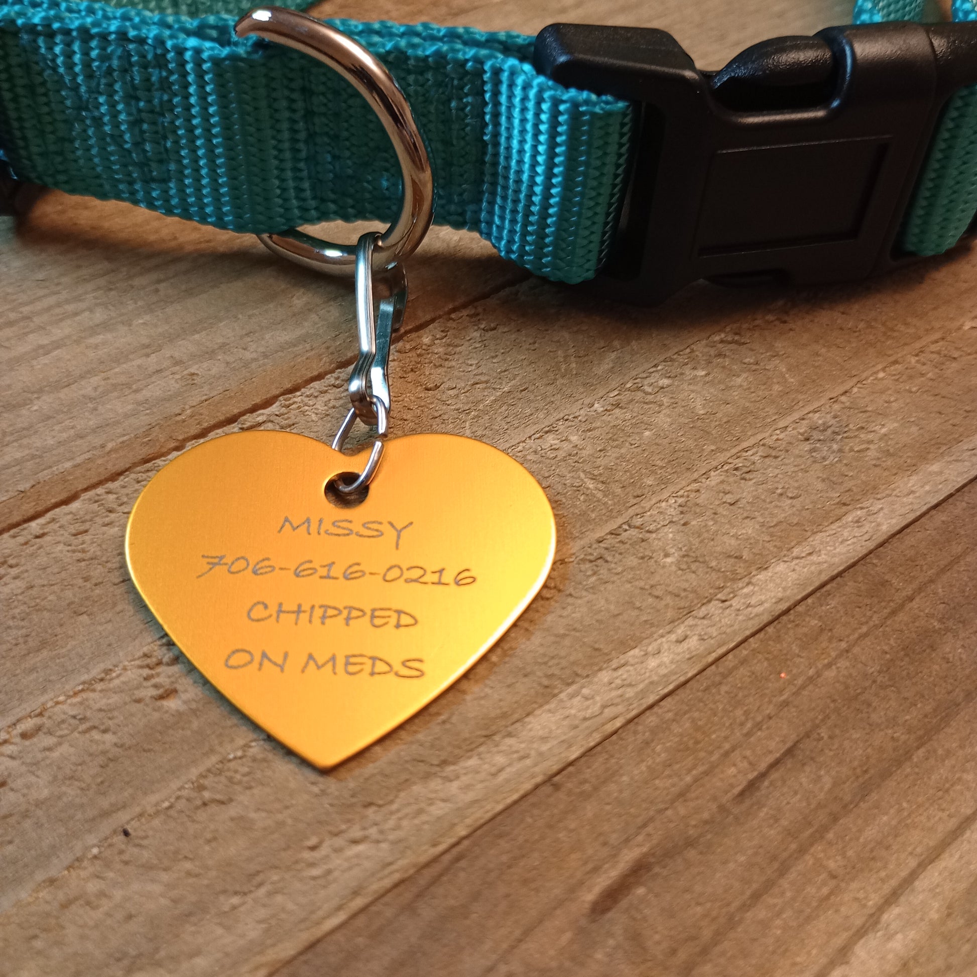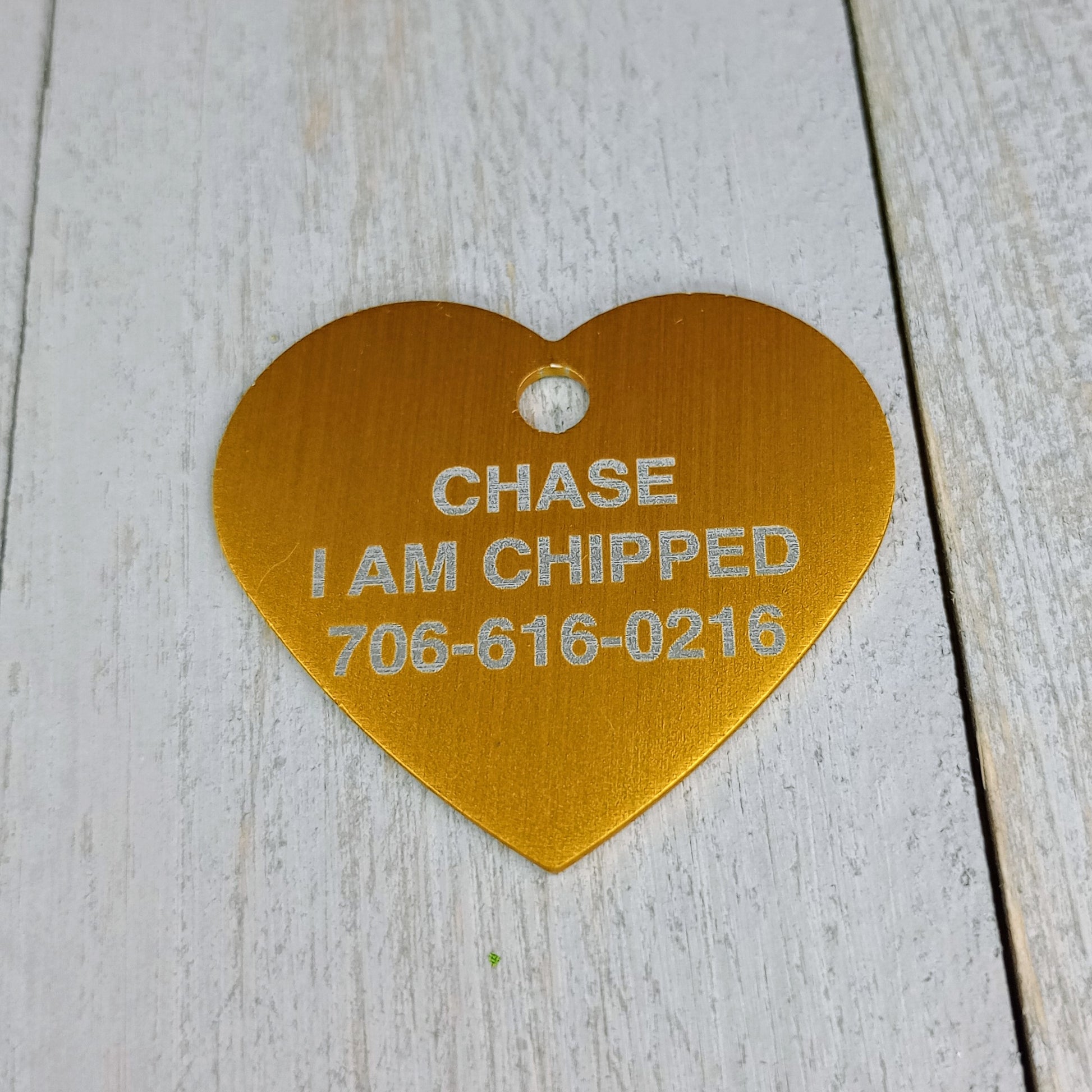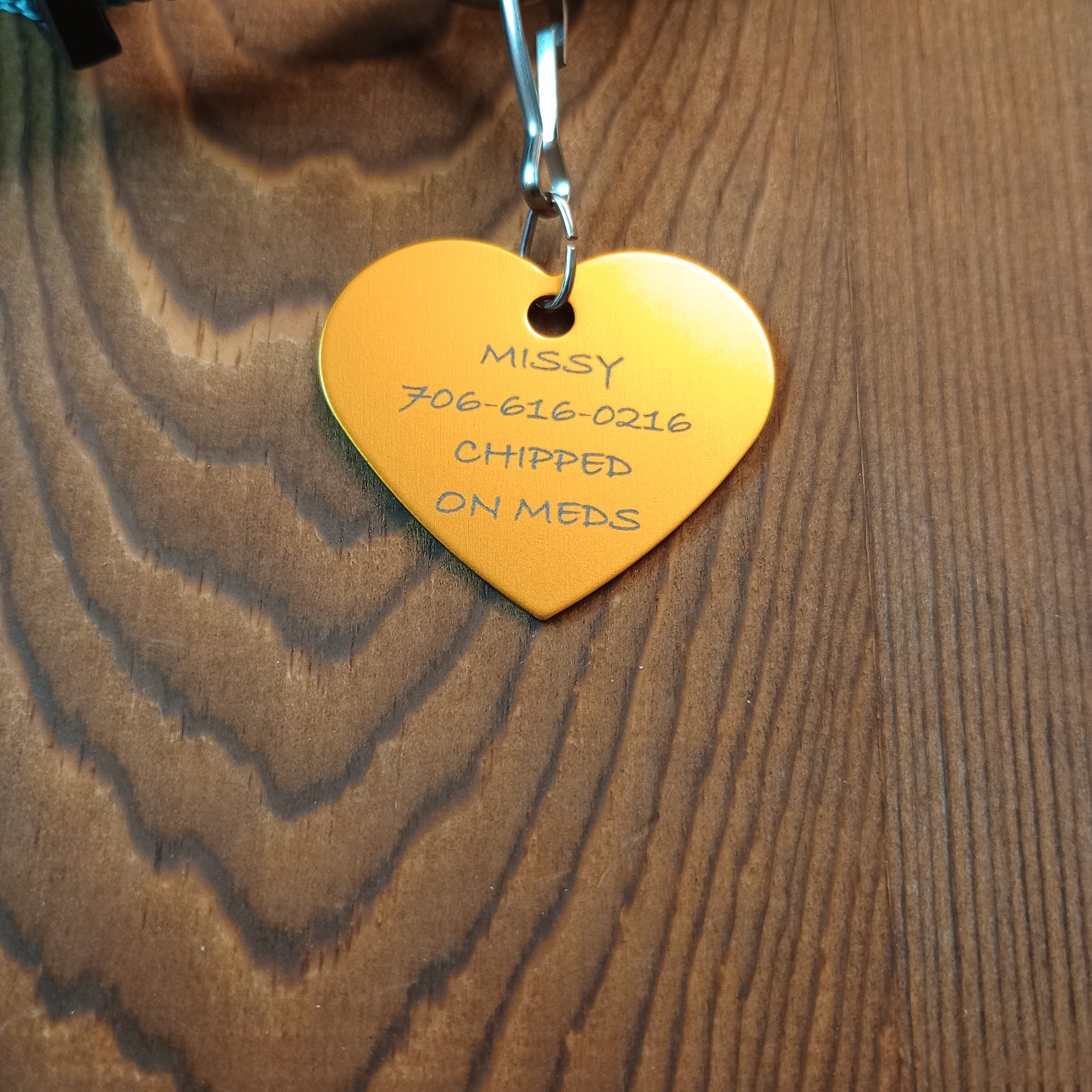 This Yellow Heart Shaped Pet Tag is anodized aluminum that allows for 4 lines of text to be engraved on the front and lines of text to be engraved on the back.