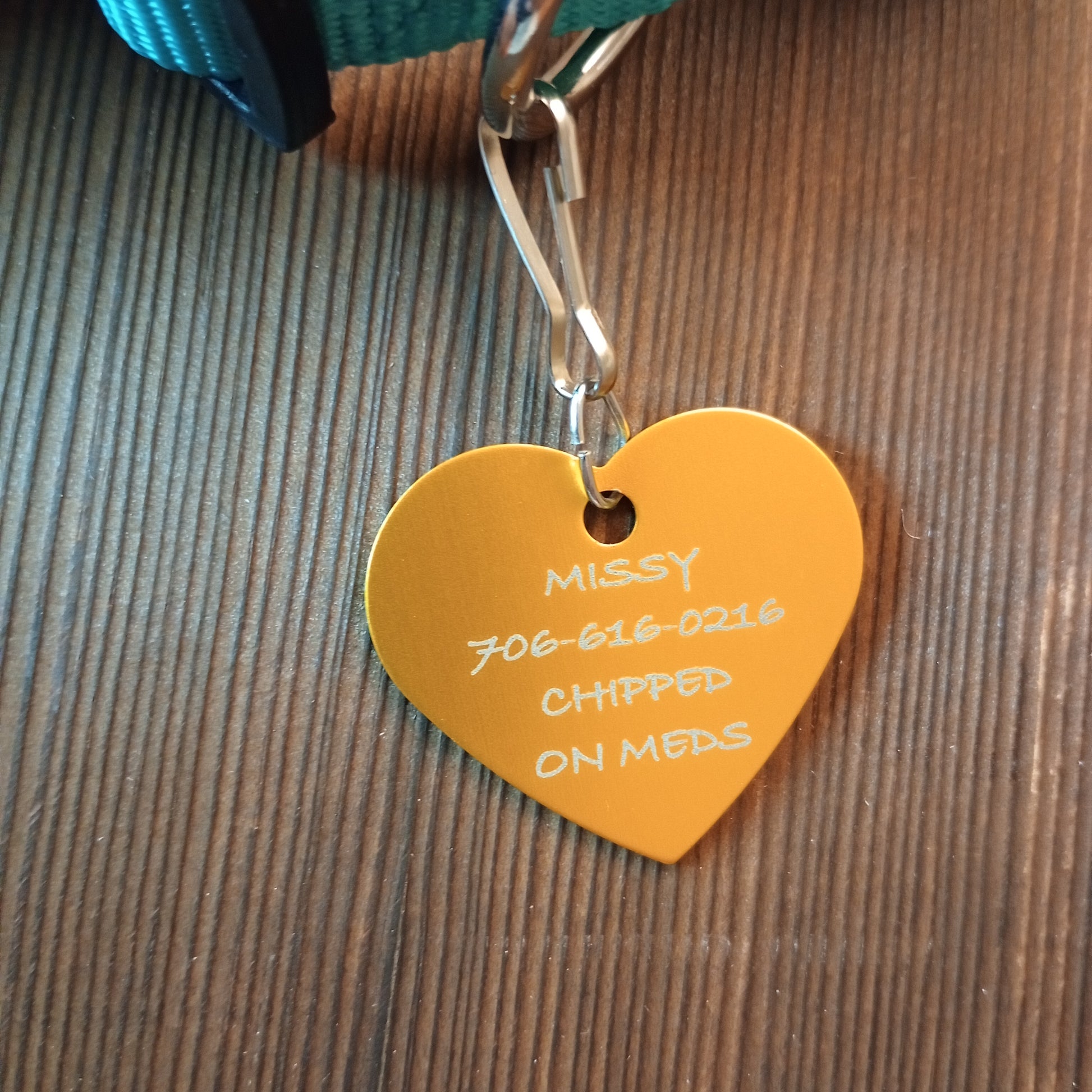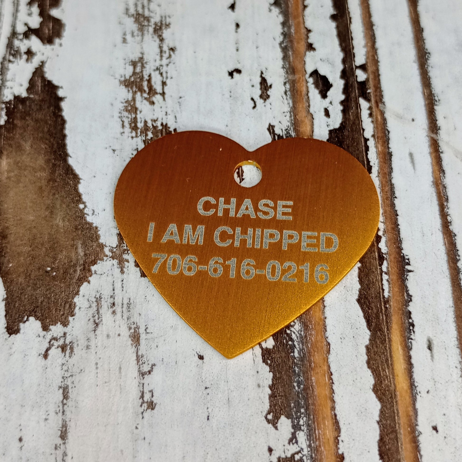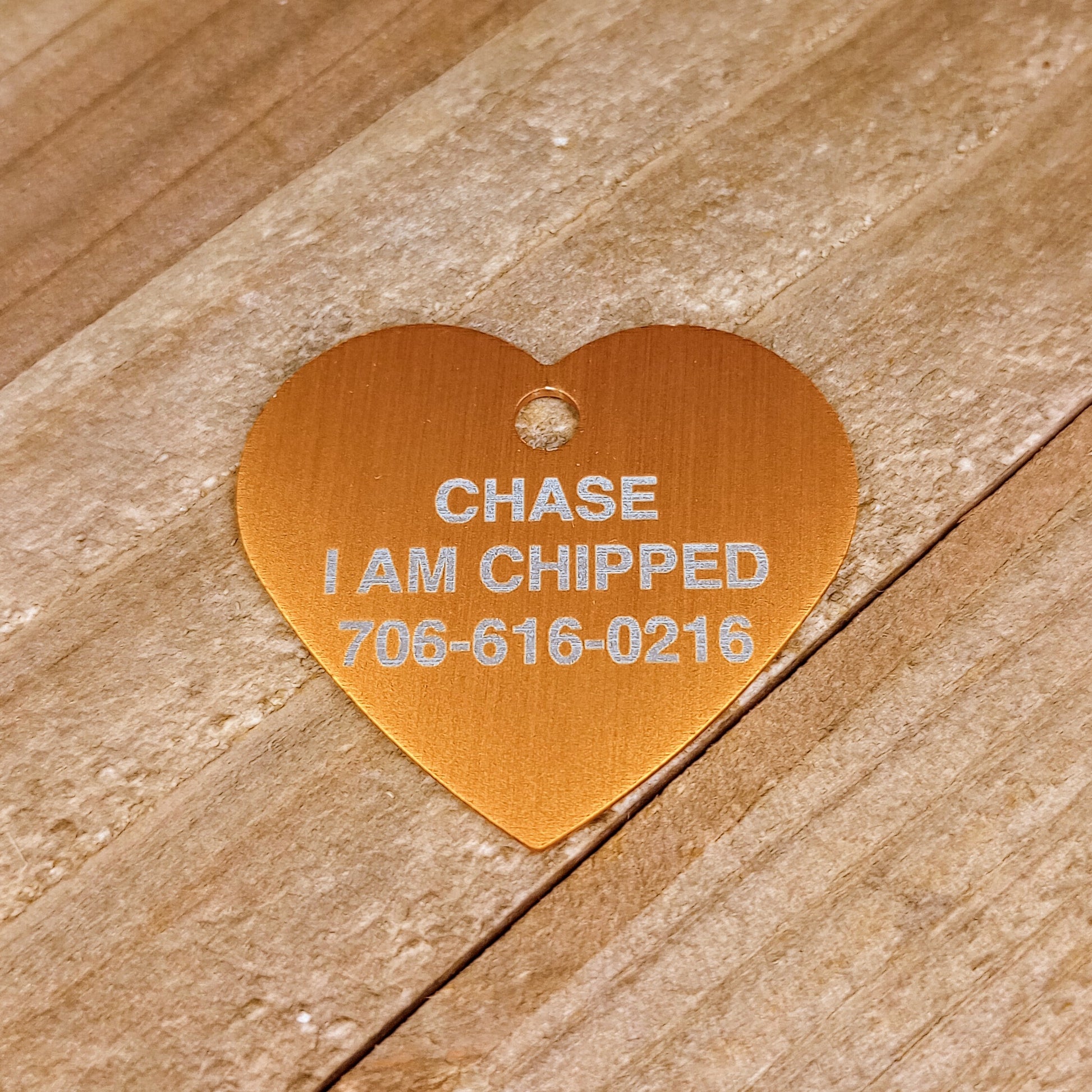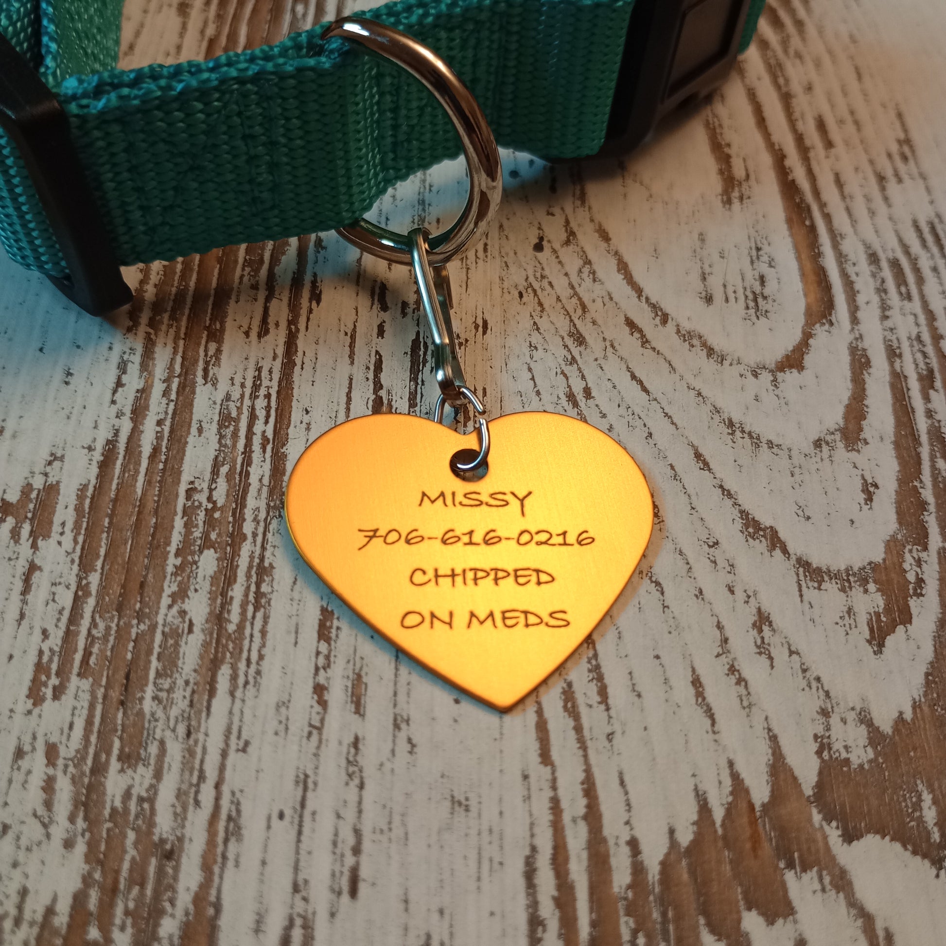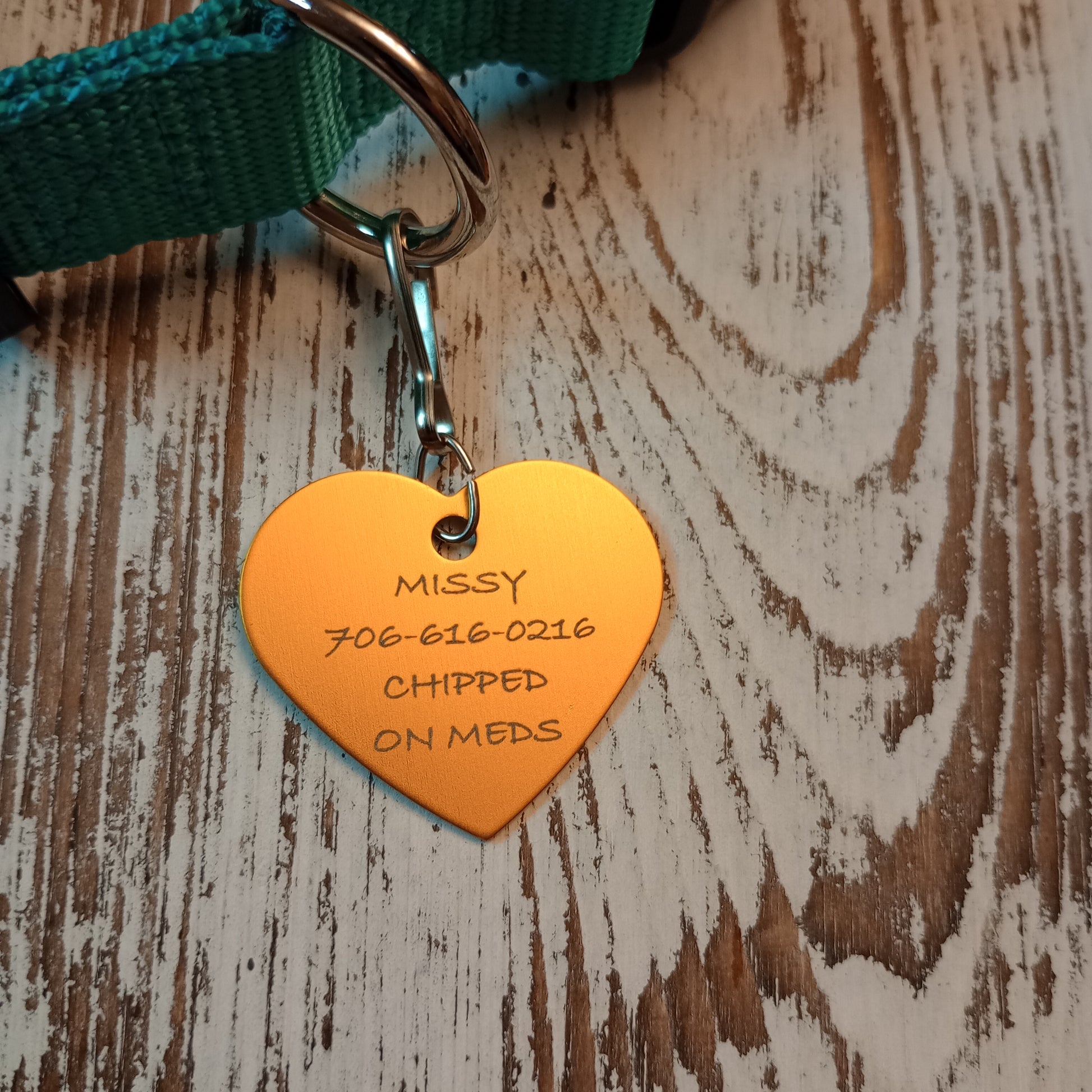 This Yellow Heart Shaped Pet Tag is anodized aluminum that allows for 4 lines of text to be engraved on the front and lines of text to be engraved on the back.