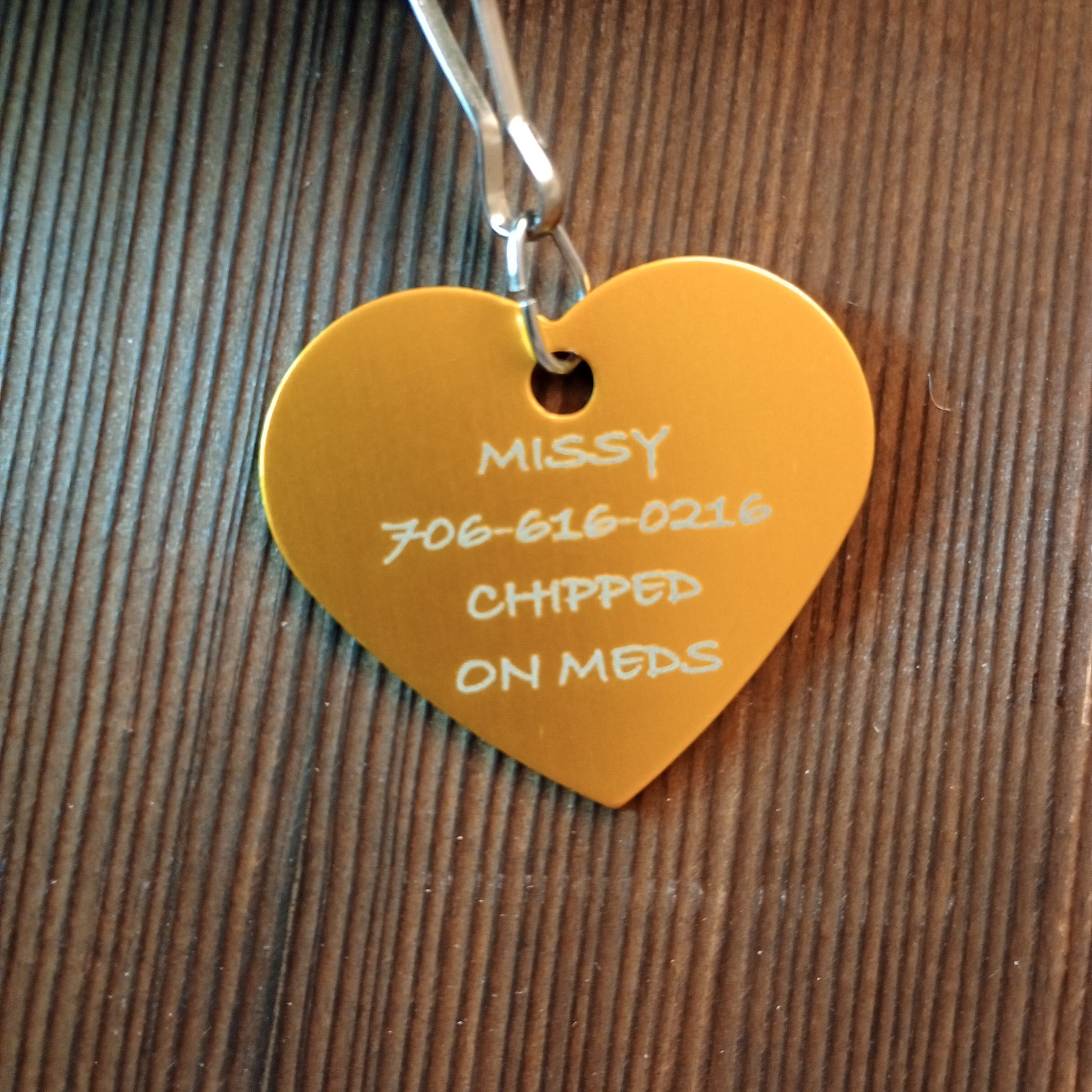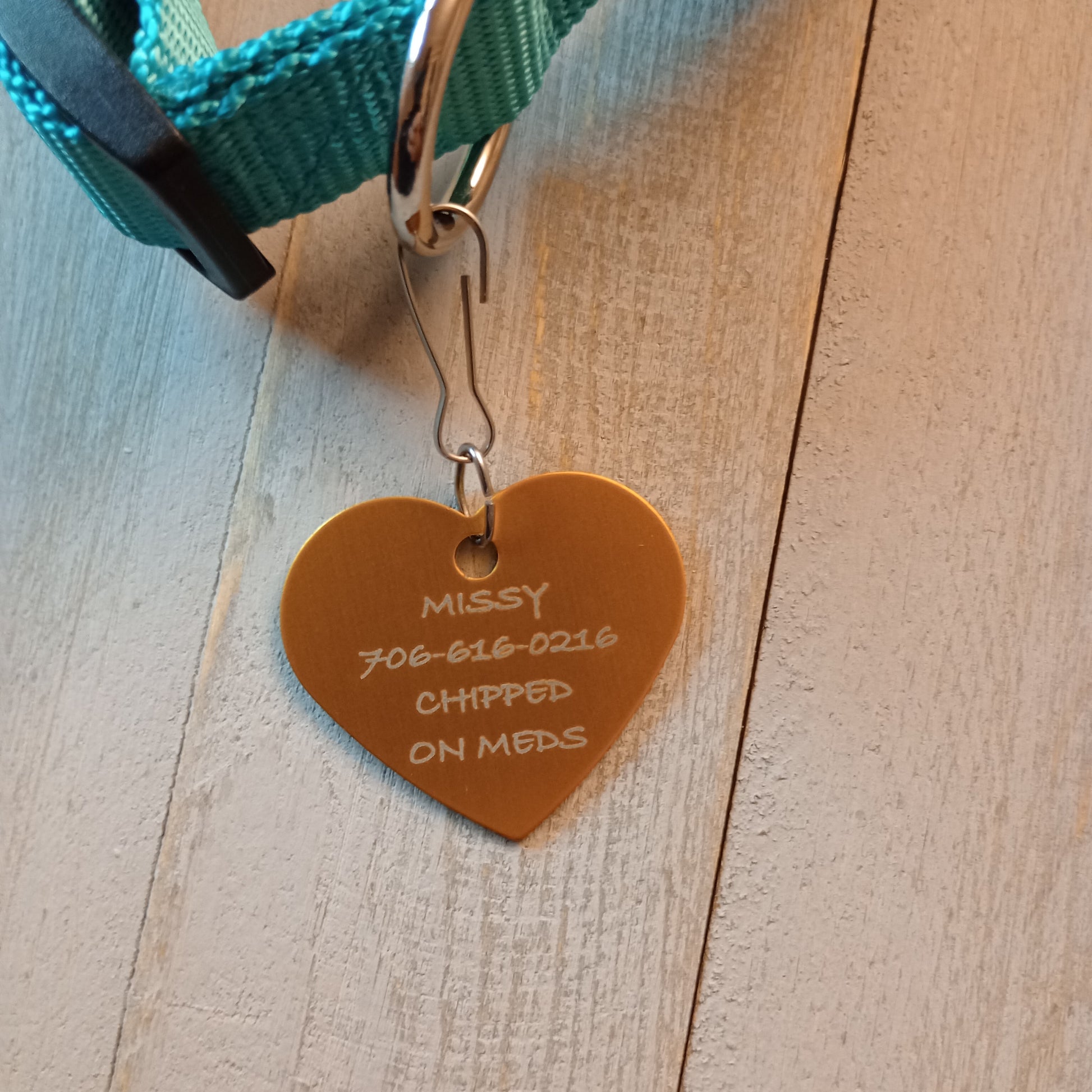 Maximum text limits: If you have more text that you would like to fit on the tag than the online store allows for the customization, reach out to us using the contact page at the top of the site. The limits are typically set so that the text can look good based on the engravable area for the pet tag. In most cases, we can add a lot more text, but the size of the text will have to decrease due to the engravable space.