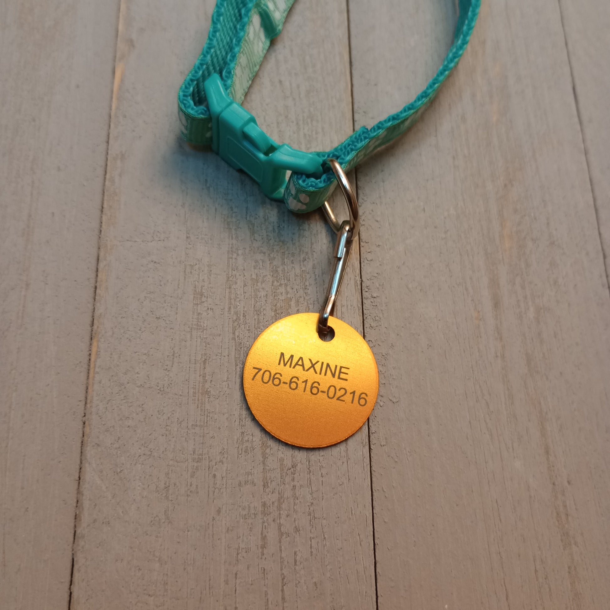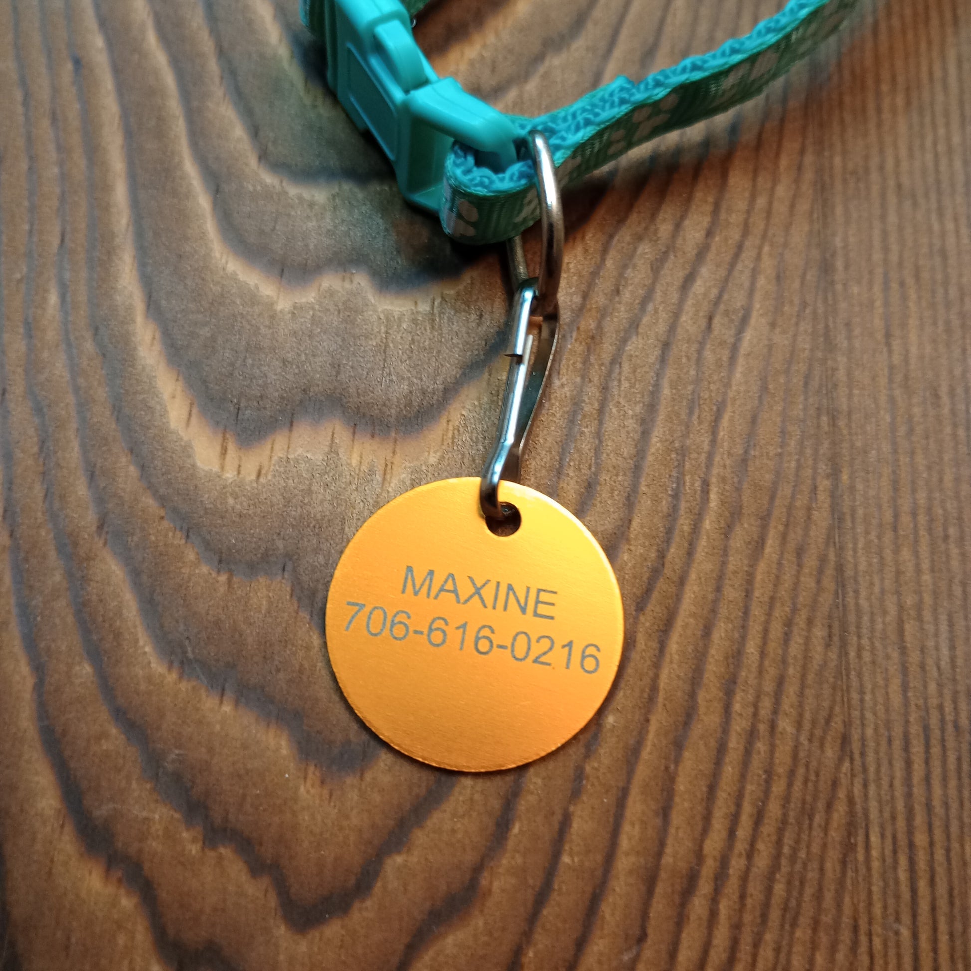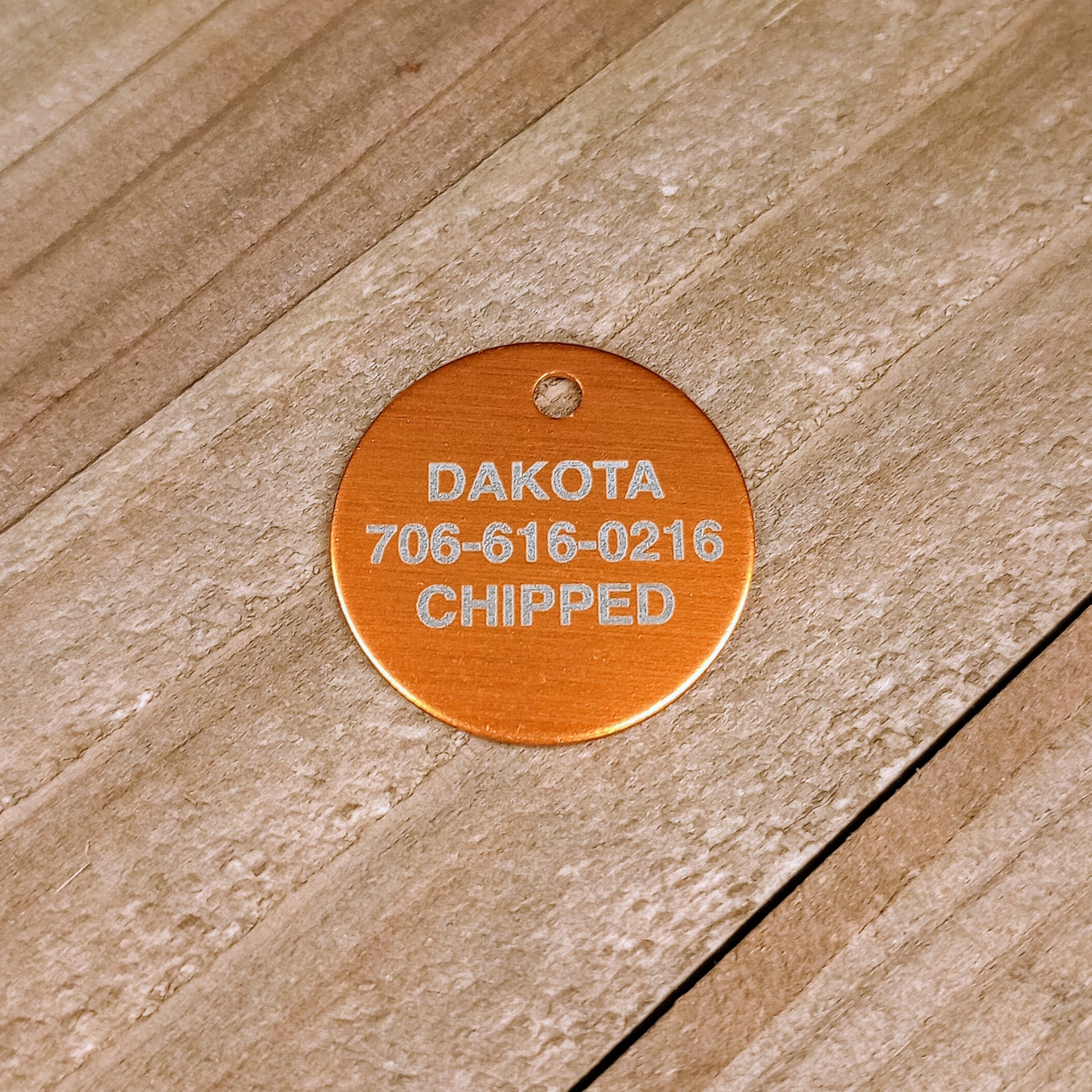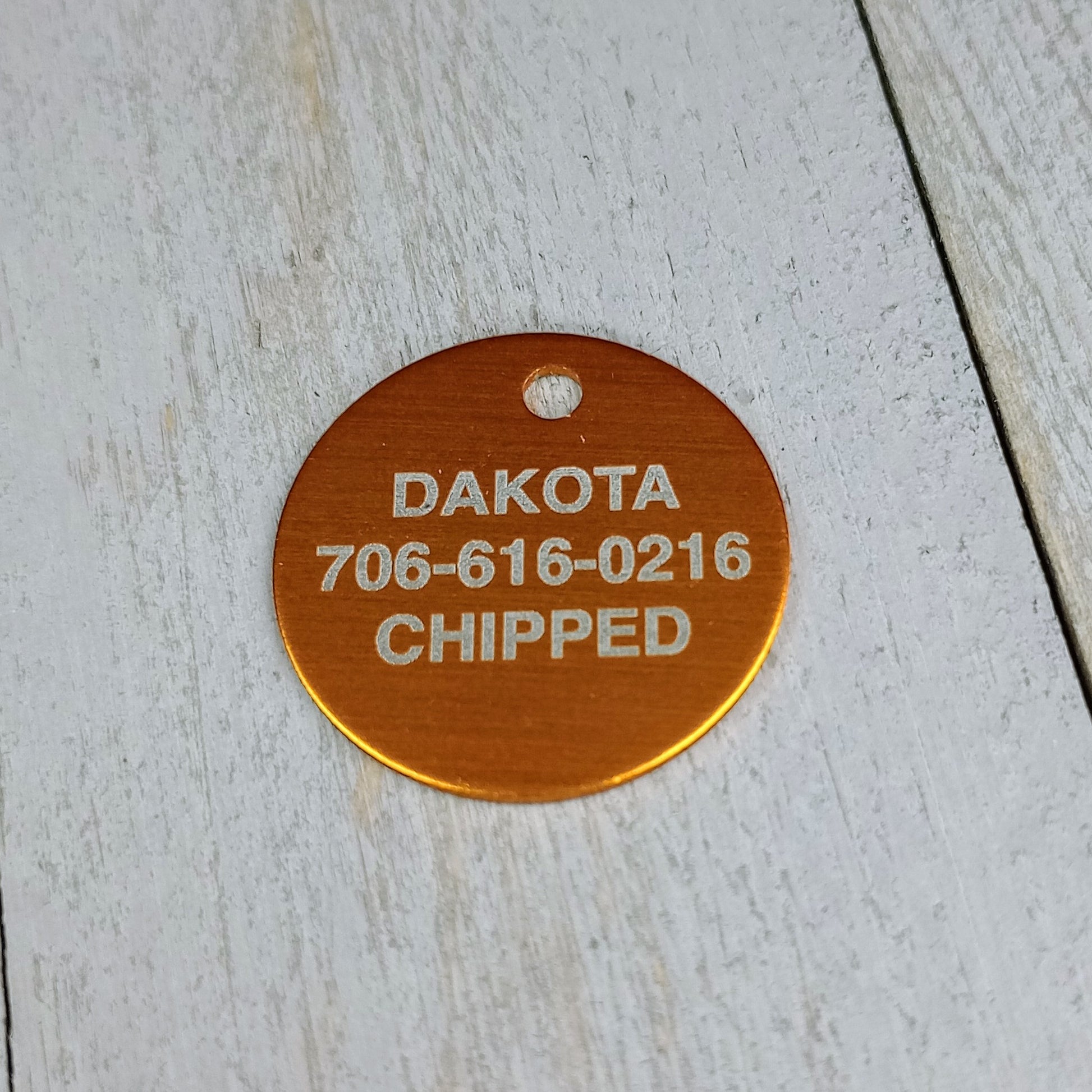 This Yellow Round Pet Tag is anodized aluminum that allows for 4 lines of text to be engraved on the front and 4 lines of text to be engraved on the back.