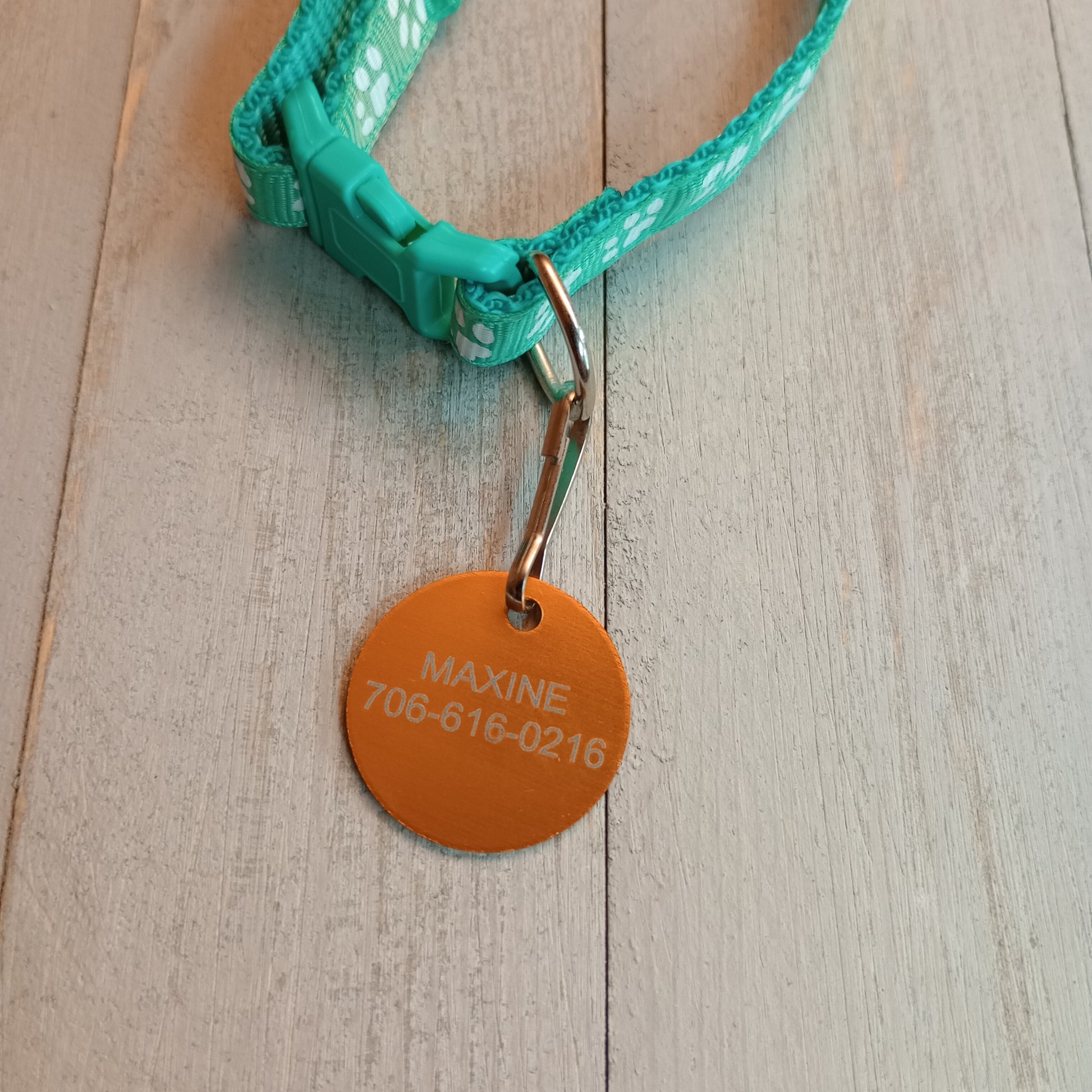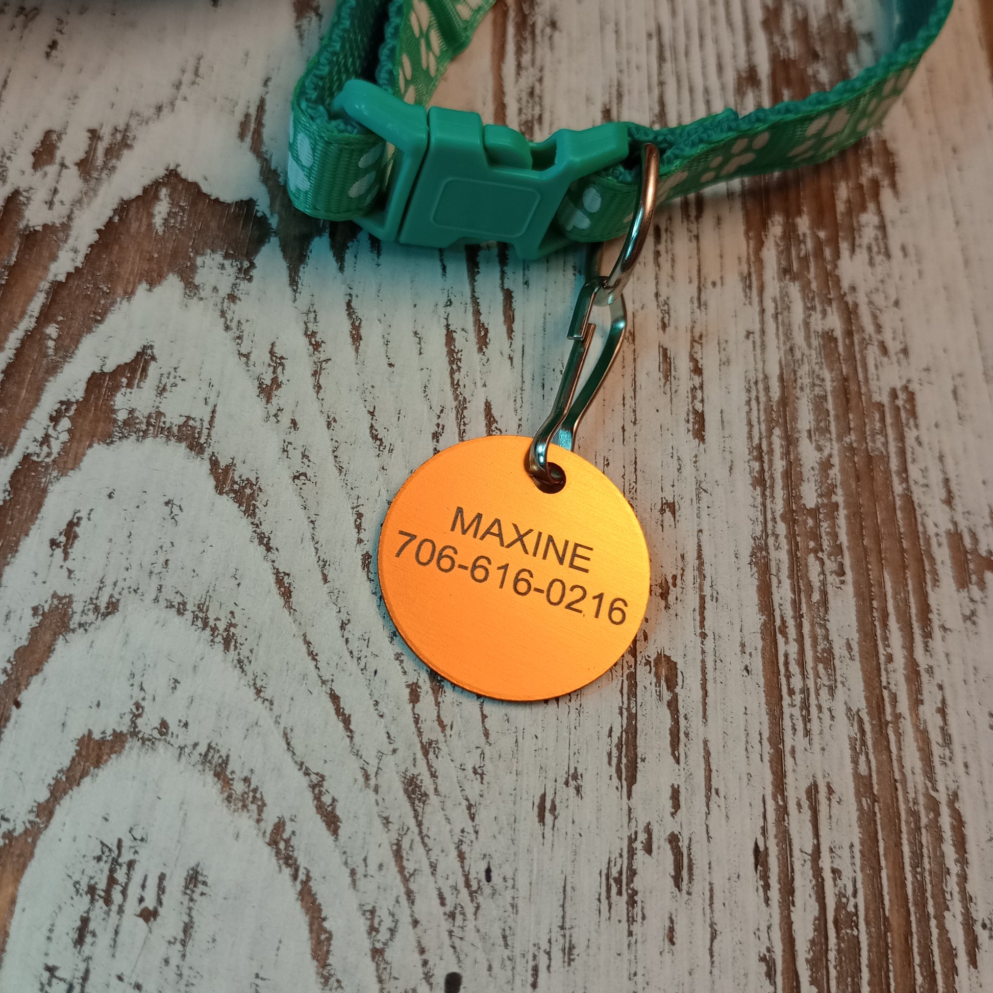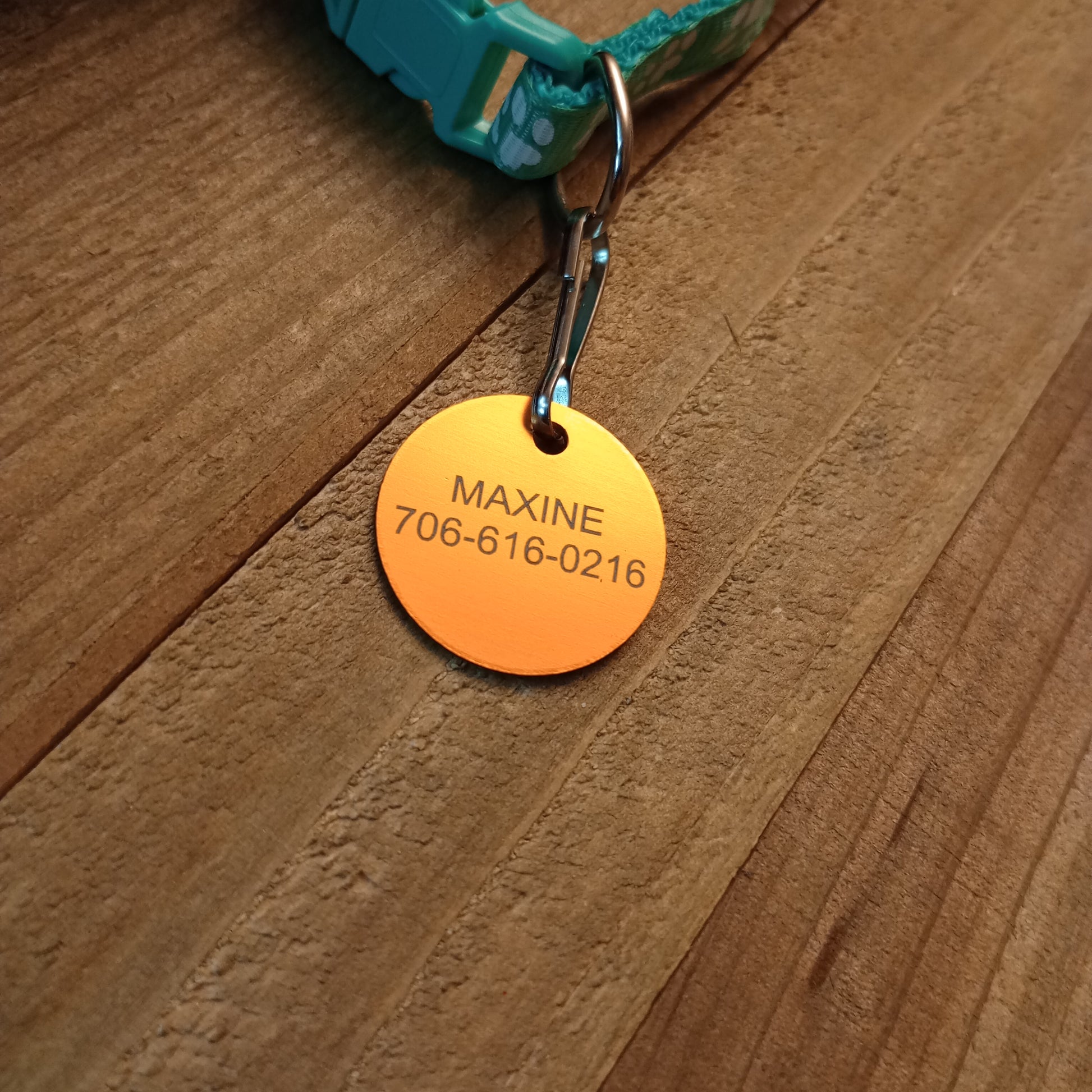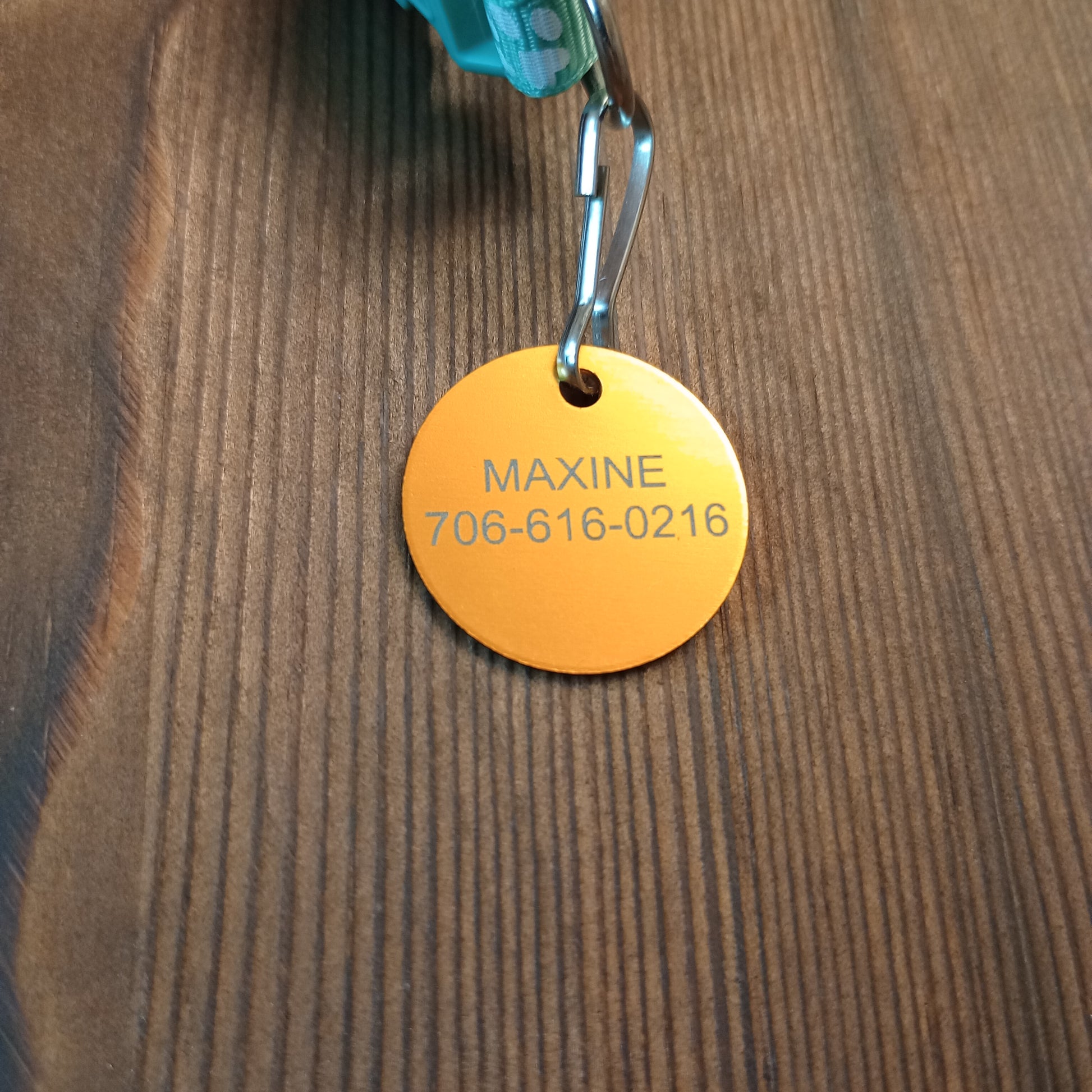 This Yellow Round Pet Tag is anodized aluminum that allows for 4 lines of text to be engraved on the front and 4 lines of text to be engraved on the back.