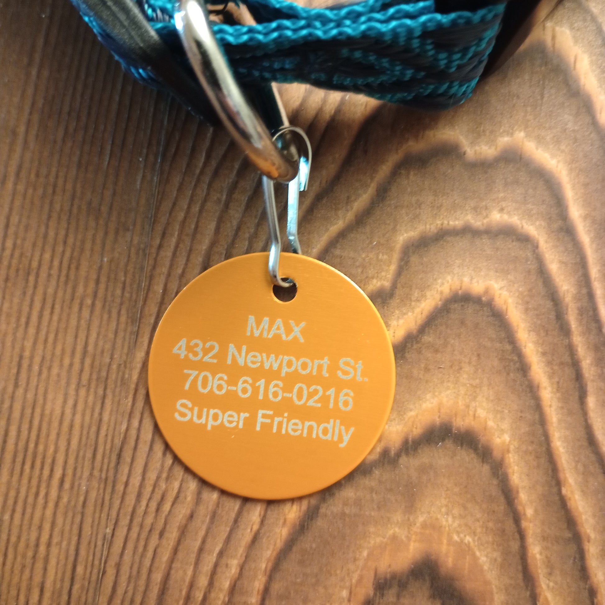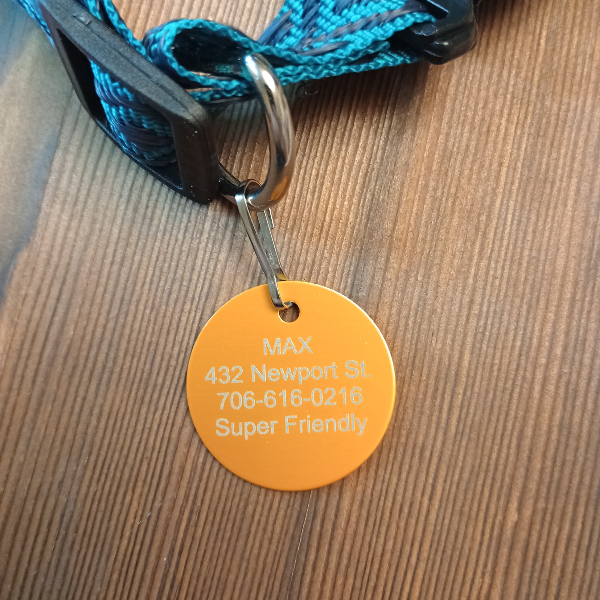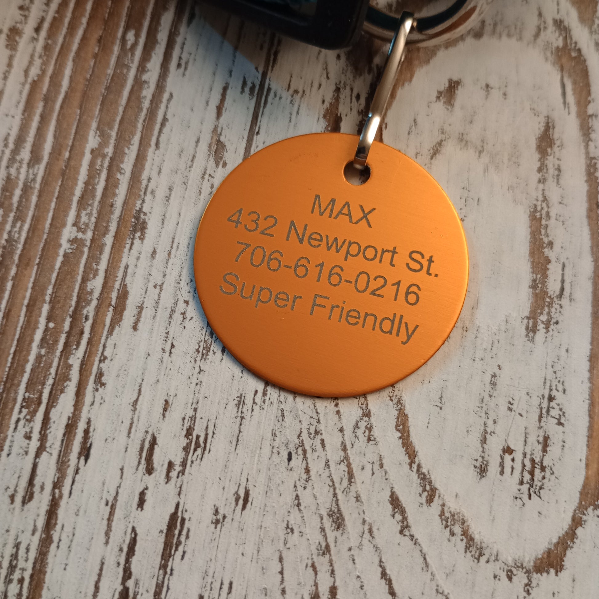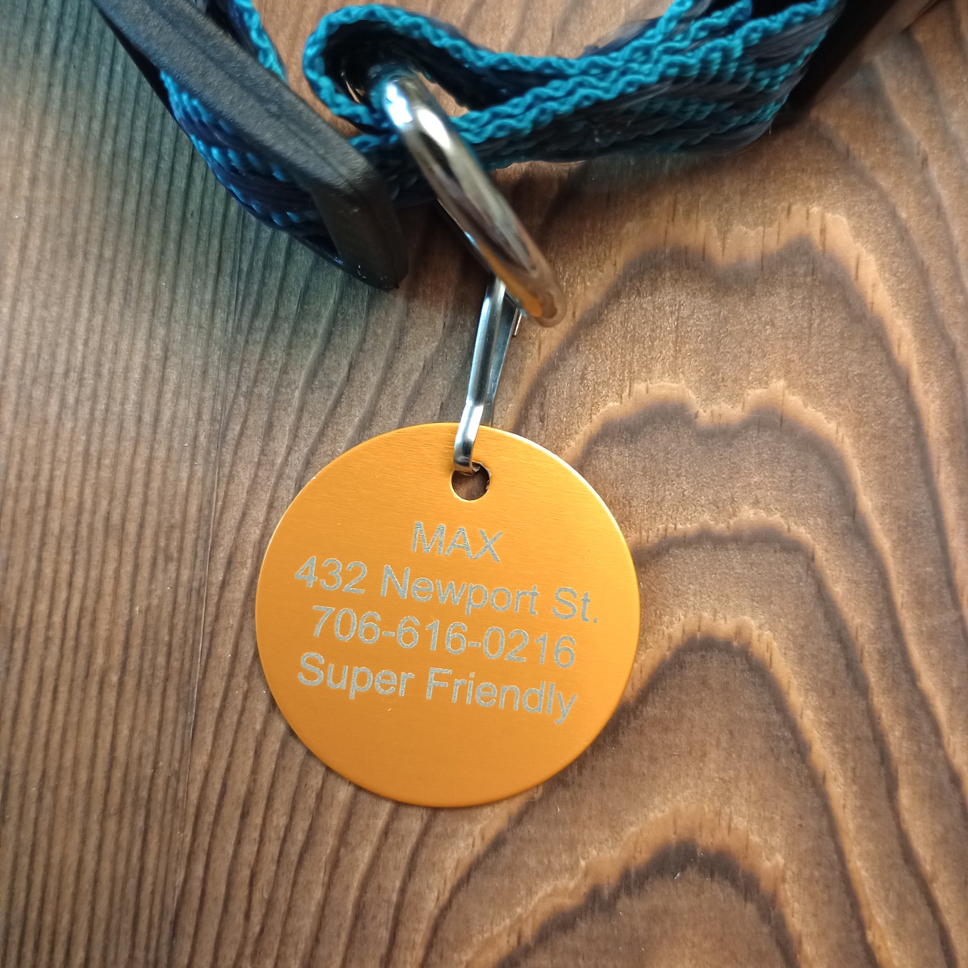 This Yellow Round Pet Tag is anodized aluminum that allows for 4 lines of text to be engraved on the front and 4 lines of text to be engraved on the back.
